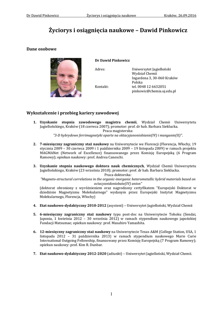 Dr Dawid Pinkowicz Życiorys i osiągnięcia naukowe Kraków, 26.09.2016 Życiorys i osiągnięcia naukowe – Dawid Pinkowicz Dane osobowe Dr Dawid Pinkowicz Adres: Uniwersytet Jagielloński Wydział Chemii Ingardena 3, 30-060 Kraków Polska tel. 0048 12 6632051 [email protected] Kontakt: Wykształcenie i przebieg kariery zawodowej 1. Uzyskanie stopnia zawodowego magistra chemii, Wydział Chemii Uniwersytetu Jagiellońskiego, Kraków (18 czerwca 2007); promotor: prof. dr hab. Barbara Sieklucka. Praca magisterska: "3-D hybrydowe ferrimagnetyki oparte na oktacyjanoniobianie(IV) i manganie(II)". 2. 7-miesięczny zagraniczny staż naukowy na Uniwersytecie we Florencji (Florencja, Włochy, 19 stycznia 2009 – 30 czerwca 2009 i 1 października 2009 – 19 listopada 2009) w ramach projektu MAGMANet (Network of Excellence) finansowanego przez Komisję Europejską (6 Program Ramowy); opiekun naukowy: prof. Andrea Caneschi. 3. Uzyskanie stopnia naukowego doktora nauk chemicznych, Wydział Chemii Uniwersytetu Jagiellońskiego, Kraków (23 września 2010); promotor: prof. dr hab. Barbara Sieklucka. Praca doktorska: "Magneto-structural correlations in the organic-inorganic heterometallic hybrid materials based on octacyanidoniobate(IV) anion" (doktorat obroniony z wyróżnieniem oraz nagrodzony certyfikatem "Europejski Doktorat w dziedzinie Magnetyzmu Molekularnego" wydanym przez Europejski Instytut Magnetyzmu Molekularnego, Florencja, Włochy) 4. Etat naukowo-dydaktyczny 2010-2012 (asystent) – Uniwersytet Jagielloński, Wydział Chemii 5. 6-miesięczny zagraniczny staż naukowy typu post-doc na Uniwersytecie Tohoku (Sendai, Japonia, 1 kwietnia 2012 – 30 września 2012) w ramach stypendium naukowego japońskiej Fundacji Matsumae; opiekun naukowy: prof. Masahiro Yamashita. 6. 12-miesięczny zagraniczny staż naukowy na Uniwersytecie Texas A&M (College Station, USA, 1 listopada 2012 – 31 października 2013) w ramach stypendium naukowego Marie Curie International Outgoing Fellowship, finansowany przez Komisję Europejską (7 Program Ramowy); opiekun naukowy: prof. Kim R. Dunbar. 7. Etat naukowo-dydaktyczny 2012-2020 (adiunkt) – Uniwersytet Jagielloński, Wydział Chemii. 1 Dr Dawid Pinkowicz Życiorys i osiągnięcia naukowe Kraków, 26.09.2016 Informacja o realizowanych/zakończonych projektach badawczych 1. Projekt MAGMANet finansowany przez Komisję Europejską w 6 Programie Ramowym, numer kontraktu NMP-3-CT-2005 515767; projekt zakończony; wykonawca 2. Projekt promotorski „Korelacje magneto-strukturalne w organiczno-nieorganicznych heterometalicznych materiałach hybrydowych opartych na oktacyjanoniobianie” realizowany ze środków MNiSW, opiekun naukowy: prof. Barbara Sieklucka; projekt zakończony; wykonawca – autor projektu 3. Projekt badawczy własny, numer: 1535/B/H03/2009/36 finansowany przez Ministerstwo Nauki i Szkolnictwa Wyższego w latach 2009-2012 „Funkcjonalne materiały molekularne z mostkami cyjanowymi” realizowany w Zespole Nieorganicznych Materiałów Molekularnych na Wydziale Chemii Uniwersytetu Jagiellońskiego; projekt zakończony; wykonawca 4. Projekt badawczy Opus, numer: 2011/01/B/ST5/00716 finansowany przez Narodowe Centrum Nauki w latach 2011-2014 „Projektowanie i funkcjonalizacja hybrydowych polimerów koordynacyjnych” realizowany w Zespole Nieorganicznych Materiałów Molekularnych na Wydziale Chemii Uniwersytetu Jagiellońskiego; projekt zakończony; wykonawca 5. Projekt badawczy finansowany z dotacji statutowej Ministerstwa Nauki i Szkolnictwa Wyższego w roku 2011 przeznaczonej dla młodych naukowców „Magnetyczne Hybrydowe Materiały Molekularne” realizowany w Zespole Nieorganicznych Materiałów Molekularnych na Wydziale Chemii Uniwersytetu Jagiellońskiego; projekt zakończony; kierownik i wykonawca 6. Projekt badawczy „Photoswitchable Single-Molecule Quantum Magnets” realizowany w ramach 6miesięcznego stypendium zagranicznego typu „post-doc”, Tohoku University, Sendai, Japonia, opiekun: prof. Masahiro Yamashita. Projekt finansowany przez Międzynarodową Fundację Matsumae (2012); projekt zakończony; post-doc – wykonawca – autor projektu 7. Projekt badawczy „Multifunctional Molecular Magnets through Cyanide Chemistry” (MultiCyChem, nr 298569) realizowany w ramach stypendium zagranicznego Marie Curie International Outgoing Fellowship (typu „post-doc”) w Stanach Zjednoczonych pod opieką prof. Kim Dunbar (Texas A&M University) i w Polsce pod opieką prof. Barbary Siekluckiej (Uniwersytet Jagielloński). Projekt finansowany przez Komisję Europejską w 7. Programie Ramowym (2012-2014); projekt zakończony; post-doc – wykonawca – autor projektu 8. Projekt badawczy Preludium „Poszukiwanie parametrów pozwalających na optymalizację relaksacji magnetycznych w molekularnych magnetykach”, numer: 2013/11/N/ST4/01860, finansowany przez Narodowe Centrum Nauki w latach 2014-2017; projekt w realizacji; wykonawca 9. Projekt badawczy „Od magnetycznych polimerów koordynacyjnych do nanomagnesów kwantowych”, numer: 0370/IP3/2015/73, realizowany w ramach Programu MNiSW Iuventus Plus w latach 2015-2017; projekt w realizacji; kierownik – autor projektu 10. Projekt badawczy Opus 8 „Poszukiwanie multifunkcjonalnych magnesów molekularnych”, numer: 2014/15/B/ST5/04465, finansowany przez Narodowe Centrum Nauki w latach 2015-2018; projekt w realizacji; wykonawca – współautor projektu 11. Projekt badawczy „Elektroaktywne ligandy dioksotiadiazolowe w konstrukcji multifunkcjonalnych magnesów molekularnych” realizowany w ramach programu MNiSW Diamentowy Grant w latach 2015-2019; projekt w realizacji; opiekun naukowy 2 Dr Dawid Pinkowicz Życiorys i osiągnięcia naukowe Kraków, 26.09.2016 12. Projekt badawczy Sonata Bis 4 „Nanoprzestrzenna inżynieria krystaliczna nowych rozgałęzionych magnetyków molekularnych” numer: 2014/14/E/ST5/00357, finansowany przez Narodowe Centrum Nauki w latach 2015-2020; projekt w