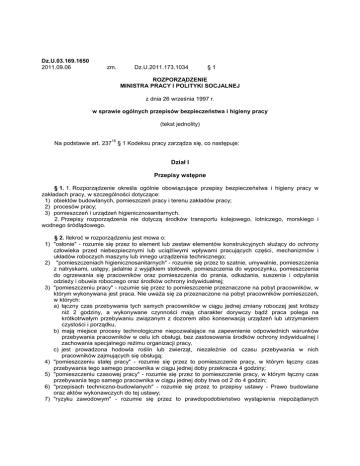 Dz.U.03.169.1650 2011.09.06 zm. Dz.U.2011.173.1034 §1 ROZPORZĄDZENIE MINISTRA PRACY I POLITYKI SOCJALNEJ z dnia 26 września 1997 r. w sprawie ogólnych przepisów bezpieczeństwa i higieny pracy (tekst jednolity) Na podstawie art. 237 15 § 1 Kodeksu pracy zarządza się, co następuje: Dział I Przepisy wstępne § 1. 1. Rozporządzenie określa ogólnie obowiązujące przepisy bezpieczeństwa i higieny pracy w zakładach pracy, w szczególności dotyczące: 1) obiektów budowlanych, pomieszczeń pracy i terenu zakładów pracy; 2) procesów pracy; 3) pomieszczeń i urządzeń higienicznosanitarnych. 2. Przepisy rozporządzenia nie dotyczą środków transportu kolejowego, lotniczego, morskiego i wodnego śródlądowego. § 2. Ilekroć w rozporządzeniu jest mowa o: 1) "osłonie" - rozumie się przez to element lub zestaw elementów konstrukcyjnych służący do ochrony człowieka przed niebezpiecznymi lub uciążliwymi wpływami pracujących części, mechanizmów i układów roboczych maszyny lub innego urządzenia technicznego; 2) "pomieszczeniach higienicznosanitarnych" - rozumie się przez to szatnie, umywalnie, pomieszczenia z natryskami, ustępy, jadalnie z wyjątkiem stołówek, pomieszczenia do wypoczynku, pomieszczenia do ogrzewania się pracowników oraz pomieszczenia do prania, odkażania, suszenia i odpylania odzieży i obuwia roboczego oraz środków ochrony indywidualnej; 3) "pomieszczeniu pracy" - rozumie się przez to pomieszczenie przeznaczone na pobyt pracowników, w którym wykonywana jest praca. Nie uważa się za przeznaczone na pobyt pracowników pomieszczeń, w których: a) łączny czas przebywania tych samych pracowników w ciągu jednej zmiany roboczej jest krótszy niż 2 godziny, a wykonywane czynności mają charakter dorywczy bądź praca polega na krótkotrwałym przebywaniu związanym z dozorem albo konserwacją urządzeń lub utrzymaniem czystości i porządku, b) mają miejsce procesy technologiczne niepozwalające na zapewnienie odpowiednich warunków przebywania pracowników w celu ich obsługi, bez zastosowania środków ochrony indywidualnej i zachowania specjalnego reżimu organizacji pracy, c) jest prowadzona hodowla roślin lub zwierząt, niezależnie od czasu przebywania w nich pracowników zajmujących się obsługą; 4) "pomieszczeniu stałej pracy" - rozumie się przez to pomieszczenie pracy, w którym łączny czas przebywania tego samego pracownika w ciągu jednej doby przekracza 4 godziny; 5) "pomieszczeniu czasowej pracy" - rozumie się przez to pomieszczenie pracy, w którym łączny czas przebywania tego samego pracownika w ciągu jednej doby trwa od 2 do 4 godzin; 6) "przepisach techniczno-budowlanych" - rozumie się przez to przepisy ustawy - Prawo budowlane oraz aktów wykonawczych do tej ustawy; 7) "ryzyku zawodowym" - rozumie się przez to prawdopodobieństwo wystąpienia niepożądanych 7a) 7b) 8) 9) 10) 11) 12) 13) 14) 15) 16) 17) 18) zdarzeń związanych z wykonywaną pracą, powodujących straty, w szczególności wystąpienia u pracowników niekorzystnych skutków zdrowotnych w wyniku zagrożeń zawodowych występujących w środowisku pracy lub sposobu wykonywania pracy; "terenie zakładu pracy" - rozumie się przez to przestrzeń wraz z obiektami budowlanymi, będącą w dyspozycji pracodawcy, w której pracodawca organizuje miejsca pracy; "miejscu pracy" - rozumie się przez to miejsce wyznaczone przez pracodawcę, do którego pracownik ma dostęp w związku z wykonywaniem pracy; "stanowisku pracy" - rozumie się przez to przestrzeń pracy, wraz z wyposażeniem w środki i przedmioty pracy, w której pracownik lub zespół pracowników wykonuje pracę; "środkach ochrony indywidualnej" - rozumie się przez to wszelkie środki noszone lub trzymane przez pracownika w celu jego ochrony przed jednym lub większą liczbą zagrożeń związanych z występowaniem niebezpiecznych lub szkodliwych czynników w środowisku pracy, w tym również wszelkie akcesoria i dodatki przeznaczone do tego celu. Do środków ochrony indywidualnej nie zalicza się: - zwykłej odzieży roboczej i mundurów, które nie są specjalnie przeznaczone do zapewnienia bezpieczeństwa i ochrony zdrowia pracownika, - środków ochrony indywidualnej używanych przez wojsko, Policję i inne służby utrzymania porządku publicznego, - wyposażenia stosowanego przez służby pierwszej pomocy i ratownicze, - środków ochrony indywidualnej stosowanych na podstawie przepisów Prawa o ruchu drogowym, - wyposażenia sportowego, - środków służących do samoobrony lub do odstraszania, - przenośnych urządzeń do wykrywania oraz sygnalizowania zagrożeń i naruszania porządku publicznego; "środkach ochrony zbiorowej" - rozumie się przez to środki przeznaczone do jednoczesnej ochrony grupy ludzi, w tym i pojedynczych osób, przed niebezpiecznymi i szkodliwymi czynnikami występującymi pojedynczo lub łącznie w środowisku pracy, będące rozwiązaniami technicznymi stosowanymi w pomieszczeniach pracy, maszynach i innych urządzeniach; "środowisku pracy" - rozumie się przez to warunki środowiska materialnego (określonego czynnikami fizycznymi, chemicznymi i biologicznymi), w którym odbywa się proces pracy; "urządzeniach ochronnych" - rozumie się przez to osłony lub takie urządzenia, które spełniają jedną lub więcej z niżej wymienionych funkcji: – zapobiegają dostępowi do stref niebezpiecznych, – powstrzymują ruchy elementów niebezpiecznych, zanim pracownik znajdzie się w strefie niebezpiecznej, – nie pozwalają na włączenie ruchu elementów niebezpiecznych, jeśli pracownik znajduje się w strefie niebezpiecznej, – zapobiegają naruszeniu normalnych warunków pracy maszyn i innych urządzeń technicznych, – nie pozwalają na uaktywnienie innych czynników niebezpiecznych lub szkodliwych; "zagrożeniu" - rozumie się przez to stan środowiska pracy mogący spowodować wypadek lub chorobę; "punkcie pierwszej pomocy" - rozum
