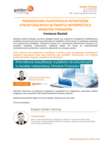 PRAWIDŁOWA KLASYFIKACJA WYDATKÓW STRUKTURALNYCH W ŚWIETLE INTERPRETACJI MINISTRA FINANSÓW Ireneusz Rosiek Szkolenie podczas którego uczestnicy zdobędą wiedzę oraz praktyczne umiejętności kwalifikowania wydatków ponoszonych przez daną jednostkę do wydatków strukturalnych na podstawie przepisów oraz praktycznych przykładów. Omówione zostaną m.in. interpretacje Ministerstwa Finansów oraz przykłady wydatków strukturalnych. Spotkanie będzie też okazją do indywidualnego przedyskutowania problemów i uzyskania odpowiedzi na nurtujące pytania. Celem szkolenia jest podniesienie kwalifikacji w zakresie zasad prawidłowego klasyfikowania wydatków ponoszonych przez daną jednostkę jako wydatków strukturalnych oraz zdobycie praktycznej wiedzy związanej z wydatkami strukturalnymi. Szkolenie skierowane do głównych księgowych, specjalistów ds. księgowości, prawników działów księgowych oraz wszystkich osób zainteresowanych tematem szkolenia. Spotkanie prowadzone będzie w formie wykładu, dyskusji oraz case study. Trener prowadzący: 8:30-9:00 Rejestracja uczestników 9:00-10:30 Cel ustalania wydatków strukturalnych: Finansowanie środkami krajowymi celów UE Cele strukturalne Fundusz Spójności Europejski Fundusz Rozwoju Regionalnego Europejski Fundusz Społeczny Pojęcie wydatków strukturalnych Organizacja gospodarki finansowej a wydatki strukturalne: Statut jako wyznacznik ram działania jednostki Ewidencja rachunkowa wydatków budżetowych Konto 975 Szczegółowość klasyfikowania wydatków- kody Ewidencja wydatków wg źródeł finansowania- czwarta cyfra paragrafu Dowód poniesienia wydatku Równorzędne dowody księgowe Stosowanie klasyfikacji wydatków strukturalnych Wydatki ponoszone na przełomie roku budżetowego 9np. faktura z 2016r. zapłacona w 2017). 10:30-10:40 Przerwa na kawę 10:40-12:30 Ograniczenia: Podmiotowe ograniczenia stosowania kodów Wydatki niebędące wydatkami strukturalnymi Który wydatek ma charakter strukturalny: Zasada dodatkowości Ocena charakteru wydatku w pięciu krokach Studia przypadków szczególnych: Dotacje celowe Inwestycje w infrastrukturę społeczną Wydatki na szkolenia jako wydatki strukturalne Wydatki strukturalne w szkole 12:30-13:00 Przerwa na obiad 13:00-14:00 Przykłady wydatków strukturalnych w świetle stanowisk Ministerstwa Finansów Termomodernizacja budynku Podpis elektroniczny Monitoring wizyjny Zapewnienie bezpieczeństwa uczniom Obowiązek sprawozdawczy Rb-Wsb Rb-Wsa- sprawozdanie o wydatkach strukturalnych poniesionych przez jednostki samorządu terytorialnego Rb-Wsb- sprawozdanie o wydatkach strukturalnych w podziale wojewódzkim (regionalnym) poniesionych przez pozostałe jednostki sektora finansów publicznych Sprawozdawczość skonsolidowana Sporządzanie sprawozdań przez instytucje kultury Termin sprawozdania Zaokrąglenia 14:00-14:10 Przerwa na kawę 14:10-15:00 Wydatki strukturalne w świetle interpretacji Ministerstwa Finansów: Interpretacja dla Ministerstwa Pracy i Polityki Społecznej (30.11.2015) Interpretacja dla Powiatowego Urzędu Pracy w Kluczborku (12.10.2015) Interpretacja dla Marszałka Województwa Wielkopolskiego (18.01.2016) Interpretacja dla Wojewódzkiego Funduszu Ochrony Agenda jest orientacyjna i może ulec zmianie. Czas omówienia poszczególnych punktów programu zależny jest od liczby osób biorących udział w szkoleniu. Miejsce szkolenia: Villa Tradycja ul. Włókiennicza 5, 15-464 Białystok Czas trwania szkolenia: od 9.00 do 15.00 wraz z przerwami na kawę i obiad. Koszt udziału w szkoleniu obejmuje: materiał autorski związany ze szkoleniem, długopis, certyfikat udziału w szkoleniu, przerwy kawowe pomiędzy zajęciami, obiad. Koszt udziału nie obejmuje: dojazdu do miejsca szkolenia, noclegu, parkingu. Koszt udziału za osobę: 470 zł zgłoszenia przesłane do 7 dni przed szkoleniem. 520 zł zgłoszenia przesłane na mniej niż 7 dni przed szkoleniem. Wykonawca nie jest płatnikiem VAT.