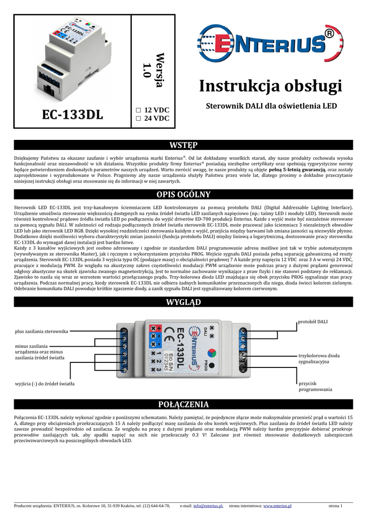 Wersja 1.0 EC-133DL Instrukcja obsługi Sterownik DALI dla oświetlenia LED □ 12 VDC □ 24 VDC WSTĘP Dziękujemy Państwu za okazane zaufanie i wybór urządzenia marki Enterius ®. Od lat dokładamy wszelkich starań, aby nasze produkty cechowała wysoka funkcjonalność oraz niezawodność w ich działaniu. Wszystkie produkty firmy Enterius ® posiadają niezbędne certyfikaty oraz spełniają rygorystyczne normy będące potwierdzeniem doskonałych parametrów naszych urządzeń. Warto zwrócić uwagę, że nasze produkty są objęte pełną 5-letnią gwarancją, oraz zostały zaprojektowane i wyprodukowane w Polsce. Pragniemy aby nasze urządzenia służyły Państwu przez wiele lat, dlatego prosimy o dokładne przeczytanie niniejszej instrukcji obsługi oraz stosowanie się do informacji w niej zawartych. OPIS OGÓLNY Sterownik LED EC-133DL jest trzy-kanałowym ściemniaczem LED kontrolowanym za pomocą protokołu DALI (Digital Addressable Lighting Interface). Urządzenie umożliwia sterowanie większością dostępnych na rynku źródeł światła LED zasilanych napięciowo (np.: taśmy LED i moduły LED). Sterownik może również kontrolować prądowe źródła światła LED po podłączeniu do wyjść driverów ED-700 produkcji Enterius. Każde z wyjść może być niezależnie sterowane za pomocą sygnału DALI. W zależności od rodzaju podłączonych źródeł światła sterownik EC-133DL może pracować jako ściemniacz 3 niezależnych obwodów LED lub jako sterownik LED RGB. Dzięki wysokiej rozdzielczości sterowania każdym z wyjść, przejścia między barwami lub zmiana jasności są niezwykle płynne. Dodatkowo dzięki możliwości wyboru charakterystyki zmian jasności (funkcja protokołu DALI) między liniową a logarytmiczną, dostosowanie pracy sterownika EC-133DL do wymagań danej instalacji jest bardzo łatwe. Każdy z 3 kanałów wyjściowych jest osobno adresowany i zgodnie ze standardem DALI programowanie adresu możliwe jest tak w trybie automatycznym (wywoływanym ze sterownika Master), jak i ręcznym z wykorzystaniem przycisku PROG. Wejście sygnału DALI posiada pełną separację galwaniczną od reszty urządzenia. Sterownik EC-133DL posiada 3 wyjścia typu OC (podające masę) o obciążalności prądowej 7 A każde przy napięciu 12 VDC oraz 3 A w wersji 24 VDC, pracujące z modulacją PWM. Ze względu na akustyczny zakres częstotliwości modulacji PWM urządzenie może podczas pracy z dużymi prądami generować odgłosy akustyczne na skutek zjawiska zwanego magnetostrykcją. Jest to normalne zachowanie wynikające z praw fizyki i nie stanowi podstawy do reklamacji. Zjawisko to nasila się wraz ze wzrostem wartości przełączanego prądu. Trzy-kolorowa dioda LED znajdująca się obok przycisku PROG sygnalizuje stan pracy urządzenia. Podczas normalnej pracy, kiedy sterownik EC-133DL nie odbiera żadnych komunikatów przeznaczonych dla niego, dioda świeci kolorem zielonym. Odebranie komunikatu DALI powoduje krótkie zgaszenie diody, a zanik sygnału DALI jest sygnalizowany kolorem czerwonym. WYGLĄD protokół DALI plus zasilania sterownika minus zasilania urządzenia oraz minus zasilania źródeł światła trzykolorowa dioda sygnalizacyjna przycisk programowania wyjścia (-) do źródeł światła POŁĄCZENIA Połączenia EC-133DL należy wykonać zgodnie z poniższymi schematami. Należy pamiętać, że pojedyncze złącze może maksymalnie przenieść prąd o wartości 15 A, dlatego przy obciążeniach przekraczających 15 A należy podłączyć masę zasilania do obu kostek wejściowych. Plus zasilania do źródeł światła LED należy zawsze prowadzić bezpośrednio od zasilacza. Ze względu na pracę z dużymi prądami oraz modulacją PWM należy bardzo precyzyjnie dobierać przekroje przewodów zasilających tak, aby spadki napięć na nich nie przekraczały 0.3 V! Zalecane jest również stosowanie dodatkowych zabezpieczeń przeciwzwarciowych na poszczególnych obwodach LED. Producent urządzenia: ENTERIUS, os. Kolorowe 10, 31-939 Kraków, tel. (12) 644-64-70, e-mail: [email protected], strona internetowa: www.enterius.pl strona 1 - przewód wysokoprądowy o odpowiednio dobranym przekroju INSTALACJA Moduł EC-133DL jest przystosowany do montażu na szynie TS-35 (TH-35) w szafach i rozdzielniach elektrycznych. W innych miejscach również można zainstalować moduł za pomocą odcinka szyny TS-35 przykręconej do podłoża. Urządzenie jest przeznaczone do montażu wewnątrz pomieszczeń i w przypadku konieczności jego zastosowania na zewnątrz należy zastosować dodatkową obudowę o szczelności co najmniej IP54 jednocześnie pamiętając o skutecznym odprowadzaniu ciepła. ADRESOWANIE Sposób adresowania zależy od zastosowanego modułu sterującego DALI i w większości przypadków adresy zostaną nadane automatycznie z zachowaniem kolejności zgodnie z numerami seryjnymi EC-133DL oraz numerami kanałów czyli pierwszy adres otrzyma kanał 1 EC-133DL o najniższym numerze seryjnym, adres 2 otrzyma kanał 2 tego sterownika, adres 3 kanał 3, adres 4 kanał 1 sterownika o najbliższym wyższym numerze seryjnym, itd. W przypadku modułów sterujących DALI umożliwiających podgląd adresów długich generowanych przez urządzenia DALI, adres długi każdego kanału EC-133DL będzie składał się z 8 cyfrowego ciągu, w którym pierwsza cyfra to zawsze 0, kolejne 6 cyfr to numer seryjny urządzenia (znajdujący się na etykiecie), a ostatnia cyfra to numer kanału w danym sterowniku (1-3). Dzięki temu identyfikacja urządzenia nie powinna sprawić problemów. Jeżeli moduł sterujący DALI umożliwia wejście w tryb ręcznego wyboru adresów można do tego celu wykorzystać przycisk PROG który należy wcisnąć i przytrzymać przez co najmniej 2 s. aby wprowadzić urządzenie w tryb „physical selection”. INFORMACJE DLA UŻYTKOWNIKA DOTYCZĄCE BEZPIECZEŃSTWA Podczas instalacji oraz eksploatacji urządzenia należy przestrzega