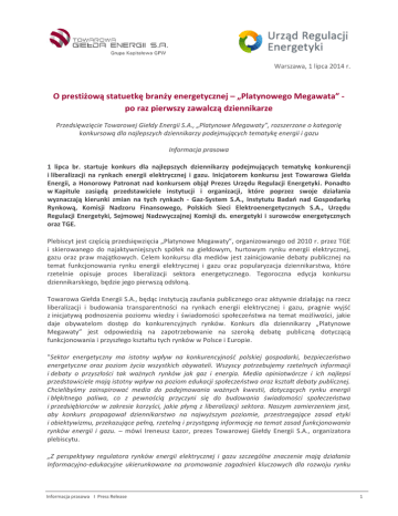 Warszawa, 1 lipca 2014 r. O prestiżową statuetkę branży energetycznej – „Platynowego Megawata” po raz pierwszy zawalczą dziennikarze Przedsięwzięcie Towarowej Giełdy Energii S.A., „Platynowe Megawaty”, rozszerzone o kategorię konkursową dla najlepszych dziennikarzy podejmujących tematykę energii i gazu Informacja prasowa 1 lipca br. startuje konkurs dla najlepszych dziennikarzy podejmujących tematykę konkurencji i liberalizacji na rynkach energii elektrycznej i gazu. Inicjatorem konkursu jest Towarowa Giełda Energii, a Honorowy Patronat nad konkursem objął Prezes Urzędu Regulacji Energetyki. Ponadto w Kapitule zasiądą przedstawiciele instytucji i organizacji, które poprzez swoje działania wyznaczają kierunki zmian na tych rynkach - Gaz-System S.A., Instytutu Badań nad Gospodarką Rynkową, Komisji Nadzoru Finansowego, Polskich Sieci Elektroenergetycznych S.A., Urzędu Regulacji Energetyki, Sejmowej Nadzwyczajnej Komisji ds. energetyki i surowców energetycznych oraz TGE. Plebiscyt jest częścią przedsięwzięcia „Platynowe Megawaty”, organizowanego od 2010 r. przez TGE i skierowanego do najaktywniejszych spółek na giełdowym, hurtowym rynku energii elektrycznej, gazu oraz praw majątkowych. Celem konkursu dla mediów jest zainicjowanie debaty publicznej na temat funkcjonowania rynku energii elektrycznej i gazu oraz popularyzacja dziennikarstwa, które rzetelnie opisuje proces liberalizacji sektora energetycznego. Tegoroczna edycja konkursu dziennikarskiego, będzie jego pierwszą odsłoną. Towarowa Giełda Energii S.A., będąc instytucją zaufania publicznego oraz aktywnie działając na rzecz liberalizacji i budowania transparentności na rynkach energii elektrycznej i gazu, pragnie wyjść z inicjatywą podnoszenia poziomu wiedzy i świadomości społeczeństwa na temat możliwości, jakie daje obywatelom dostęp do konkurencyjnych rynków. Konkurs dla dziennikarzy „Platynowe Megawaty” jest odpowiedzią na zapotrzebowanie na szeroką debatę publiczną dotyczącą funkcjonowania i przyszłego kształtu tych rynków w Polsce i Europie. "Sektor energetyczny ma istotny wpływ na konkurencyjność polskiej gospodarki, bezpieczeństwo energetyczne oraz poziom życia wszystkich obywateli. Wszyscy potrzebujemy rzetelnych informacji i debaty o przyszłości tak ważnych rynków jak gaz i energia. Media opiniotwórcze i ich najlepsi przedstawiciele mają istotny wpływ na poziom edukacji społeczeństwa oraz kształt debaty publicznej. Chcielibyśmy zainspirować media do podejmowania ważnych kwestii, dotyczących rynku energii i błękitnego paliwa, co z pewnością przyczyni się do budowania świadomości społeczeństwa i przedsiębiorców w zakresie korzyści, jakie płyną z liberalizacji sektora. Naszym zamierzeniem jest, aby konkurs propagował dziennikarstwo na najwyższym poziomie, przestrzegające zasad etyki i obiektywizmu, przekazujące pełną, rzetelną i przystępną informację na temat zasad funkcjonowania rynków energii i gazu. – mówi Ireneusz Łazor, prezes Towarowej Giełdy Energii S.A., organizatora plebiscytu. „Z perspektywy regulatora rynków energii elektrycznej i gazu szczególne znaczenie mają działania Informacyjno-edukacyjne ukierunkowane na promowanie zagadnień kluczowych dla rozwoju rynku Informacja prasowa Ι Press Release 1 energii w Polsce i zwiększenia świadomości uczestników tego rynku. Prezes URE, wspierając rozwój krajowego sektora energetycznego i gazowego, stara się różnorodnymi sposobami propagować wiedzę na temat możliwości oferowanych przez rynek z uwzględnieniem potrzeb i oczekiwań wszystkich zainteresowanych stron. Jednym z podstawowym kanałów dotarcia z informacją do szerokiej opinii publicznej jest współpraca z dziennikarzami, którzy mogą zapewnić rzetelną i pełną informację pomagająca w rozumieniu reguł działania rynków energii przez wszystkich ich uczestników – zauważa Maciej Bando, prezes Urzędu Regulacji Energetyki, który objął honorowy patronat nad konkursem. Konkurs dla dziennikarzy „Platynowe Megawaty” skierowany jest do reprezentantów mediów ogólnopolskich, regionalnych i branżowych. Do Konkursu mogą być zgłaszane materiały prasowe, radiowe, telewizyjne i internetowe, opublikowane w okresie od 1 stycznia do 31 grudnia 2014 roku, traktujące o tematyce rynku energii elektrycznej lub gazu w Polsce. W gronie ekspertów, którzy zasiądą w Kapitule Konkursu znajdują się przedstawiciele najważniejszych instytucji, które obserwują i poprzez swoje działania inicjują zmiany w branży. W kolejności alfabetycznej, są to: - Maciej Bando, Prezes - Urząd Regulacji Energetyki - Jan Chadam, Prezes Zarządu - Gaz-System S.A. - Andrzej Czerwiński, Przewodniczący Sejmowej Komisji ds. Energetyki - Łukasz Dajnowicz, Dyrektor Departamentu Komunikacji Społecznej - Komisja Nadzoru Finansowego - Henryk Majchrzak, Prezes Zarządu - Polskie Sieci Elektroenergetyczne S.A. - Ireneusz Łazor, Prezes Zarządu - Towarowa Giełda Energii S.A. - Jan Szomburg Jr. – Wiceprezes Zarządu – Instytut Badań nad Gospodarką Rynkową, Dyrektor Centrum Strategii Energetycznych W pierwszej edycji konkursu planowane są nagrody: - Nagroda główna - Platynowy Megawat - dla Dziennikarza Roku - Wyróżnienie za najlepszą publikację dotyczącą rynku energii elektrycznej - Wyróżnienie za najlepszą publikację dotyczącą rynku gazu Rejestracja uczestników konkursu rozpocznie się 1 lipca 2014 r., a zakończy 23 stycznia 2015 r. Nominacje mogą zgłaszać: dziennikarze - autorzy publikacji, kolegia redakcyjne gazet, czasopism, stacji radiowych i telewizyjnych oraz profesjonalne redakcje internetowe, zatrudniające zawodowych dziennikarzy, a także członkowie Kapituły Konkursu oraz Członkowie Towarowej Giełdy Energii. Ogłoszenie wyników nastąpi podczas uroczystej wieczornej Gali - dorocznego spotkania z Członkami Towarowej Giełdy Energii w pierwszy