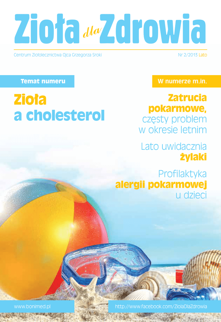Zioła Zdrowia dla Centrum Ziołolecznictwa Ojca Grzegorza Sroki Temat numeru Zioła a cholesterol Nr 2/2013 Lato W numerze m.in. Zatrucia pokarmowe, częsty problem w okresie letnim Lato uwidacznia żylaki Profilaktyka alergii pokarmowej u dzieci www.bonimed.pl http://www.facebook.com/ZiolaDlaZdrowia Uwaga na filtry UV! S tosowanie filtrów zapobiegających działaniu promieni słonecznych na skórę ma niestety dwa oblicza. Z jednej strony skóra, która chroniona jest filtrem starzeje się wolniej, jednakże jak wynika z badań naukowych brak dostępu promieni słonecznych do skóry powoduje zaburzenia w wytwarzaniu witaminy D3. Brak tej witaminy u osób dorosłych prowadzi do osteoporozy, która częściej dotyka kobiet niż mężczyzn. Ponadto witamina D3 odgrywa dużą rolę w utrzymania prawidłowej odporności organizmu, która zapobiega rozwojowi infekcji. Pewnym rozwiązaniem są substancje naturalne, które nie blokują przedostawania się promieni UV do organizmu a likwidują ich destrukcyjne działanie na skórę. Te substancje to antyoksydanty zawarte np. w naparze z herbaty oraz w owocach. Dlatego zachęcamy Panie – bo głównie ich dotyczy ten problem, aby w okresie letnim piły dużo herbaty i zjadały owoce o kolorze fioletowym, czerwonym, niebieskim (borówka czarna, pomidory, aronia itp.) Zachęcamy także do zażywania preparatu Vitalbon, który ma bardzo silne działanie antyoksydacyjne i może zapobiegać destruk- 2 cyjnemu działaniu promieni UV na skórę. W Centrum Ziołolecznictwa Ojca Grzegorza Sroki powstał specjalny program terapeutyczny, który ma zapobiegać powstawaniu zmarszczek i opóźniać procesy starzenia się skóry. System ten to Bell Visage anti-aging, na który składają się: dwa kremy – na dzień i na noc oraz kapsułki doustne. Poza silnym działaniem antyoksydacyjnym zestaw posiada absolutnie unikalny mechanizm opóźniający procesy starzenia się. Badania nad surowcami zielarskimi użytymi do tego programu trwały kilka lat i zakończyły się sukcesem. Dzięki temu nasze Centrum Ziołolecznictwa może zaoferować kompleksowy i rewolucyjny produkt, który z pewnością doceni każdy nabywca. System mogą stosować zarówno Panie jak i Panowie. Redukuje on zmarszczki, ujędrnia skórę, a przez to, że zawiera również kapsułki ziołowe, działa odmładzająco i rewitalizująco na cały organizm. Zalecamy stosować go przez 2 miesiące dwa razy w roku. Efekty są naprawdę rewelacyjne. Preparaty ziołowe Ojca Grzegorza Sroki Ćwierć wieku stosowania Bonidermu w Centrum Ziołolecznictwa Ojca Grzegorza W tym roku mija 25 lat od czasu kiedy zaczęliśmy stosować w naszym Centrum Boniderm zwany też Pomadą Ojca Grzegorza. W jego stworzeniu obok Ojca Grzegorza Sroki oraz współpracujących z nim lekarzy, brali również udział eksperci tacy, jak m.in. prof. Aleksander Ożarowski. Po opracowaniu tego unikalnego produktu został on zastosowany u pacjentów prof. W. Niczyporuka w Klinice Dermatologii Uniwersytetu Medycznego w Białymstoku. Założeniem jakie przyjęliśmy przy tworzeniu tego ziołowego mydła, było uzyskanie produktu, który pomocny byłby w przypadku alergii skórnej oraz trądziku. W czasie obserwacji prowadzonej w klinice, stwierdzono, że poprawia on stan skóry w tych schorzeniach. Dodatkowo wykryto, że łagodzi objawy innych poważnych dolegliwości skórnych takich jak: łuszczyca, pęcherzyca łojotokowa, łojotokowe zapale- nie skóry czy rybia łuska. Było to dla twórców preparatu miłym zaskoczeniem, zwłaszcza, że stosowanie Bonidermu jest niezwykle wygodne w porównaniu z typowymi lekami w postaci maści czy pudrów. W ciągu 25 lat stosowania Bonidermu w pełni potwierdziliśmy obserwacje z badań klinicznych, ku satysfakcji i radości nas i naszych pacjentów. Doszliśmy także do jednego ważnego wniosku, iż niezwykle istotne w leczeniu schorzeń skóry jest zażywanie leków o działaniu odtruwającym, które od wewnątrz wpływają na nasz organizm. Dlatego w przypadku tych dolegliwości polecamy stosować obok Bonidermu także krople odtruwające Nefrobonisol oraz krople klasztorne Gastrobonisol. Jeżeli na skórze występują silne podrażnienia do tego zestawu dołączamy Dermobon krem. • Trądzik • Alergia skórna • Skóra łojotokowa • Łuszczyca • Łupież Preparaty ziołowe Ojca Grzegorza Sroki Naturalne łagodzenie objawów refluksu żołądkowo-przełykowego R efluks żołądkowo-przełykowy polega na cofaniu się treści pokarmowej z żołądka do przełyku i objawia się najczęściej zgagą, tzw. pustym odbijaniem, czasami trudnościami w przełykaniu i innymi objawami. Jego leczenie polega na stosowaniu leków blokujących wydzielanie żołądkowe np. blokerów pompy protonowej. Na dłuższą metę zażywanie takich preparatów może powodować zaburzenia trawienia – o czym należy wiedzieć. Leczenie ziołowe objawów refluksu zależy od tego, czy jest to tzw. refluks fizjologiczny, który wywołuje błąd dietetyczny lub zbyt obfity posiłek, czy też jest to choroba refluksowa powodująca uszkodzenia błony śluzowej przełyku. W przypadku refluksu fizjologicznego najlepsze efekty uzyskujemy poprzez stosowanie kropli poprawiających trawienie Gastrobonisol – 1-2 łyżeczki doraźnie w czasie wystąpienia dolegliwości. W przypadku choroby refluksowej postępowanie jest inne. W początkowej fazie przez kilka a nawet kilkanaście dni należy stosować zioła łagodzące stany zapalne uszkodzonej błony śluzowej żołądka. Idealną mieszanką ziołową do łagodzenia tych dolegliwości jest Gastrobonisan zawierający: korzeń lukrecji, ko- 4 szyczek rumianku, liść babki lancetowatej, korzeń prawoślazu, kwiat nagietka. Zalecamy naszym pacjentom picie 2-3 x dziennie naparu z tych ziół a gdy stan ulegnie poprawie dodanie do naparu kropli Gastrobonisol. W praktyce wygląda to tak, że napar ziołowy wzbogacamy niejako dodatkiem 1 łyżeczki Gastrobonisolu. Kiedy s