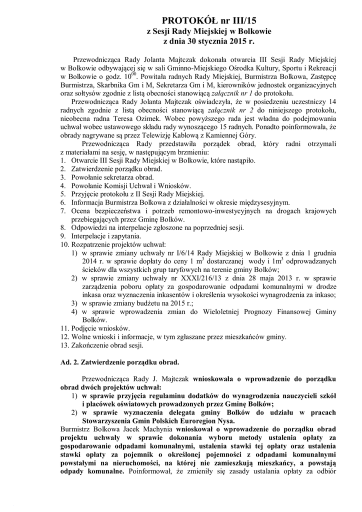PROTOKÓŁ nr III/15 z Sesji Rady Miejskiej w Bolkowie z dnia 30 stycznia 2015 r. Przewodnicząca Rady Jolanta Majtczak dokonała otwarcia III Sesji Rady Miejskiej w Bolkowie odbywającej się w sali Gminno-Miejskiego Ośrodka Kultury, Sportu i Rekreacji w Bolkowie o godz. 1000. Powitała radnych Rady Miejskiej, Burmistrza Bolkowa, Zastępcę Burmistrza, Skarbnika Gm i M, Sekretarza Gm i M, kierowników jednostek organizacyjnych oraz sołtysów zgodnie z listą obecności stanowiącą załącznik nr 1 do protokołu. Przewodnicząca Rady Jolanta Majtczak oświadczyła, że w posiedzeniu uczestniczy 14 radnych zgodnie z listą obecności stanowiącą załącznik nr 2 do niniejszego protokołu, nieobecna radna Teresa Ozimek. Wobec powyższego rada jest władna do podejmowania uchwał wobec ustawowego składu rady wynoszącego 15 radnych. Ponadto poinformowała, że obrady nagrywane są przez Telewizję Kablową z Kamiennej Góry. Przewodnicząca Rady przedstawiła porządek obrad, który radni otrzymali z materiałami na sesję, w następującym brzmieniu: 1. Otwarcie III Sesji Rady Miejskiej w Bolkowie, które nastąpiło. 2. Zatwierdzenie porządku obrad. 3. Powołanie sekretarza obrad. 4. Powołanie Komisji Uchwał i Wniosków. 5. Przyjęcie protokołu z II Sesji Rady Miejskiej. 6. Informacja Burmistrza Bolkowa z działalności w okresie międzysesyjnym. 7. Ocena bezpieczeństwa i potrzeb remontowo-inwestycyjnych na drogach krajowych przebiegających przez Gminę Bolków. 8. Odpowiedzi na interpelacje zgłoszone na poprzedniej sesji. 9. Interpelacje i zapytania. 10. Rozpatrzenie projektów uchwał: 1) w sprawie zmiany uchwały nr I/6/14 Rady Miejskiej w Bolkowie z dnia 1 grudnia 2014 r. w sprawie dopłaty do ceny 1 m3 dostarczanej wody i 1m3 odprowadzanych ścieków dla wszystkich grup taryfowych na terenie gminy Bolków; 2) w sprawie zmiany uchwały nr XXXI/216/13 z dnia 28 maja 2013 r. w sprawie zarządzenia poboru opłaty za gospodarowanie odpadami komunalnymi w drodze inkasa oraz wyznaczenia inkasentów i określenia wysokości wynagrodzenia za inkaso; 3) w sprawie zmiany budżetu na 2015 r.; 4) w sprawie wprowadzenia zmian do Wieloletniej Prognozy Finansowej Gminy Bolków. 11. Podjęcie wniosków. 12. Wolne wnioski i informacje, w tym zgłaszane przez mieszkańców gminy. 13. Zakończenie obrad sesji. Ad. 2. Zatwierdzenie porządku obrad. Przewodnicząca Rady J. Majtczak wnioskowała o wprowadzenie do porządku obrad dwóch projektów uchwał: 1) w sprawie przyjęcia regulaminu dodatków do wynagrodzenia nauczycieli szkół i placówek oświatowych prowadzonych przez Gminę Bolków; 2) w sprawie wyznaczenia delegata gminy Bolków do udziału w pracach Stowarzyszenia Gmin Polskich Euroregion Nysa. Burmistrz Bolkowa Jacek Machynia wnioskował o wprowadzenie do porządku obrad projektu uchwały w sprawie dokonania wyboru metody ustalenia opłaty za gospodarowanie odpadami komunalnymi, ustalenia stawki tej opłaty oraz ustalenia stawki opłaty za pojemnik o określonej pojemności z odpadami komunalnymi powstałymi na nieruchomości, na której nie zamieszkują mieszkańcy, a powstają odpady komunalne. Poinformował, że zmieniły się zasady ustalania opłaty za odbiór 2 odpadów komunalnych w ustawie o utrzymaniu czystości i porządku w gminach, która została opublikowana 20 stycznia br., przyjęta była w listopadzie 2014 r. Dodał, że został przygotowany projekt uchwały, który spełnia nowe zasady określone w ustawie. Radny Marek Kwiatkowski zapytał co się zmieniło w porównaniu do dotychczas obowiązującej uchwały. Burmistrz J. Machynia poinformował, że merytoryczna zawartość uchwały jest identyczna z uchwałą poprzednią. W ustawie zmieniło się to, że wprowadzono art. 6k, który określa zasady odpłatności. Do tej pory ustalano opłatę, a następnie wobec tej przyjętej opłaty ustalano opłatę niższą za śmieci segregowane. Obecna zmiana polega na tym, że ustalana jest opłata i w stosunku do tej przyjętej stawki wyznaczana jest stawka wyższa za odpady niesegregowane. Zmiana jest istotna i należy zapisy uchwały do tego dostosować. Druga zmiana to określenie górnych stawek opłat za odbiór odpadów komunalnych. O ile górna stawka określona w ustawie przy dotychczasowej przyjętej metodzie od osoby wynosi 25,53 zł a w gminie Bolków jest to kwota 11 zł od osoby, tj. dużo poniżej maksymalnej stawki. Oprócz redakcyjnych zmian w poprzedniej uchwale była ustalana stawka niższa za odpady segregowane, a teraz należy ustalić stawkę wyższą za niesegregowane odpady. Odnośnie przyjęcia tej uchwały poinformował, że profesorowie prawa mają różne stanowiska. Jest grupa prawników, którzy stoją na stanowisku, że jeśli stawki w uchwałach gmin nie przekraczają stawek ustalonych w ustawie to nie ma konieczności zmiany dotychczas obowiązującej uchwały. Są też głosy, według których nastąpiły znaczne zmiany w ustawie związane ze zmianą podstawy prawnej. Prawnicy ci wypowiadają się, że w przypadku nie podjęcia przez gminy uchwały może zostać podważona zasadność pobierania opłaty wg obecnej uchwały. Dodał, że przyjęto wersję bezpieczną związaną ze zmianą uchwały. Radna Elżbieta Kramarczuk zapytała czy ceny pozostały na takim samym poziomie jak dotychczas? Burmistrz J. Machynia poinformował, że opłaty są na tym samym poziomie, ani o grosz nie zostały zmienione. Radny M. Kwiatkowski poinformował, że w dniu 21 stycznia br. była Komisja Rewizyjna, której tematem była gospodarka śmieciowa i można było sprawę przedyskutować na tym posiedzeniu. Burmistrz J. Machynia poinformował, że denerwującym jest fakt, że państwo stawia gminy w takiej sytuacji, ponieważ akt prawny podpisany został przez Prezydenta RP w listopadzie 2014 r. a oddany do druku w dniu 17 stycznia br. Dodał, że obecnie prowadzona jest przez prawników dyskusja nad koniecznością wprowadzenia tej uchwały i stanowiska s