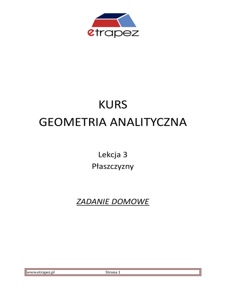 KURS GEOMETRIA ANALITYCZNA Lekcja 3 Płaszczyzny ZADANIE DOMOWE www.etrapez.pl Strona 1 Część 1: TEST Zaznacz poprawną odpowiedź (tylko jedna jest prawdziwa). Pytanie 1 Czy koło może być fragmentem płaszczyzny? a) Tak b) Nie Pytanie 2 Które z poniższych równań nie jest równaniem płaszczyzny? a) 4 x 2 y 3 z 7 0 x y z 1 0 b) 2 4 1 1 x yz 5 3 c) 2 d) 2 x 3 y 4 z 7 0 Pytanie 3 Jak zdefiniować wektor normalny płaszczyzny? a) Jako wektor jednostkowy do niej prostopadły b) Jako wektor jednostkowy wyznaczający kierunek płaszczyzny c) Jako wektor prostopadły do płaszczyzny d) Jako wektor równoległy do płaszczyzny www.etrapez.pl Strona 2 Pytanie 4 Czy mając dany wektor AB prostopadły do płaszczyzny przechodzącej przez punkt A oraz mając dany punkt B będziemy mogli wyznaczyć równanie tej płaszczyzny? a) Tak, po obliczeniu współrzędnych punktu A b) Tak, przyjmując jako punkt należący do płaszczyzny punkt B c) Tak, po obliczeniu współrzędnych jakiegokolwiek punktu należącego do płaszczyzny i nie będącego ani punktem A, ani punktem B d) Nie Pytanie 5 Podczas wyznaczania równania płaszczyzny współrzędne wektora prostopadłego do niej podstawiamy do równania ogólnego Ax By Cz D 0 za: a) x, y, z b) A, B, C, D c) A, B, C d) A, B, D Pytanie 6 Czy mając dany punkt należący do płaszczyzny i wektor do niej równoległy możemy wyznaczyć jej równanie? a) Tak b) Nie www.etrapez.pl Strona 3 Pytanie 7 Płaszczyzny 2 x 2 y 2 z 2 0 i 4 x 4 y 4 z 4 0 są... a) Równe sobie (takie same) b) Równoległe c) Proporcjonalne d) Prostopadłe Pytanie 8 0 Kąt pomiędzy wektorami normalnymi płaszczyzny równy jest 135 . Nie jest prawdą, że... a) Kąt pomiędzy płaszczyznami równy jest 135 b) Kąt pomiędzy płaszczyznami równy jest 45 0 0 c) Nie można określić kąta pomiędzy płaszczyznami d) Kąt pomiędzy płaszczyznami jest kątem ostrym Pytanie 9 Jaki warunek muszą spełniać dwie płaszczyzny, aby można było policzyć odległość pomiędzy nimi? a) Być prostopadłe b) Powinny się przecinać c) Mieć wspólny punkt d) Być równoległe www.etrapez.pl Strona 4 Pytanie 10 Z jakimi rodzajami równania płaszczyzny zapoznać się można w tym Kursie? a) Ogólnym i kierunkowym b) Ogólnym i odcinkowym c) Ogólnym i parametrycznym d) Ogólnym i wektorowym www.etrapez.pl Strona 5 Część 2: ZADANIA Zad.1 Znajdź równanie płaszczyzny przechodzącej przez punkt A i prostopadłej do wektora n : a) A(4, 7, -1) n 1,1, 2 b) A(-1, 5, 2) n 3, 2, 1 Zad.2 Znajdź równanie płaszczyzny przechodzącej przez punkt A(2,-1,4) i równoległej do wektorów a 3, 2, 2 b 1, 2, 2 i Zad.3 Znajdź równanie płaszczyzny przechodzącej przez punkty A(1, -1, -3) i B(7, 6, 2) i równoległej a 5,5, 0 do wektora . Zad.4 Znajdź równanie płaszczyzny przechodzącej przez punkty A(4, -1, 0), B(0, 2, 3) i C(1, -1, 1). Zad.5 Dla jakich wartości parametrów i płaszczyzny x 2 y 4 z 1 0 i x y z 1 0 są równoległe? Zad.6 Dla jakich wartości parametru a płaszczyzny ax 3ay 4 z 12 0 i ax y prostopadłe? Zad.7 Znajdź kąt pomiędzy płaszczyznami 2 x 3 y z 5 0 i y z 2 0 www.etrapez.pl Strona 6 1 z0 2 są Zad.8 Znajdź równanie płaszczyzny przechodzącej przez punkt A(2, 2, -2) i równoległej do płaszczyzny 2 x 4 y 6 z 4 0 Zad.9 Znaleźć równanie płaszczyzny przechodzącej przez punkt A(-1, -1, 2) i prostopadłej do płaszczyzn 2 x 4 y 2 z 7 0 i x 2 y 2 z 15 0 Zad.10 Oblicz odległość punktu A od płaszczyzny , jeśli: a) A 5,1, 1 : 2 x 4 y 4 z 4 0 i b) A 3,1, 1 10 x 2 y 10 z 45 0 i Zad.11 Oblicz odległość pomiędzy płaszczyznami 15 x 16 y 12 z 25 0 i 30 x 32 y 24 z 75 0 Zad.12 Znaleźc równanie płaszczyzny równoległej do płaszczyzny 2 x 6 y 3 z 5 0 i oddalonej od niej o 6. Zad.13 Znaleźc równanie płaszczyzny przechodzącej przez punkt A(3, 5, -7) i odcinającej na osiach układu współrzędnych równe odcinki. KONIEC www.etrapez.pl Strona 7