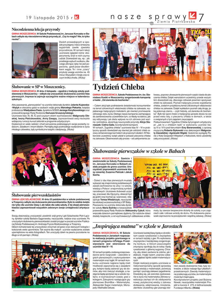 19 listopada 2015 r nasze sprawy Ziemia Piotrkowska 7 Niecodzienna lekcja przyrody GMINA MOSZCZENICA.W Szkole Podstawowej im. Janusza Korczaka w Babach odbyła się niecodzienna lekcja przyrody pt. „Czy to magia? Nie, to tylko nauka!”. Dwóch prowadzących w sposób przystępny i nieco śmieszny wyjaśniała zawiłe zjawiska przyrodnicze. W ramach lekcji uczniowie oglądali różne eksperymenty, brali w nich czynny udział. Dowiedzieli się, np.: jak przebiega wybuch wulkanu, dlaczego płonąca ręka nie jest poparzona, gasili pożar dwutlenkiem węgla. Te i inne „czary” przykuły uwagę uczniów na 45 minut.Wszystkim minęły one niczym krótka chwila. (Wuka) Ślubowanie w SP w Moszczenicy. GMINA MOSZCZENICA.W dniu 4 listopada – zgodnie z tradycją szkoły podstawowej w Moszczenicy – odbyła się uroczystość ślubowania uczniów klas pierwszych. Impreza ta zajmuje szczególne ważne miejsce w kalendarzu szkolnym. Aktu pasowania „pierwszaków” na uczniów dokonała dyrektor Jolanta Kujawska-Wężyk w otoczeniu gości w osobach: wójta gminy Marcelego Piekarka, księdza proboszcza Władysława Pasia, dyrektora GOKiS Jerzego Korytkowskiego oraz przewodniczącego Rady Rodziców Dariusza Gruszczyńskiego. Uczniowie klas: IA, IB, IC pod czujnym okiem wychowawców: Małgorzaty Oleskiej, Iwony Pietrzkowskiej, Anny Zasępy, zaprezentowali swój niezwykle wdzięczny i uroczy kunszt aktorski w programie artystycznym. Dostarczył on wiele radości i chwil wzruszenia podziwiającym swoje pociechy rodzicom, dziadkom i innym bliskim. Pamiątką tego podniosłego wydarzenia w życiu młodego człowieka, były symboliczne książki z dedykacją. (Wuka) Tydzień Chleba GMINA MOSZCZENICA. Szkoła Podstawowa im. św. Stanisława Kostki w Moszczenicy zorganizowała kampanię o haśle: „Od ziarenka do bochenka”. – Celem akcji było podniesienie świadomości konsumentów na temat zdrowotnych właściwości chleba na zakwasie, wypiekanego tradycyjnymi metodami, jak również promowanie zdrowego stylu życia. Dlatego nasza kampania zachęcająca do zainteresowania uczestników tym, co kładą na talerzu, jak się odżywiają i jak dieta wpływa na ich zdrowie jest ważna i potrzebna, akcentują nauczycielki przyrody Alicja Staniaszek i Celina Galia, koordynatorki kampanii. W ramach „Tygodnia chleba” uczniowie klas IV – VI w praktyczny sposób dowiedzieli się również jak odróżnić chleb razowy od barwionego karmelem lub prażonym słodem.W Nieborowie uczestnicy wzięli udział w pokazie pieczenia chleba na zakwasie. Obserwowali cały proces – od uaktywnienia za- kwasu, poprzez ukwaszenie pierwszych części ciasta do pieczenia chleba. Dzięki warsztatom uczestnicy przede wszystkim dowiedzieli się, dlaczego człowiek powinien spożywać chleb na zakwasie. Poznali tradycyjny proces wypiekania chleba, został im przybliżony temat zdrowotnych właściwości chleba na zakwasie. Dzięki wykładom poznali całą drogę, jaką pokonuje ziarno, – czyli historię „od ziarenka do bochenka”. Było też sporo treści o tradycyjnej uprawie zboża na wsi przed wielu laty, o pieczeniu chleba w domach, a także o związanych z tym zajęciem zwyczajach. Podsumowaniem Tygodnia Chleba był program artystyczny pt: „Jak to z chlebem było” w wykonaniu uczniów klasy VI a i VI b pod kierunkiem Ewy Baranowskiej, z oprawą muzyczną Roberta Bykowski oraz dekoracjami Małgorzaty Zawadzkiej i Agnieszki Migdał. Gościnnie wystąpiły Panie z Koła Gospodyń Wiejskich z Kiełczówki, które uświetniły całą uroczystość.(Wuka) Ślubowanie pierwszaków w szkole w Babach GMINA MOSZCZENICA. Sześcio i siedmiolatki ze Szkoły Podstawowej im. Janusza Korczaka w Babach zostały przyjęte do grona uczniów. Uroczystość poprowadzili uczniowie klasy czwartej: Zuzanna Pietrzak i Jakub Socha. Ślubowanie pierwszoklasistów GMINA ŁĘKI SZLACHECKIE.W dniu 23 października w szkole podstawowej wTrzepnicy odbyło się ślubowanie pierwszoklasistów. Było to wielkie święto nie tylko dla uczniów klasy I, ale także dla całej szkoły. Z tej okazji pierwszoklasiści zaprezentowali wszystkim zebranym swoje umiejętności artystyczne. Swoją obecnością uroczystość uświetnili: wójt gminy Łęki Szlacheckie Piotr Łączny, dyrektor szkoły Barbara Gągorowska, nauczyciele, rodzice oraz uczniowie. Po uroczystym ślubowaniu pierwszoklasiści zostali przyjęci w poczet uczniów Publicznej Szkoły Podstawowej im. Andrzeja Frycza Modrzewskiego w Trzepnicy. Główni bohaterowie tej uroczystości otrzymali od gości oraz starszych kolegów i koleżanek wiele upominków. Tak ważne dla małych uczniów wydarzenie zostało upamiętnione na wielu fotografiach. Ten uroczysty dzień na pewno pozostanie na długo w ich pamięci. (Wuka) - Dzieci z obu klas pierwszych musiały wykazać się znajomością podstawowych zasad zachowania na ulicy i w szkole, wiedzą o Polsce i znajomością symboli narodowych. Uczniowie ślubowali uczyć się, pracować dla Ojczyzny, obiecali być jej godni oraz kochać ją i szanować, relacjonuje Teresa Włodarczyk, nauczycielka edukacji wczesnoszkolnej z SP Baby. Pasowania na uczniów dokonała dyrektor szkoły Maria Bylinka w towarzystwie przewodniczącej Rady Rodziców Aleksandry Cybuli, która wręczała dzieciom pamiątkowe dyplomy. Od rodziców dzieci dostały książeczki, a od wychowawczyń odblaskowe emble- maty, by zawsze bezpiecznie dotarły do szkoły, a po zajęciach całe i zdrowe wróciły do domu. Po ślubowaniu pierwszaki zaproszono na poczęstunek i wspólną zabawę. (Wuka) „Inspirująca matma” w szkole w Jarostach GMINA MOSZCZENICA. W Szkole Podstawowej w Jarostach rozpoczęto realizację projektu grantowego w ramach programu mPotęga. Przedsięwzięcie jest skierowane do uczniów klas IV – VI. W ramach projektu zostaną przeprowadzone serie rozgrywek – zawodów w grach planszowych z wykorzystaniem matematyki oraz logiki. W ramach konkursu uczniowie n
