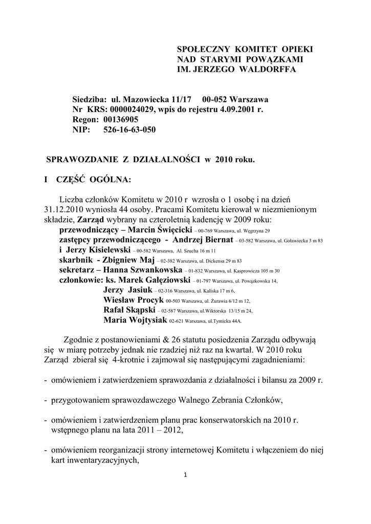 SPOŁECZNY KOMITET OPIEKI NAD STARYMI POWĄZKAMI IM. JERZEGO WALDORFFA Siedziba: ul. Mazowiecka 11/17 00-052 Warszawa Nr KRS: 0000024029, wpis do rejestru 4.09.2001 r. Regon: 00136905 NIP: 526-16-63-050 SPRAWOZDANIE Z DZIAŁALNOŚCI w 2010 roku. I CZĘŚĆ OGÓLNA: Liczba członków Komitetu w 2010 r wzrosła o 1 osobę i na dzień 31.12.2010 wyniosła 44 osoby. Pracami Komitetu kierował w niezmienionym składzie, Zarząd wybrany na czteroletnią kadencję w 2009 roku: przewodniczący – Marcin Święcicki – 00-769 Warszawa, ul. Węgrzyna 29 zastępcy przewodniczącego - Andrzej Biernat – 03-582 Warszawa, ul. Goławiecka 3 m 83 i Jerzy Kisielewski – 00-582 Warszawa, Al. Szucha 16 m 11 skarbnik - Zbigniew Maj – 02-382 Warszawa, ul. Dickensa 29 m 83 sekretarz – Hanna Szwankowska – 01-832 Warszawa, ul. Kasprowicza 105 m 30 członkowie: ks. Marek Gałęziowski – 01-797 Warszawa, ul. Powązkowska 14, Jerzy Jasiuk – 02-316 Warszawa, ul. Kaliska 17 m 6, Wiesław Procyk 00-503 Warszawa, ul. Żurawia 6/12 m 12, Rafał Skąpski – 02-587 Warszawa, ul.Wiktorska 13/15 m 24, Maria Wojtysiak 02-621 Warszawa, ul.Tymicka 44A. Zgodnie z postanowieniami & 26 statutu posiedzenia Zarządu odbywają się w miarę potrzeby jednak nie rzadziej niż raz na kwartał. W 2010 roku Zarząd zbierał się 4-krotnie i zajmował się następującymi zagadnieniami: - omówieniem i zatwierdzeniem sprawozdania z działalności i bilansu za 2009 r. - przygotowaniem sprawozdawczego Walnego Zebrania Członków, - omówieniem i zatwierdzeniem planu prac konserwatorskich na 2010 r. wstępnego planu na lata 2011 – 2012, - omówieniem reorganizacji strony internetowej Komitetu i włączeniem do niej kart inwentaryzacyjnych, 1 - zatwierdzeniem wniosków o dofinansowanie składanych w MK i DN oraz u Stołecznego Konserwatora Zabytków, - ustaleniem limitu wydatków administracyjnych na 2010 r., - omówieniem poziomu wykonywania prac konserwatorskich w 2009 roku i przyjęciem wniosków w sprawie poprawy jakości tych prac w przyszłości, - rozpatrzeniem indywidualnych wniosków o podjęcie prac konserwatorskich przy wnioskowanych nagrobkach, - ustaleniem terminu i programu kwesty, - omówieniem wyników przebiegu kwesty. Komisja Rewizyjna w Składzie: Krystyna Drogoń, Paweł Romański, Andrzej Sośnierz dokonała analizy dokumentacji finansowo-księgowej, sprawozdania Zarządu i przedłożyła na W.Z.Cz wniosek o przyjęcie sprawozdania i udzielenie absolutorium dla Zarządu za 2009 r. Komisja Naukowo-Konserwatorska pracowała w niezmienionym składzie, tj: Wojciech Fijałkowski – przewodniczący, Wiesław Procyk – wiceprzewodniczący, Tomasz Wałdykowski – sekretarz. Członkami Komisji byli także: Zbigniew Maj i prof. Adam Roman. We wszystkich czynnościach Komisji na Cmentarzu uczestniczyła przedstawicielka Stołecznego Konserwatora Zabytków Agnieszka Kasprzak-Miler. Komisja opiniowała wszystkie wnioski dotyczące prac konserwatorskich zarówno własne jak i zgłoszone przez osoby i instytucje. Z końcem roku z prac w Komisji zrezygnował Wojciech Fijałkowski. Zarząd dokona wyboru uzupełniającego oraz powoła przewodniczącego Komisji. 2. PRACE RENOWACYJNE I KONSERWATORSKIE. Prowadzenie prac renowacyjnych i konserwatorskich przy powązkowskich kaplicach, grobowcach i pomnikach nagrobnych jest podstawowym celem działalności Komitetu. Od utworzenia w 1974 r. Komitetu Powązkowskiego prac takich wykonano już prawie 1300, przy czym niektóre obiekty poddano pracom konserwatorskim już dwukrotnie. 2 W ostatnich latach Komitetowi udaje się pozyskiwać z różnych źródeł środki pozwalające na wykonanie prac przy kilkunastu obiektach. W każdym roku staramy się odnowić co najmniej jedną większą kaplicę. /. Poniżej zestawienie odnowionych w 2010 r. pomników z omówieniem najciekawszych /. 1/. Kaplica rodziny ZNAMIEROWSKICH kw.188, rz.5/6- etap I Kaplica nagrobna rodziny Znamierowskich jest jedyną kaplicą zaprojektowaną i zrealizowaną według projektu znanego warszawskiego rzeźbiarza Bolesława Syrewicza (1835-1899). Kaplicę wzniesiono w roku 1882. Wykonana została w stylu eklektycznym o niezwykle urozmaiconej bryle nawiązującej do wzorów antycznych i stylu renesansowego. Obiekt wykonano z piaskowca szydłowieckiego. Dach dwuspadowy pokryty był blachą cynkową. Wokół kaplicy znajduje się alejka z dwukolorowych płyt ceramicznych w układzie karo zamknięta żeliwnym ogrodzeniem z furtką. Wnętrze kaplicy proste i surowe, wyprawione tynkiem. Przy ścianie tylnej marmurowy ołtarz w postaci mensy nad nim wiszący na ścianie duży krzyż romański. Posadzka kamienna z płytą nagrobną . Na ścianie północnej dużych rozmiarów marmurowe popiersie w owalu. Z uwagi na bardzo zły stan blaszanego pokrycia dachu oraz daleko posuniętą destrukcję obróbek blacharskich cały obiekt był permanentnie zalewany wodą deszczową co dramatycznie z roku na rok pogarszało jego stan techniczny. W celu zatrzymania procesów niszczących należało podjąć prace konserwatorskie. Z uwagi na gabaryty obiektu i jego zły stan techniczny koszt konserwacji całej kaplicy przerasta możliwości finansowe Komitetu na jeden sezon konserwatorski dlatego zdecydowano o podjęciu prac przy obiekcie etapami. W 2010r roku konserwacji poddano ścianę frontową z portykiem oraz wymieniono dach kaplicy, tynki wewnętrzne oraz wyremontowano alejkę wokół obiektu. Prace konserwatorskie wykonali Bogusław Kornecki – kamień i Henryk Gochna - roboty budowlane. Koszt prac I etapu 118 685 zł. 2/. Pomnik nagrobny rodziny PIEKACZYŃSKICH kw.167, rz.5 Obiekt jest pomnikiem nagrobnym w formie kompozycji rzeźbiarskiej; pełnoplastyczna postać męska ustawiona na kamiennym postumęcie. Pomnik powstał po roku 1876, autorem rzeźby jest S. Skonieczny. Pole grobowe przykryte jest w całości piaskowcową fakturowaną płytą. Otwór wejściowy od góry przykryto tzw. klapą z piaskowca szlifowanego z czt