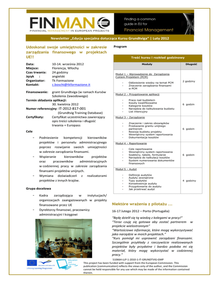 Newsletter „Edycja specjalna dotycząca Kursu Grundtviga“ | Luty 2012 Udoskonal swoje umiejętności w zakresie zarządzania finansowego w projektach UE!! Data: Miejsce: Czas trwania: Język : Organizator: Kontakt: 10-14. września 2012 Florencja, Włochy 24 godziny angielski Tk Formazione [email protected] Finansowanie: grant Grundtviga (w ramach Kursów Szkolenia Zawodowego) Termin składania aplikacji: 30. kwietnia 2012 Numer referencyjny: IT-2012-817-001 (Grundtvig Training Database) Certyfikaty: Certyfikat uczestnictwa zawierający opis treści szkolenia i długość trwania + Europass Cele - - - Podniesienie kompetencji kierowników projektów i personelu administracyjnego poprzez rozwijanie swoich umiejętności w zakresie zarządzania finansami. Wspieranie kierowników projektów oraz pracowników administracyjnych w codziennej pracy w zakresie zarządzania finansami projektów unijnych. Wymiana doświadczeń z realizatorami projektów z innych krajów. Grupa docelowa - - Kadra zarządzająca w instytucjach/ organizacjach zaangażowanych w projekty finansowane przez UE Dyrektorzy finansowi, pracownicy administracyjni I księgowi Program Treść kursu i rozkład godzinowy Moduły Długość Moduł 1 – Wprowadzenie do Zarządzania Cyklem Projektem (PCM) - Odświeżenie wiedzy na temat PCM Znaczenie zarządzania finansami w PCM 2 godziny Moduł 2 – Przygotowanie aplikacji - Praca nad budżetem Koszty kwalifikowalne Kategorie kosztów Narzędzia do kalkulowania budżetu List intencyjny 6 godzin Moduł 3 – Zarządzanie - Znaczenie i zakres obowiązków Przekazanie grantu unijnego partnerom Rewizja budżetu projektu Wewnętrzny system raportowania Dokumentacja kosztów 6 godzin Moduł 4 – Raportowanie - Cele raportowania Wewnętrzny system raportowania Szablony, tabele, formularze Narzędzia do kalkulacji kosztów System numerowania dokumentów finansowych 6 godzin Moduł 5 – Audyt - Definicje audytów Audyty zewnętrzne Typy audytów Konsekwencje audytu Przygotowanie do audytu Jak przetrwać audyt 4 godziny Niektóre wrażenia z pilotażu ... 16-17.lutego 2012 – Porto (Portugalia) “Będę dzielił się tą wiedzą z kolegami w pracy!” “Teraz czuję się gotowa aby zostać partnerem w projekcie wielostronnym” “Wartościowe informacje, które mogę wykorzystywać jako narzędzie w moich projektach.” “Kurs pomógł mi usprawnić zarządzani finansami. Szczególnie przykłady z rzeczywiście realizowanych projektów były przydatne i bardzo podoba mi się materiał, który mogę wykorzystać w codziennej pracy.” 510664-LLP-1-2010-1-IT-GRUNDTVIG-GMP This project has been funded with support from the European Commission. This publication [communication] reflects the views only of the author, and the Commission cannot be held responsible for any use which may be made of the information contained therein. Newsletter „Edycja specjalna dotycząca Kursu Grundtviga“ | Luty 2012 Rejestracja na kurs FinMana w 3 krokach… 1. Ściągnij formularz aplikacyjny ze strony FinMana (www.fin-man.eu) 2. Wyślij go razem ze swoim CV do TK Formazione (osoba kontaktowa: Pani Caterina Boschi, [email protected]) 3. Poczekaj aż otrzymasz zaproszenie (preregistration form) od instytucji organizującej Zespół projektowy FinMana czeka na ciebie! Aplikowanie o grant w 3 krokach… Kandydaci mogą aplikować o grant Grundtviga za pośrednictwem swoich Agencji Narodowych. Szczegóły aplikacji każdego z kandydatów będą indywidualnie oceniane przez Agencje. 1. 2. 3. Skontaktuj się z krajową Agencją Narodową aby otrzymać formularz zgłoszeniowy (http://www.grundtvig.org.pl/kursydoskonalenia-zawodowego) Wyślij wypełniony formularz i zaproszenie od instytucji organizującej do swojej Narodowej Agencji Poczekaj na zatwierdzenie Twojej aplikacji i skontaktuj się z instytucją organizującą aby potwierdzić swoją wstępną rezerwację (skontaktuj się z nią także jeżeli nie otrzymasz grantu) Aplikacje można składać do 30. kwietnia 2012! Zarezerwuj czas na… ...Konferencję FinMana w Grazu – 21.09.2012 Konferencja podsumowująca projekt FinMan odbędzie się w Austrii w pałacu Retzhof w Leibnitz/Leitring niedaleko Grazu. Na konferencji zostaną zaprezentowane końcowe rezultaty projektu oraz będzie możliwość przetestowania materiałów i narzędzi w praktyce. Szczegółowy program konferencji będzie niedługo dostępny! www.fin-man.eu Partnerstwo IT – Tk Formazione Srl Michela Calabrese (koordynator) [email protected] PT – SPI Ana Ribeiro [email protected] AT – E.N.T.E.R. Petra Kampf [email protected] CZ – Euroface Consulting s.r.o Jana Dorotikova [email protected] UK – Castlereagh Enterprises Ltd Sean Keenan [email protected] PL – University of Lodz Marcin Podogrocki [email protected] 510664-LLP-1-2010-1-IT-GRUNDTVIG-GMP This project has been funded with support from the European Commission. This publication [communication] reflects the views only of the author, and the Commission cannot be held responsible for any use which may be made of the information contained therein.
