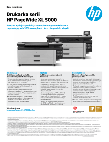 Dane techniczne Drukarka serii HP PageWide XL 5000 Potężna wydajna produkcja monochromatyczno-kolorowa zapewniająca do 30% oszczędności kosztów produkcyjnych1 PRZEWAGA Krótki czas realizacji wydruków monochromatycznych i kolorowych Szybki kolor, doskonała jakość dokumentu ROZWÓJ OSZCZĘDNOŚCI •Prędkość druku nawet do 14 stron formatu A1/D, krótkie oczekiwanie na wyjście pierwszej strony — 30 sekund •O 50% szybsze przygotowywanie wydruków monochromatycznych i kolorowych na jednym urządzeniu2 •O połowę krótszy czas oczekiwania na rozpoczęcie wydruku3— ultraszybki procesor, natywne zarządzanie PDF, oprogramowanie HP SmartStream •Brak potrzeby operatora — układarka produkcyjna/składarka z obsługą online4 — do 4 rol, dwa zasobniki atramentu z automatycznym przełącznikiem •Generowanie dalszego rozwoju firmy — możliwość drukowania map GIS i materiałów promocyjnych z niewyobrażalną szybkością •Czyste linie, drobne szczegóły i płynne przejścia skali szarości wyznaczają nowe standardy techniczne wydruku dokumentów, które biją nawet standardy wydruku drukarkami LED5 •Atrament pigmentowy HP PageWide XL zapewnia głęboką czerń, żywe kolory, odporność na wilgoć/blaknięcie — nawet w przypadku papieru dokumentowego niepowlekanego6 •Wydruk na szerokiej gamie nośników do 101,6 cm/40 cali — spełnienie norm technicznych i offsetowych ISO/USA7 •Wydruk monochromatycznych i kolorowych dokumentów technicznych przy jednakowych lub niższych kosztach w stosunku do porównywalnych drukarek LED8 •Realizacja wszystkich tych zadań na jednym, zapewniającym oszczędność miejsca, urządzeniu do druku monochromatycznego i kolorowego lub wybór urządzenia wielofunkcyjnego do drukowania/ skanowania/kopiowania •Redukcja kosztów przygotowania pracy i wykończenia nawet o 50%2 •Nawet 5-krotnie mniejsze zużycie energii niż w przypadku porównywalnych drukarek LED9 Obniżenie całkowitych kosztów produkcji do 30%1 Więcej na stronie hp.com/go/pagewidexl/5000series Oszczędności kosztów produkcji na podstawie porównania drukarki HP PageWide XL 5000 z instalacją składającą się z jednej średnionakładowej drukarki monochromatycznej LED i jednej średnionakładowej kolorowej drukarki produkcyjnej (z czego obie kosztują poniżej 40 000 dolarów amerykańskich) wg stanu na kwiecień 2015. W kosztach produkcji uwzględniono koszty materiałów eksploatacyjnych i serwisu, koszty zasilania drukarki i koszty operatora. Kryteria testu można znaleźć pod adresem hp.com/go/pagewidexlclaims. 2 Na podstawie wewnętrznych testów HP na drukarce HP PageWide XL 5000 w porównaniu do przygotowywania i wydruku zadania na dwóch różnych drukarkach (jedna analogiczna monochromatyczna średnionakładowa drukarka LED do stron monochromatycznych i jedna drukarka kolorowa do stron kolorowych). Kryteria testu można znaleźć pod adresem hp.com/go/pagewidexlclaims. 3 Przy użyciu oprogramowania HP SmartStream w porównaniu do analogicznych programów. Kryteria testu można znaleźć pod adresem hp.com/go/pagewidexlclaims. 4 Składarka HP PageWide XL jest akcesorium opcjonalnym. Wysokopojemnościowa układarka HP PageWide XL może być akcesorium opcjonalnym. Opcje mogą różnić się w zależności od regionu. 5 W przypadku rezultatu uzyskiwanego za pomocą drukarki HP PageWide XL i drukarek LED innych producentów, które stanowią ponad 50% rocznych dostaw drukarek LED w Ameryce Północnej wg stanu na dzień 2014 wg IDC. Kryteria testu można znaleźć pod adresem hp.com/go/pagewidexlclaims. 6 W porównaniu do wydruków wykonanych atramentami HP 970/971/980 charakteryzującymi się odpornością na blaknięcie i wilgoć zgodnie z normą ISO 11798 opisującą metody testowania trwałości i wytrzymałości w poligrafii. Kryteria testu można znaleźć pod adresem hp.com/go/pagewidexlclaims. 7 Techniczne i offsetowe normy ISO/USA to m.in. normy amerykańskiego instytutu ANSI, normy określające wymiary arkuszy typu Architectural, norma ISO A dot. dokumentów technicznych i norma ISO B dot. rozmiaru arkuszy w druku offsetowym. 8 Na podstawie kosztów materiałów eksploatacyjnych i serwisu. Koszty wydruku monochromatycznych dokumentów technicznych dla porównywalnych średnionakładowych drukarek LED na podstawie drukarek do wielkoformatowego wydruku dokumentów technicznych przy prędkościach między 8 i 13 stronami w formacie D/A1 na minutę wg stanu na kwiecień 2015, co stanowi ponad 80% ogółu średnionakładowych drukarek LED w Stanach Zjednoczonych i Europie w 2014 wg IDC. Koszty wydruku kolorowych dokumentów technicznych dla porównywalnych średnionakładowych drukarek kolorowych na podstawie drukarek o wydajności pozwalającej na wydruk co najmniej 4 stron formatu D/A1 na minutę tańszych niż 50 000 dolarów amerykańskich do druku wielkoformatowego dokumentów technicznych wg stanu na kwiecień 2015, co stanowi ponad 80% ogółu rynku w Stanach Zjednoczonych i Europie w 2014 wg IDC. Kryteria testu można znaleźć pod adresem hp.com/go/pagewidexlclaims. 9 Wnioski wyciągnięte z testów wewnętrznych HP przeprowadzonych w odniesieniu do konkretnego scenariusza użycia. Porównywalne drukarki LED na podstawie drukarek LED o wydajności pozwalającej na wydruk od 8 do 13 stron formatu D/A1 na minutę, które stanowią ponad 80% ogółu średnionakładowych drukarek LED w Stanach Zjednoczonych i Europie wg IDC wg stanu na kwiecień 2015. Kryteria testu można znaleźć pod adresem hp.com/go/pagewidexlclaims. 1 Dane techniczne | Drukarka serii HP PageWide XL 5000 Połączenie procesów pozwala pobić rekord czasu realizacji zadań — przygotowywanie zestawów monochromatycznokolorowych w czasie o połowę krótszym.2 Oszczędność nawet 30% ogólnych kosztów produkcyjnych.1 Oszczędność miejsca i redukcja kosztów produkcyjnych dzięki jednemu urządzeniu do druku monochromatycznego i kolorowego lub drukowanie/ska