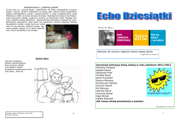 Wspomnienia z „zielonej szkoły” W tym roku na „zieloną szkołę „ pojechaliśmy do Wisły, mieszkaliśmy w dużym hotelu o nazwie „Krokus” położonym na zboczu góry. Oprócz lekcji zwiedzaliśmy zabytki odwiedzaliśmy muzea, uczestniczyliśmy w lekcji zorganizowanej przez bibliotekę w Wiśle na temat Janusza Korczaka. Najciekawsze miejsca tej miejscowości poznaliśmy jeżdżąc „bajeczną ciuchcią” po dzielnicach Wisły. Każdego wieczoru mieliśmy okazje potańczyć, zaprezentować swój talent, wykazać się umiejętnościami sportowymi. Nasz dzień był wypełniony różnymi zajęciami dlatego zasypialiśmy szybko i ciężko było nam wstać rano. Po raz pierwszy mięliśmy okazję spożywać posiłek inaczej niż w latach poprzednich, znowu poznaliśmy coś nowego. Nr 53. VI 2012 r. Obchody 30 rocznicy nadania imienia naszej szkole. (Ciąg dalszy na stronie 2) Dzień Ojca Tatusiowi Drogiemu Zawsze uśmiechniętemu Dużo życzymy radości I dni pełnych miłości Szczęściem wypełnionych chwil A do pracy… dużo sił! Uczniowie kończący klasę szóstą w roku szkolnym 2011/2012 Piechota Roksana Kapała Dawid Olszewski Piotr Tomala Denis Gorol Krzysztof Pawlus Marzena Smolarczyk Sandra Jonczyk Daniel Kij Patrycja Ulanicki Kamil Chromik Daniel Hajk Michał Hatala Wojciech Jak naszą szkołę pozostawią w pamięci (Ciąg dalszy na stronie 3) Gazetkę redagują: G Bartusek, A Kowalska, M Lipska z klasami. 4 1 (Ciąg dalszy ze strony 1) (Ciąg dalszy ze strony 1) 1 czerwca w Dzień Dziecka odbył się festyn połączony z obchodami 30–stej rocznicy nadania szkole imienia Janusza Korczaka. Rok 2012 ogłoszony został przez Sejm RP rokiem Janusza Korczaka. Od jego tragicznej śmierci w obozie zagłady w Treblince mija 70 lat. Uroczysta akademia jaka odbyła się w szkole poświęcona była jego postaci. Na uroczystości związane z ta rocznica przybyli przedstawiciel Prezydenta Miasta, emerytowani dyrektorzy naszej szkoły proboszcz parafii z Chropaczowa, dyrektorzy szkół i przedszkoli naszego miasta i miast ościennych, sponsorzy i przyjaciele szkoły, rodzice, uczniowie innych szkół i przedszkolaki. W czasie uroczystości odsłonięto popiersie J. Korczaka. Jego wizerunek istniej w szkole od 30 lat —jednak został odnowiony, odrestaurowany i przeniesiony na inną ścianę. Nasz patron zrobił wiele dla dzieci walczył o nie, pisał o nich i dla nich, poświęcił to co najcenniejsze życie. Ten wybitny pedagog i opiekun dzieci pozostawił nam zadanie do wykonania —troskę o dziecko. Staramy się realizować to zadanie poprzez ; redagowanie z dziećmi gazetki szkolnej „Echo Dziesiątki”, które trwa już 10 lat, realizujemy projekty, które pozwalają na doposażanie szkoły w pomoce i środki dydaktyczne, sprzęt rehabilitacyjny, audiowizualny, organizacje ciekawych wycieczek( które uczą i wypełniają czas wolny uczniów. zabieramy dzieci każdego roku na „zieloną szkołę” tam mają okazję do czynnego wypoczynku, poznawania pięknych zakątków Polski (często są to jedyne wyjazdy poza miasto Świętochłowice) bierzemy udział w działaniach na rzecz środowiska zbierając surowce wtórne( od kilku lat zdobywamy I miejsce w mieście) organizujemy kiermasze na których można kupić wytwory rąk naszych dzieci, w ramach wychowania patriotycznego dzieci opiekują się miejscami pamięci ludzi zasłużonych dla miasta. 15 czerwca po raz drugi odbył się Festyn Europejski. W tym roku uczniowie w scence przedstawili sytuacje gospodarcza niektórych krajów UE. Na festyn przyjechali przedstawiciele Regionalnego Centrum Informacji Europejskiej z Katowic , którzy przeprowadzili konkurs wiedzy oraz plastyczny. 21 czerwca zorganizowany został festyn z okazji Dnia Godności Osób Niepełnosprawnych Intelektualnie. Pogoda zdecydowała, że zamiast do MDK przy ul. Harcerskiej, młodzież po uroczystej mszy św. przyszła na teren naszej szkoły. Festyn odbył się częściowo w budynku szkoły a częściowo na boisku szkolnym. Była zjeżdżalnia , wojowie, konkurs plastyczny, sportowy, zabawy przy muzyce, no i oczywiście poczęstunek, ciasto i kiełbasa z grilla. 2 Marzena— do tej szkoły zaczęłam chodzić od klasy III. Czułam się w tej szkole bardzo dobrze, nauka szła mi łatwiej niż w szkole poprzedniej. Łatwiej było mi nawiązać kontakty z rówieśnikami, bardzo lubiłam wyjazdy na „zieloną szkołę”. Najbardziej podobała mi się „zielona szkoła” w Brennej. Uzbierałam kilka dyplomów za udział w konkursach zwłaszcza plastycznych. Żal mi odchodzić. Chcę w przyszłości zostać fryzjerką. Będę tu przychodziła. Krzysztof— do naszej szkoły zacząłem chodzić w klasie IV. W tej szkole łatwiej mi szło. Dużym autorytetem dla mnie jest moja wychowawczyni, podawała mi zawsze rękę w trudnych chwilach, nigdy jej nie zapomnę. Fajnie było na „zielonej szkole” w Brennej i Wiśle. Zżyłem się z klasą. Żal mi odchodzić. W przyszłości chciałbym zostać górnikiem. Sandra— do tej szkoły chodzę od klasy I. Podoba mi się szkoła, jest wyremontowana, czysta. W szkole mam wiele koleżanek i kolegów. Uzbierałam wiele dyplomów za udziały w konkursach, najwięcej w plastycznych. Brałam udział w projektach Szkoła szans jeździłam na wiele wycieczek i co roku na „zieloną szkołę”. Będę odwiedzać szkołę, żal mi odchodzić. W przyszłości chcę zostać fryzjerką– więc musze iść do gimnazjum. Daniel —do naszej szkoły zacząłem chodzić w klasie V. W szkole się dowartościowałem. Mam wielu kolegów i koleżanek. Wspominam bardzo dobrze wyjazdy na „zieloną szkołę”. Trochę żal mi odchodzić. Lubię pracować fizycznie. Roksana —do naszej szkoły zaczęłam chodzić w klasie IV. Będę wspominać mile wielu nauczycieli a najbardziej moją wychowawczynię (Pani nasza). Będę odwiedzać szkołę – wiem że muszę iść do gimnazjum. Cieszyłam się zawsze na wyjazd na 