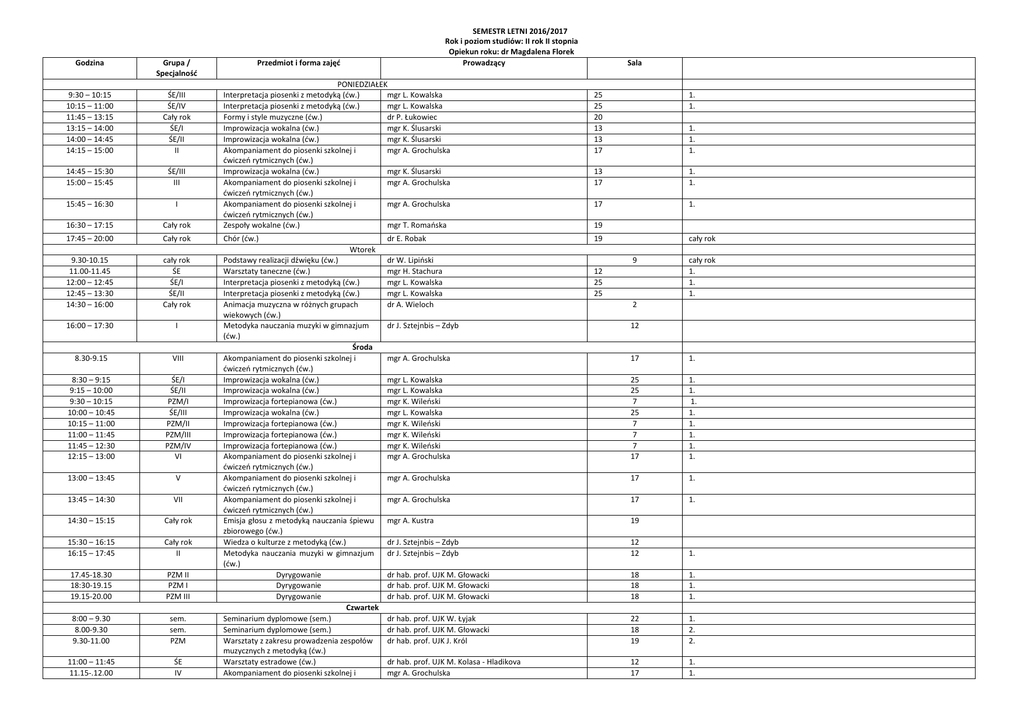 SEMESTR LETNI 2016/2017 Rok i poziom studiów: II rok II stopnia Opiekun roku: dr Magdalena Florek Prowadzący Godzina Grupa / Specjalność Przedmiot i forma zajęć 9:30 – 10:15 10:15 – 11:00 11:45 – 13:15 13:15 – 14:00 14:00 – 14:45 14:15 – 15:00 ŚE/III ŚE/IV Cały rok ŚE/I ŚE/II II 14:45 – 15:30 15:00 – 15:45 ŚE/III III 15:45 – 16:30 I 16:30 – 17:15 Cały rok PONIEDZIAŁEK Interpretacja piosenki z metodyką (ćw.) mgr L. Kowalska Interpretacja piosenki z metodyką (ćw.) mgr L. Kowalska Formy i style muzyczne (ćw.) dr P. Łukowiec Improwizacja wokalna (ćw.) mgr K. Ślusarski Improwizacja wokalna (ćw.) mgr K. Ślusarski Akompaniament do piosenki szkolnej i mgr A. Grochulska ćwiczeń rytmicznych (ćw.) Improwizacja wokalna (ćw.) mgr K. Ślusarski Akompaniament do piosenki szkolnej i mgr A. Grochulska ćwiczeń rytmicznych (ćw.) Akompaniament do piosenki szkolnej i mgr A. Grochulska ćwiczeń rytmicznych (ćw.) Zespoły wokalne (ćw.) mgr T. Romańska 17:45 – 20:00 Cały rok Chór (ćw.) Sala 25 25 20 13 13 17 1. 1. 13 17 1. 1. 17 1. 1. 1. 1. 19 dr E. Robak 19 dr W. Lipiński mgr H. Stachura mgr L. Kowalska mgr L. Kowalska dr A. Wieloch 12 25 25 cały rok Wtorek 9.30-10.15 11.00-11.45 12:00 – 12:45 12:45 – 13:30 14:30 – 16:00 cały rok ŚE ŚE/I ŚE/II Cały rok 16:00 – 17:30 I 8.30-9.15 VIII 8:30 – 9:15 9:15 – 10:00 9:30 – 10:15 10:00 – 10:45 10:15 – 11:00 11:00 – 11:45 11:45 – 12:30 12:15 – 13:00 ŚE/I ŚE/II PZM/I ŚE/III PZM/II PZM/III PZM/IV VI 13:00 – 13:45 V 13:45 – 14:30 VII 14:30 – 15:15 Cały rok 15:30 – 16:15 16:15 – 17:45 Cały rok II 17.45-18.30 18:30-19.15 19.15-20.00 PZM II PZM I PZM III 8:00 – 9.30 8.00-9.30 9.30-11.00 sem. sem. PZM 11:00 – 11:45 11.15-.12.00 ŚE IV Podstawy realizacji dźwięku (ćw.) Warsztaty taneczne (ćw.) Interpretacja piosenki z metodyką (ćw.) Interpretacja piosenki z metodyką (ćw.) Animacja muzyczna w różnych grupach wiekowych (ćw.) Metodyka nauczania muzyki w gimnazjum (ćw.) Środa Akompaniament do piosenki szkolnej i ćwiczeń rytmicznych (ćw.) Improwizacja wokalna (ćw.) Improwizacja wokalna (ćw.) Improwizacja fortepianowa (ćw.) Improwizacja wokalna (ćw.) Improwizacja fortepianowa (ćw.) Improwizacja fortepianowa (ćw.) Improwizacja fortepianowa (ćw.) Akompaniament do piosenki szkolnej i ćwiczeń rytmicznych (ćw.) Akompaniament do piosenki szkolnej i ćwiczeń rytmicznych (ćw.) Akompaniament do piosenki szkolnej i ćwiczeń rytmicznych (ćw.) Emisja głosu z metodyką nauczania śpiewu zbiorowego (ćw.) Wiedza o kulturze z metodyką (ćw.) Metodyka nauczania muzyki w gimnazjum (ćw.) Dyrygowanie Dyrygowanie Dyrygowanie Czwartek Seminarium dyplomowe (sem.) Seminarium dyplomowe (sem.) Warsztaty z zakresu prowadzenia zespołów muzycznych z metodyką (ćw.) Warsztaty estradowe (ćw.) Akompaniament do piosenki szkolnej i 9 cały rok 1. 1. 1. 2 dr J. Sztejnbis – Zdyb 12 mgr A. Grochulska 17 1. mgr L. Kowalska mgr L. Kowalska mgr K. Wileński mgr L. Kowalska mgr K. Wileński mgr K. Wileński mgr K. Wileński mgr A. Grochulska 25 25 7 25 7 7 7 17 1. 1. 1. 1. 1. 1. 1. 1. mgr A. Grochulska 17 1. mgr A. Grochulska 17 1. mgr A. Kustra 19 dr J. Sztejnbis – Zdyb dr J. Sztejnbis – Zdyb 12 12 1. dr hab. prof. UJK M. Głowacki dr hab. prof. UJK M. Głowacki dr hab. prof. UJK M. Głowacki 18 18 18 1. 1. 1. dr hab. prof. UJK W. Łyjak dr hab. prof. UJK M. Głowacki dr hab. prof. UJK J. Król 22 18 19 1. 2. 2. dr hab. prof. UJK M. Kolasa - Hladikova mgr A. Grochulska 12 17 1. 1. 14.00-15.30 15.30-16.15 16.15-17.00 sem. I II 9.00 – 9.45 I ćwiczeń rytmicznych (ćw.) Seminarium dyplomowe Interpretacja piosenki z metodyką (ćw) Interpretacja piosenki z metodyką (ćw) dr hab. prof. UJK M. Kolasa - Hladikova dr hab. prof. UJK M. Kolasa - Hladikova dr hab. prof. UJK M. Kolasa - Hladikova 22 25 25 1. 1. 1. dr E. Robak 15 1. Piątek Dyrygowanie (ćw.) Zajęcia realizowane w cyklu 10-tygodniowym w roku akad. 2016/2017 Semestr zimowy Zajęcia 1. 2. 3. 4. 5. 6. 7. 8. 9. 10. Akompaniament do piosenki szkolnej i ćwiczeń rytmicznych Improwizacja organowa Improwizacja fortepianowa Improwizacja wokalna Semestr letni 27 II – 3 III 20 III – 24 III 27 III – 31 III 3 IV – 7 IV 24 IV – 28 IV 8 V – 12 V 15 V – 19 V 22 V – 26 V 29 V – 2 VI 5 VI – 9 VI