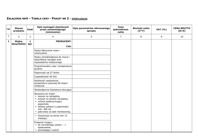 ZAŁĄCZNIK NR4 – TABELA CENY - PAKIET NR 2 – STERYLIZACJA l.p. Nazwa produktu Ilość Opis wymagań stawianych przez zamawiającego (minimalne) Opis parametrów oferowanego sprzętu Cena jednostkowa netto Wartość netto [3*7] VAT (%) CENA BRUTTO [8+9] 1 2 3 4 5 7 8 9 10 1 Myjka, 1 dezynfektor kpl. PRODUCENT: TYP: Myjka fabrycznie nowa – nieużywana Myjka ultradźwiękowa do mycia i dezynfekcji narzędzi oraz wyposażenia medycznego Programowalny czas i temperatura grzania Pojemność od 27 litrów Częstotliwość 40 kHz Możliwość nastawienia temperatury powyżej 60 stopni Celsjusza Wodoodporna klawiatura sterująca Akcesoria do myjki: koszyk na narzędzia, koszyk na drobne narzędzia, uchwyt podtrzymujący pojemniki, zlewka szklana o pojemności min. 300 ml, pokrywka ze stali nierdzewnej, Gwarancja na okres min 12 miesięcy Preparat myjący: do normalnego użytku – 1 opakowanie, pozwalający czyścić zatłuszczone powierzchnie – 1 opakowanie pozwalający usuwać osady wapienne – 1 opakowanie, pozwalający usuwać osady z cementu – 1 opakowanie, Razem pozycja 1 do przeniesienia do formularza oferty: 2 Autoklaw 3 kpl. PRODUCENT: TYP: Autoklaw fabrycznie nowy – nieużywany Autoklaw do sterylizacji nasyconą parą wodną opakowanych i nieopakowanych narzędzi medycznych gładkich i wydrążonych (typ A i B), porowatych materiałów (bawełna), szkła i gumy. Sterowanie wszystkimi funkcjami i kontrola przez mikroprocesor Próżnia wstępna wytwarzana pompą próżniową od 0,8 bara Próżnia frakcyjna wytwarzana pompą próżniową od 0,8 bara Suszenie przy pomocy pompy próżniowej od 0,8 bara Wstępne podgrzanie Filtr bakteriologiczny zasysanego do komory powietrza, Akustyczny sygnał nieprawidłowości i alarmów, Wyświetlacz w języku polskim pokazujący ilość cykli, informujący o błędach i alarmach, Komora sterylizacyjna i rama ze stali nierdzewnej - gwarancja minimum 10 lat, Pomiar temperatury termoelementem, Automatyczne elektromagnetyczne zamykanie drzwi po rozpoczęciu cyklu i w każdym innym przypadku gdy ciśnienie w komorze wzrośnie do 0,2 bara 2 programy sterylizacji, w temp. 121oC 4 programy sterylizacji, w temp. 134oC Program , w którym istnieje możliwość modyfikacji zarówno w zakresie temperatury i czasu sterylizacji, jak również czasu suszenia Programy testowe "Bowie & Dick Test", "Vacuum Test", ”Helix Test” Możliwość opcjonalna identyfikacji użytkownika oraz zapisu danych na karcie Pobór wody destylowanej ze zbiornika umieszczonego wewnątrz autoklawu lub poprzez demineralizator Praca autoklawu w ruchu ciągłym bez konieczności zachowania przerw między procesami Pojemność komory 23-24 litry Wewnętrzne zbiorniki wody litry 3,1 Tace na narzędzia 3 szt. Zasilanie 230 V 50 Hz Moc 2800 W Ciężar wsadu narzędzi do 7,5 kg Ciężar wsadu materiałów opatrunkowych od 2,2 kg Destylarka o wydajności 0,7 litra/godzinę z elementem grzewczym bez kontaktu z wodą Wbudowana drukarka Demineralizator Gwarancja na okres min 12 miesięcy Razem pozycja 2 do przeniesienia do formularza oferty: Razem pozycja 1+ 2 do przeniesienia do formularza oferty: Uwaga: Odpowiedź Wykonawcy „Nie” w kolumnie „Opis parametrów oferowanego sprzętu” tabeli uznane zostanie jako niespełnienie warunków granicznych i spowoduje odrzucenie oferty. .......................................... (miejscowość i data) …….......……………………………………………………………………….. (podpis prawomocnych przedstawicieli Wykonawcy)