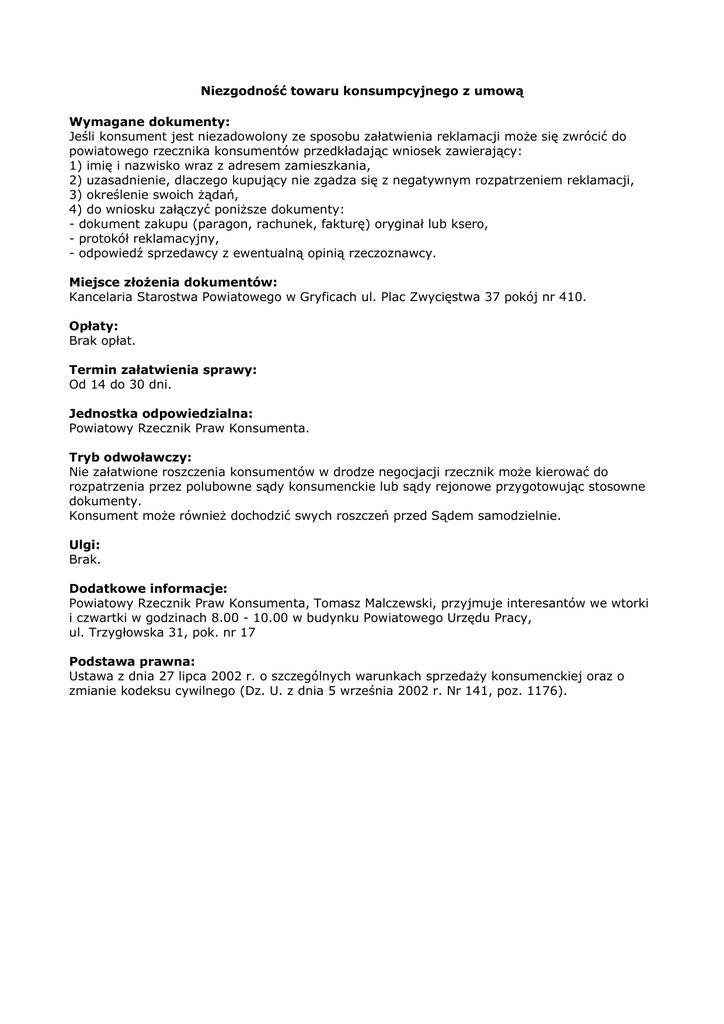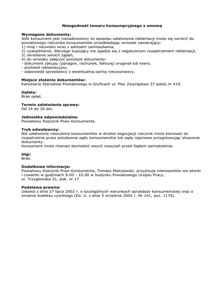 Niezgodność towaru konsumpcyjnego z umową Wymagane dokumenty: Jeśli konsument jest niezadowolony ze sposobu załatwienia reklamacji może się zwrócić do powiatowego rzecznika konsumentów przedkładając wniosek zawierający: 1) imię i nazwisko wraz z adresem zamieszkania, 2) uzasadnienie, dlaczego kupujący nie zgadza się z negatywnym rozpatrzeniem reklamacji, 3) określenie swoich żądań, 4) do wniosku załączyć poniższe dokumenty: - dokument zakupu (paragon, rachunek, fakturę) oryginał lub ksero, - protokół reklamacyjny, - odpowiedź sprzedawcy z ewentualną opinią rzeczoznawcy. Miejsce złożenia dokumentów: Kancelaria Starostwa Powiatowego w Gryficach ul. Plac Zwycięstwa 37 pokój nr 410. Opłaty: Brak opłat. Termin załatwienia sprawy: Od 14 do 30 dni. Jednostka odpowiedzialna: Powiatowy Rzecznik Praw Konsumenta. Tryb odwoławczy: Nie załatwione roszczenia konsumentów w drodze negocjacji rzecznik może kierować do rozpatrzenia przez polubowne sądy konsumenckie lub sądy rejonowe przygotowując stosowne dokumenty. Konsument może również dochodzić swych roszczeń przed Sądem samodzielnie. Ulgi: Brak. Dodatkowe informacje: Powiatowy Rzecznik Praw Konsumenta, Tomasz Malczewski, przyjmuje interesantów we wtorki i czwartki w godzinach 8.00 - 10.00 w budynku Powiatowego Urzędu Pracy, ul. Trzygłowska 31, pok. nr 17 Podstawa prawna: Ustawa z dnia 27 lipca 2002 r. o szczególnych warunkach sprzedaży konsumenckiej oraz o zmianie kodeksu cywilnego (Dz. U. z dnia 5 września 2002 r. Nr 141, poz. 1176).