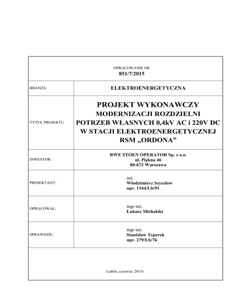 OPRACOWANIE NR 851/7/2015 BRANŻA ELEKTROENERGETYCZNA PROJEKT WYKONAWCZY TYTUŁ PROJEKTU INWESTOR: MODERNIZACJI ROZDZIELNI POTRZEB WŁASNYCH 0,4kV AC i 220V DC W STACJI ELEKTROENERGETYCZNEJ RSM „ORDONA” RWE STOEN OPERATOR Sp. z o.o. ul. Piękna 46 00-672 Warszawa PROJEKTANT: inż. Włodzimierz Szyszłow upr. 1344/Lb/91 OPRACOWAŁ: mgr inż. Łukasz Michalski SPRAWDZIŁ: mgr inż. Stanisław Teperek upr. 279/Lb/76 Lublin, czerwiec 2015r. 2. UWAGI I DECYZJE CZYNNIKÓW KONTROLI ORAZ ZATWIERDZANIA Oprac. 851/7/2015 PROJEKT WYKONAWCZY MODERNIZACJI ROZDZIELNI POTRZEB WŁASNYCH 0,4 kV AC i 220 V DC W STACJI ELEKTROENERGETYCZNEJ RSM „ORDONA” str. 2 3. SPIS OPRACOWAĆ str. 3 1. Oprac. 851/1/2015 - Projekt wykonawczy modernizacji rozdzielni potrzeb własnych 220V DC w stacji elektroenergetycznej 110/15kV RPZ „GDAŃSKA” 2. Oprac. 851/2/2015 - Projekt wykonawczy modernizacji rozdzielni potrzeb własnych 0,4 kV AC w stacji elektroenergetycznej 110/15kV RPZ „MIRÓW” 3. Oprac. 851/3/2015 - Projekt wykonawczy modernizacji rozdzielni potrzeb własnych 0,4 kV AC i 220V DC w stacji elektroenergetycznej 110/15kV RPZ „OCHOTA” 4. Oprac. 851/4/2015 - Projekt wykonawczy modernizacji rozdzielni potrzeb własnych 0,4 kV AC i 220V DC w stacji elektroenergetycznej 110/15kV RPZ „KALISZÓWKA” 5. Oprac. 851/5/2015 - Projekt wykonawczy modernizacji rozdzielni potrzeb własnych 0,4 kV AC i 220V DC w stacji elektroenergetycznej 110/15kV RPZ „BRÓDNO” 6. Oprac. 851/6/2015 - Projekt wykonawczy modernizacji rozdzielni potrzeb własnych 220V DC w stacji elektroenergetycznej 110/15kV RPZ „SŁODOWIEC” 7. Oprac. 851/7/2015 - Projekt wykonawczy modernizacji rozdzielni potrzeb własnych 0,4 kV AC i 220V DC w stacji elektroenergetycznej RSM „ORDONA” 8. Oprac. 851/8/2015 - Projekt wykonawczy modernizacji rozdzielni potrzeb własnych 0,4 kV AC i 220V DC w stacji elektroenergetycznej „ROZDZIELNIA L” 9. Oprac. 851/9/2015 - Projekt wykonawczy tymczasowej rozdzielnicy potrzeb własnych AC i DC Oprac. 851/7/2015 PROJEKT WYKONAWCZY MODERNIZACJI ROZDZIELNI POTRZEB WŁASNYCH 0,4 kV AC i 220 V DC W STACJI ELEKTROENERGETYCZNEJ RSM „ORDONA” 4. SPIS ZAWARTOŚCI str. 4 1. Strona tytułowa str.1 2. Uwagi i decyzje czynników kontroli i zatwierdzania str.2 3. Spis opracowań str.3 4. Spis zawartości str.4 5. Opis techniczny str.5/1÷5/10 6. Zestawienie materiałów str.6/1÷6/2 7. Spis rysunków str.7/1÷7/2 Oprac. 851/7/2015 PROJEKT WYKONAWCZY MODERNIZACJI ROZDZIELNI POTRZEB WŁASNYCH 0,4 kV AC i 220 V DC W STACJI ELEKTROENERGETYCZNEJ RSM „ORDONA” 5. OPIS TECHNICZNY str. 5/1 5.1. Przedmiot opracowania Przedmiotem niniejszego opracowania jest projekt wykonawczy modernizacji potrzeb własnych 400/230V AC i 220 V DC w stacji elektroenergetycznej RSM „ORDONA” w Warszawie. 5.2. Podstawa opracowania Podstawę techniczną opracowania dokumentacji technicznej stanowią: a) inwentaryzacja stanu istniejącego, b) opracowane przez RWE STOEN Operator Warszawa wymagania ofertowe na modernizację potrzeb własnych AC i DC nr FZ-Z/P076/15, c) notatka służbowa spisana w dniu 29.05.2015, d) aktualne przepisy i normy dotyczące stacji elektroenergetycznych, 5.3. Zakres opracowania Zakres niniejszego opracowania obejmuje: a) wymianę istniejących rozdzielnic potrzeb własnych 400/230 V AC, 50Hz oraz 220 V DC, b) dobór urządzeń rozdzielnicy potrzeb własnych 400/230 V AC oraz 220 V DC, c) powiązania kablowe do rozdzielnicy potrzeb własnych 400/230 V AC oraz 220 V DC, d) wytyczne realizacji przebudowy, e) demontaż istniejących urządzeń, f) wytyczne budowlane. 5.4. Rozdzielnice potrzeb własnych 400/230 V AC i 220 V DC – stan istniejący Istniejąca rozdzielnica potrzeb własnych 400/230V AC złożona z jednej wolnostojącej szafy, umieszczonej w pomieszczeniu nastawni. Zasilana jest z trzech transformatorów potrzeb własnych 15/0,4 kV o mocy 50 kVA każdy. Szafa rozdzielni ~0,4 kV przeznaczona jest w całości do demontażu, natomiast istniejący transformatory 15/0,4 kV będą zasilać nową rozdzielnicę potrzeb własnych 400/230 V AC. Istniejąca rozdzielnica 220 V DC złożona z jednej wolnostojącej szafy, umieszczonej w pomieszczeniu nastawni, obok rozdzielnicy ~0,4 kV. Zasilana jest z trzech prostowników typu PBI 220/30 CW, wiszących na ścianie w nastawni. Rozdzielnica 220V DC oraz istniejące prostowniki 220 V DC przeznaczone są w całości do demontażu. Oprac. 851/7/2015 PROJEKT WYKONAWCZY MODERNIZACJI ROZDZIELNI POTRZEB WŁASNYCH 0,4 kV AC i 220 V DC W STACJI ELEKTROENERGETYCZNEJ RSM „ORDONA” 5. OPIS TECHNICZNY str. 5/2 5.5. Potrzeby własne prądu przemiennego 400/230 V – FA1÷FA2 – stan projektowany 5.5.1. Struktura i przeznaczenie Potrzeby własne prądu przemiennego 400/230V; 50Hz stacji elektroenergetycznej RSM „ORDONA” przeznaczone są do zasilania: − trzech prostowników 220 V DC, zainstalowanych w szafie FC3; − obwodów pomocniczych rozdzielni 15kV; − szafy telemechaniki EX; − rozdzielnicy głównej instalacji elektrycznych oraz instalacji ogrzewania w budynku stacji; Struktura wewnętrzna rozdzielnicy FA1÷FA2 obejmuje: − obwody główne – jedna sekcja z trzema polami zasilającymi; − obwody sterowania lokalnego i automatyki SZR w oparciu o cyfrowy zespół SZR typu e2TANGO-800; − obwody pomiaru energii elektrycznej oraz parametrów elektrycznych (prąd, napięcie) w polach zasilających nr 01, 02, 03; − obwody sygnalizacji lokalnej; 5.5.2. Układ zasilania Rozdzielnica potrzeb własnych prądu przemiennego 0,4 kV zostanie zasilona trzema liniami kablowymi ~0,4 kV typu YKYżu 5×35mm2 z istniejących transformatorów potrzeb własnych 15/0,4 kV, 50 kVA, zgodnie ze schematem zasilania przedstawionym na rys. K3-21801. 5.5.3. Charakterystyka techniczna rozdzielnicy – FA1- FA3 Rozdzielnicę potrzeb własnych prądu przemiennego wykonana zostanie jako prefabrykat składający się z dwóch szaf. Oszynowanie rozdzielnicy zaprojektowano na bazie system