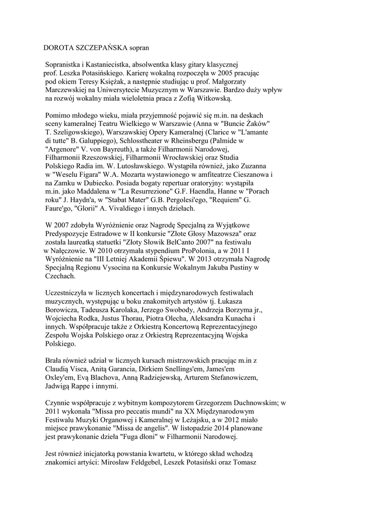 DOROTA SZCZEPAŃSKA sopran Sopranistka i Kastaniecistka, absolwentka klasy gitary klasycznej prof. Leszka Potasińskiego. Karierę wokalną rozpoczęła w 2005 pracując pod okiem Teresy Księżak, a następnie studiując u prof. Małgorzaty Marczewskiej na Uniwersytecie Muzycznym w Warszawie. Bardzo duży wpływ na rozwój wokalny miała wieloletnia praca z Zofią Witkowską. Pomimo młodego wieku, miała przyjemność pojawić się m.in. na deskach sceny kameralnej Teatru Wielkiego w Warszawie (Anna w "Buncie Żaków" T. Szeligowskiego), Warszawskiej Opery Kameralnej (Clarice w "L'amante di tutte" B. Galuppiego), Schlosstheater w Rheinsbergu (Palmide w "Argenore" V. von Bayreuth), a także Filharmonii Narodowej, Filharmonii Rzeszowskiej, Filharmonii Wrocławskiej oraz Studia Polskiego Radia im. W. Lutosławskiego. Wystąpiła również, jako Zuzanna w "Weselu Figara" W.A. Mozarta wystawionego w amfiteatrze Cieszanowa i na Zamku w Dubiecko. Posiada bogaty repertuar oratoryjny: wystąpiła m.in. jako Maddalena w "La Resurrezione" G.F. Haendla, Hanne w "Porach roku" J. Haydn'a, w "Stabat Mater" G.B. Pergolesi'ego, "Requiem" G. Faure'go, "Glorii" A. Vivaldiego i innych dziełach. W 2007 zdobyła Wyróżnienie oraz Nagrodę Specjalną za Wyjątkowe Predyspozycje Estradowe w II konkursie "Złote Głosy Mazowsza" oraz została laureatką statuetki "Złoty Słowik BelCanto 2007" na festiwalu w Nałęczowie. W 2010 otrzymała stypendium ProPolonia, a w 2011 I Wyróżnienie na "III Letniej Akademii Śpiewu". W 2013 otrzymała Nagrodę Specjalną Regionu Vysocina na Konkursie Wokalnym Jakuba Pustiny w Czechach. Uczestniczyła w licznych koncertach i międzynarodowych festiwalach muzycznych, występując u boku znakomitych artystów tj. Łukasza Borowicza, Tadeusza Karolaka, Jerzego Swobody, Andrzeja Borzyma jr., Wojciecha Rodka, Justus Thorau, Piotra Olecha, Aleksandra Kunacha i innych. Współpracuje także z Orkiestrą Koncertową Reprezentacyjnego Zespołu Wojska Polskiego oraz z Orkiestrą Reprezentacyjną Wojska Polskiego. Brała również udział w licznych kursach mistrzowskich pracując m.in z Claudią Visca, Anitą Garancia, Dirkiem Snellings'em, James'em Oxley'em, Evą Blachova, Anną Radziejewską, Arturem Stefanowiczem, Jadwigą Rappe i innymi. Czynnie współpracuje z wybitnym kompozytorem Grzegorzem Duchnowskim; w 2011 wykonała "Missa pro peccatis mundi" na XX Międzynarodowym Festiwalu Muzyki Organowej i Kameralnej w Leżajsku, a w 2012 miało miejsce prawykonanie "Missa de angelis". W listopadzie 2014 planowane jest prawykonanie dzieła "Fuga dłoni" w Filharmonii Narodowej. Jest również inicjatorką powstania kwartetu, w którego skład wchodzą znakomici artyści: Mirosław Feldgebel, Leszek Potasiński oraz Tomasz Strahl. Zespół wykonuje muzykę kompozytorów hiszpańskich, włoskich i argentyńskich. W repertuarze operowym, sopranistka specjalizuje się głównie w dziełach epoki baroku i klasycyzmu. Z wielką pasją wykonuje muzykę hiszpańską, grając przy tym na małych instrumentach perkusyjnych. Chętnie sięga również do repertuaru rozrywkowego - w tym szczególnie jazzowego i musicalowego.