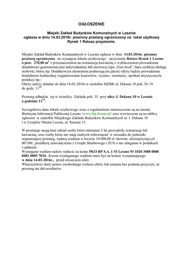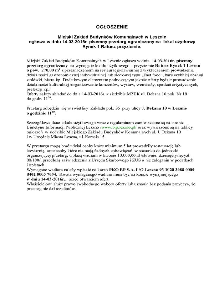 OGŁOSZENIE Miejski Zakład Budynków Komunalnych w Lesznie ogłasza w dniu 14.03.2016r. pisemny przetarg ograniczony na lokal użytkowy Rynek 1 Ratusz przyziemie. Miejski Zakład Budynków Komunalnych w Lesznie ogłasza w dniu 14.03.2016r. pisemny przetarg ograniczony na wynajęcie lokalu użytkowego – przyziemie Ratusz Rynek 1 Leszno o pow. 270,00 m2 z przeznaczeniem na restaurację-kawiarnię z wykluczeniem prowadzenia działalności gastronomicznej indywidualnej lub sieciowej typu „Fast food”, baru szybkiej obsługi, stołówki, bistra itp. Dodatkowym elementem podnoszącym jakość oferty będzie prowadzenie działalności kulturalnej /organizowanie koncertów, wystaw, wernisaży, spotkań artystycznych, prelekcji itp./ Oferty należy składać do dnia 14-03-2016r.w siedzibie MZBK ul. Dekana 10 pok. Nr 19 do godz. 1100. Przetarg odbędzie się w świetlicy Zakładu pok. 35 przy ulicy J. Dekana 10 w Lesznie o godzinie 1115. Szczegółowe dane lokalu użytkowego wraz z regulaminem zamieszczone są na stronie Biuletynu Informacji Publicznej Leszno /www.bip.leszno.pl/ oraz wywieszone są na tablicy ogłoszeń w siedzibie Miejskiego Zakładu Budynków Komunalnych ul. J. Dekana 10 i w Urzędzie Miasta Leszna, ul. Karasia 15. W przetargu mogą brać udział osoby które minimum 5 lat prowadziły restaurację lub kawiarnię, oraz osoby które nie mają żadnych zobowiązań w stosunku do jednostki organizującej przetarg, wpłacą wadium w kwocie 10.000,00 zł /słownie: dziesięćtysięcyzł 00/100/, przedłożą zaświadczenia z Urzędu Skarbowego i ZUS o nie zaleganiu w podatkach i opłatach. Wymagane wadium należy wpłacić na konto PKO BP S.A. I /O Leszno 93 1020 3088 0000 8402 0005 7034. Kwota wymaganego wadium musi być na koncie wynajmującego w dniu 14-03-2016r., przed otwarciem ofert. Właścicielowi służy prawo swobodnego wyboru oferty lub uznania bez podania przyczyn, że przetarg nie dał rezultatów.