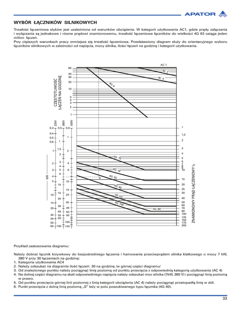 WYBÓR ŁĄCZNIKÓW SILNIKOWYCH Trwałość łączeniowa styków jest uzależniona od warunków obciążenia. W kategorii użytkowania AC1, gdzie prądy załączania i wyłączania są jednakowe i równe prądowi znamionowemu, trwałość łączeniowa łączników do wielkości 4G 63 osiąga jeden milion łączeń. Przy cięższych warunkach pracy zmniejsza się trwałość łączeniowa. Przedstawiony diagram służy do orientacyjnego wyboru łączników silnikowych w zależności od napięcia, mocy silnika, ilości łączeń na godzinę i kategorii użytkowania. # CZĘSTOTLIWOŚĆ ŁĄCZEŃ NA GODZINĘ #% ! ! & ! " # $ ! ! ! ! ! ! ! # ! " # " ZNAMIONOWY PRĄD ŁĄCZENIOWY Ie e % % Przykład zastosowania diagramu: Należy dobrać łącznik krzywkowy do bezpośredniego łączenia i hamowania przeciwprądem silnika klatkowego o mocy 7 kW, 380 V przy 30 łączeniach na godzinę: 1. Kategoria użytkowania AC4 2. Należy odszukać na diagramie ilość łączeń: 30 na godzinę /w górnej części diagramu/ 3. Od znalezionego punktu należy pociągnąć linię poziomą od punktu przecięcia z odpowiednią kategorią użytkowania (AC 4) 4. Na dolnej części diagramu na skali odpowiedniego napięcia należy odszukać moc silnika (7kW, 380 V) i pociągnąć linię poziomą w prawo. 5. Od punktu przecięcia górnej linii poziomej z linią kategorii obciążenia (AC 4) należy pociągnąć prostopadłą linię w dół. 6. Punkt przecięcia z dolną linią poziomą „S” leży w polu poszukiwanego typu łącznika (4G 40). 33