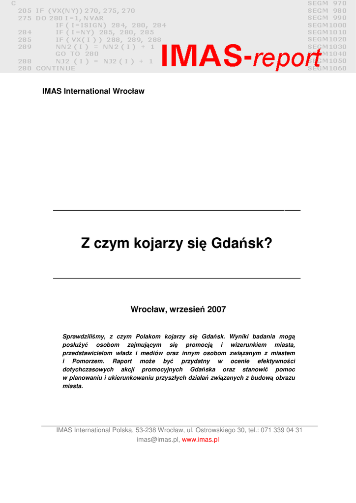 IMAS International Wrocław Z czym kojarzy się Gdańsk? Wrocław, wrzesień 2007 Sprawdziliśmy, z czym Polakom kojarzy się Gdańsk. Wyniki badania mogą posłużyć osobom zajmującym się promocją i wizerunkiem miasta, przedstawicielom władz i mediów oraz innym osobom związanym z miastem i Pomorzem. Raport może być przydatny w ocenie efektywności dotychczasowych akcji promocyjnych Gdańska oraz stanowić pomoc w planowaniu i ukierunkowaniu przyszłych działań związanych z budową obrazu miasta. IMAS International Polska, 53-238 Wrocław, ul. Ostrowskiego 30, tel.: 071 339 04 31 [email protected], www.imas.pl -1- Badania IMAS International prowadzone we wrześniu 2007 na reprezentatywnej próbie Polaków w wieku 15 lat i powyżej mogą pomóc osobom zajmującym się tworzeniem oraz korzystaniem z wizerunku miasta Gdańska. Wyniki pozwalają odpowiedzieć na pytania - jakie spontaniczne skojarzenia wywołuje nazwa „Gdańsk”, w jakim stopniu są one zróżnicowane, jakich obszarów tematycznych dotyczą oraz które skojarzenia dominują. Gdańsk kojarzy się z morzem, zabytkami oraz symbolami związanymi z Solidarnością. W omawianym badaniu sprawdzono jedynie spontaniczne skojarzenia, świadczące zazwyczaj o sile danego obiektu w umysłach badanych osób. Gdańsk przywodzi na myśli skojarzenia głównie z trzech grup tematycznych. Te dominujące obszary skojarzeń to morze i Zatoka Gdańska, Solidarność oraz zabytki miasta. Pozostałe skojarzenia występują z mniejszą siłą. Praktycznie wszyscy Polacy (97%) mają jakieś skojarzenia z Gdańskiem. Zdecydowana większość kojarzy z Gdańskiem coś specyficznego dla tego miasta (np. konkretne miejsca, zabytki). Odsetek odpowiedzi, które mogłyby dotyczyć również innych miejsc w Polsce (np. rodzina, znajomi, „moje miejsce urodzenia”) jest bardzo niski - łącznie tylko 2%. Gdańsk to przede wszystkim miasto nadmorskie. Najliczniejsza grupa skojarzeń dotyczy morza. Suma skojarzeń w tej kategorii wynosi 65%. Najsilniejsze skojarzenie z tej grupy, a także wśród wszystkich wymienianych w ogóle, to morze oraz Zatoka Gdańska – zaklasyfikowane łącznie - wymieniane spontanicznie przez połowę (50%) Polaków. Kolejne marynistyczne skojarzenia występują z dużo mniejszą siłą. Są to: port (9%), statki, marynarze, żegluga (4%) oraz ryby i połowy ryb (2%). Morze/ Zatoka Gdańska Port Statki/ Marynarze/ Żegluga Ryby/ połowy ryb 50% 9% 4% 2% Łącznie 65% -2- Gdańsk to także kolebka Solidarności. Gdańsk kojarzony jest silnie ze Stocznią Gdańską. Wymienia ją spontanicznie co szósty (16%) Polak. Inne skojarzenia z tej grupy tematycznej to Lech Wałęsa (13%), Solidarność (8%) oraz strajki w Stoczni Gdańskiej (5%). Były prezydent to najczęściej kojarzona spontanicznie z Gdańskiem osoba. Inni politycy byli wymieniani sporadycznie. Łączny odsetek skojarzeń Gdańska z symbolami Solidarności wynosi 42%. Stocznia Gdańska Wałęsa Solidarność Strajki w stoczni gdańskiej 16% 13% 8% 5% Łącznie 42% Polscy kojarzą Gdańsk z zabytkami oraz atrakcjami turystycznymi. Polacy na hasło „Gdańsk” wymieniają spontanicznie wiele różnorodnych zabytków i atrakcji turystycznych miasta. Liderem w tej kategorii jest fontanna Neptuna (15%). Inne atrakcje turystyczne miasta wymieniane są rzadziej: Starówka/ Stare Miasto/ Rynek (7%), Jarmark Dominikański (4%), Długi Targ/ ulica Długa (2%), Żuraw Gdański (1%). Inne odpowiedzi to zabytkowe miasto/ zabytki – ogólnie (5%), oraz inne konkretne zabytki wymieniane sporadycznie (łącznie 1%). Suma skojarzeń w tej kategorii wynosi 36%. Neptun Starówka/ Stare Miasto/ Rynek Zabytki/ zabytkowe miasto Jarmark Dominikański Długi Targ/ ulica Długa Żuraw Gdański Kościoły/ Katedry Inne konkretne zabytki 15% 7% 5% 4% 2% 1% 1% 1% Łącznie 36% Gdańsk to miasto urlopowe. Polacy kojarzą Gdańsk z celem wyjazdów urlopowych, wakacyjnych. Dominujące skojarzenia to wakacje/ wypoczynek/ słońce (10%), pozostałe skojarzenia wymieniano sporadycznie: plaża/ piasek (3%) oraz zdrowie/ kurort (1%). Wakacje/ wypoczynek/ słońce Plaża/ piasek Zdrowie/ kurort/ jod/ klimat 10% 3% 1% Łącznie 14% -3- Inne skojarzenia Skojarzenia nie dające się przyporządkować do żadnej szerszej grupy skojarzeń to: Trójmiasto (7%), okres międzywojenny oraz II Wojna Światowa (łącznie 4%), „miasto” – ogólnie (3%). Sporadycznie odnotowano również inne skojarzenia. Trójmiasto Okres międzywojenny/ II Wojna Światowa Miasto (ogólnie) Piękne, ładne miasto Duże miasto Rafineria Gdańska Moje miasto/ "korzenie"/ rodzina Osobiste wizyty/ delegacje/ znajomi Uczelnie wyższe/ studenci Politycy/ polityka/ Tusk/ Kaczyńscy 7% 4% 3% 3% 1% 1% 1% 1% 1% 1% Biorąc pod uwagę jedynie najczęściej wskazywane skojarzenia można powiedzieć, że Gdańsk przywodzi Polakom na myśl przede wszystkim: Morze/ Zatoka Gdańska Stocznia Gdańska Neptun Wałęsa 50% 16% 15% 13% Wyniki pochodzą z badania przeprowadzonego przez IMAS International jako część ankiety wielotematycznej. Badania zrealizowano metodą wywiadu kwestionariuszowego In home we wrześniu 2007 na reprezentatywnej kwotowej grupie Polaków w wieku 15 lat i więcej lat (n=1013). W przypadku cytowania wyników badania, prosimy podać nazwę firmy, wielkość próby oraz metodologię. Istnieje możliwość zakupu pełnych wyników badań wraz z tabelami. Kontakt: Damian Michalski [email protected] , tel: (071) 339 04 31 Sondaż jest częścią własnego projektu IMAS dotyczącego skojarzeń Polaków ze stolicami województw. Dotychczas zbadano skojarzenia z miastami: Poznań, Łódź, Kraków, Warszawa. Kolejne planowane miasta: Kielce, Opole, Lublin. Wyniki poprzednich badań w ramach tego projektu oraz więcej informacji można uzyskać na stronie www.imas.pl zakładka Raporty IMAS.