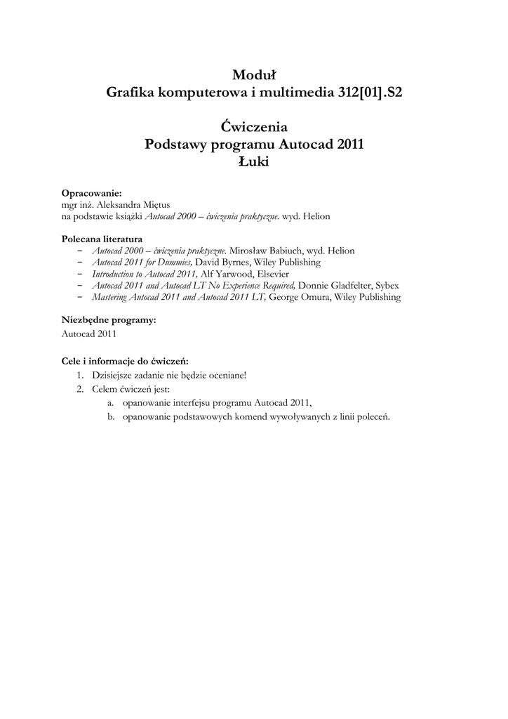 Moduł Grafika komputerowa i multimedia 312[01].S2 Ćwiczenia Podstawy programu Autocad 2011 Łuki Opracowanie: mgr inż. Aleksandra Miętus na podstawie książki Autocad 2000 – ćwiczenia praktyczne. wyd. Helion Polecana literatura - Autocad 2000 – ćwiczenia praktyczne. Mirosław Babiuch, wyd. Helion - Autocad 2011 for Dummies, David Byrnes, Wiley Publishing - Introduction to Autocad 2011, Alf Yarwood, Elsevier - Autocad 2011 and Autocad LT No Experience Required, Donnie Gladfelter, Sybex - Mastering Autocad 2011 and Autocad 2011 LT, George Omura, Wiley Publishing Niezbędne programy: Autocad 2011 Cele i informacje do ćwiczeń: 1. Dzisiejsze zadanie nie będzie oceniane! 2. Celem ćwiczeń jest: a. opanowanie interfejsu programu Autocad 2011, b. opanowanie podstawowych komend wywoływanych z linii poleceń. Ćwiczenie 1 - rozgrzewka (ŁUK, U) a) Łuk przechodzący przez 3 zadane punkty Określ punkt początkowy łuku lub [śrOdek] : 50,50 Określ drugi punkt łuku lub [śrOdek/koNiec]: 100,100 Określ punkt końcowy łuku: 150,0 b) Łuk w którym definiujemy kąt, środek oraz początek Określ punkt początkowy łuku lub [śrOdek]: 50,50 Określ drugi punkt łuku lub [ŚrOdek/koNiec]: O Określ środek łuku: 70,70 Określ punkt końcowy łuku lub [Kąt/Długość]: K Określ kąt rozwarcia łuku: 150 c) Definicja początku, środka i cięciwy łuku Określ punkt początkowy łuku lub [ŚrOdek]: 50,50 Określ drugi punkt łuku lub [ŚrOdek/koNiec]: O Określ środek łuku:70,70 Określ punkt końcowy łuku lub [Kąt/Długość]: D Określ długość cięciwy: 50 d) Początek, koniec, kąt Określ punkt początkowy łuku lub [śrOdek]: 50,50 Określ drugi punkt łuku lub [ŚrOdek/Koniec]: k Określ punkt końcowy łuku: 100,100 Określ środek łuku lub [Kąt/zWrot/pRomień]: k Określ kąt rozwarcia łuku: 100 e) Początek, koniec, zwrot Określ punkt początkowy łuku lub [śrOdek]: 50,50 Określ drugi punkt łuku lub [ŚrOdek/koNiec]: K Określ punkt końcowy łuku: 100,100 Określ środek łuku lub [Kąt/zWrot/pRomień]: w Określ kierunek stycznej w punkcie początkowym łuku: 120 f) Początek, koniec, promień Określ punkt początkowy łuku lub [śrOdek]: 50,50 Określ drugi punkt łuku lub [ŚrOdek/koNiec]: K Określ punkt końcowy łuku: 100,100 Określ środek łuku lub [Kąt/zWrot/pRomień]: r Określ promień łuku:40 g) Środek, początek, koniec Określ punkt początkowy łuku lub [śrOdek]: o Określ środek luku:70,70 Określ punkt początkowy luku: 50,50 Określ punkt końcowy łuku lub [Kąt/cięciwą]: 100,100 h) Środek, początek, kąt Określ punkt początkowy łuku lub [śrOdek]: o Określ środek łuku:70,70 Określ punkt początkowy łuku: 50,50 Określ punkt końcowy łuku lub [Kąt/cięciwa]: Określ kąt rozwarcia łuku: 150 i) Środek, początek, cięciwa Określ punkt początkowy łuku lub [śrOdek]: o Określ środek łuku:70,70 Określ punkt początkowy łuku: 50,50 Określ punkt końcowy łuku lub [Kąt/Długość]: D Określ długość cięciwy: 50 Ćwiczenie 2 - do samodzielnego wykonania Wskazówki: • Narysuj linie pomocnicze (proste!) – głównie po to aby wyznaczyć środki łuków! • Jedynym elementem rysowanym „na oko” jest fragment z wykorzystaniem „splajn”