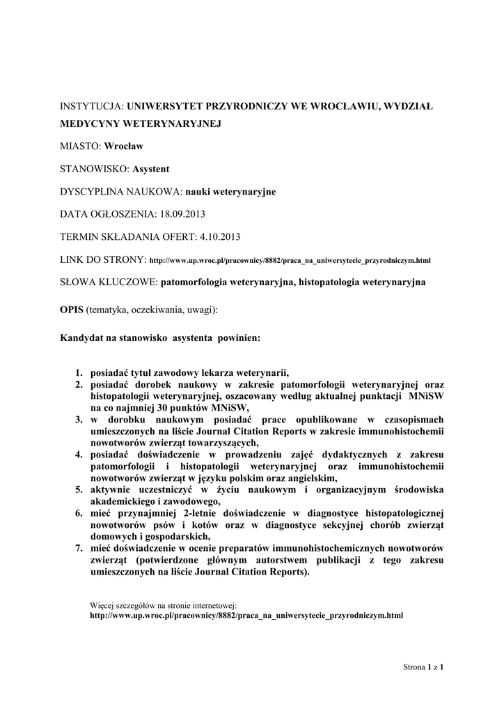 INSTYTUCJA: UNIWERSYTET PRZYRODNICZY WE WROCŁAWIU, WYDZIAŁ MEDYCYNY WETERYNARYJNEJ MIASTO: Wrocław STANOWISKO: Asystent DYSCYPLINA NAUKOWA: nauki weterynaryjne DATA OGŁOSZENIA: 18.09.2013 TERMIN SKŁADANIA OFERT: 4.10.2013 LINK DO STRONY: http://www.up.wroc.pl/pracownicy/8882/praca_na_uniwersytecie_przyrodniczym.html SŁOWA KLUCZOWE: patomorfologia weterynaryjna, histopatologia weterynaryjna OPIS (tematyka, oczekiwania, uwagi): Kandydat na stanowisko asystenta powinien: 1. posiadać tytuł zawodowy lekarza weterynarii, 2. posiadać dorobek naukowy w zakresie patomorfologii weterynaryjnej oraz histopatologii weterynaryjnej, oszacowany według aktualnej punktacji MNiSW na co najmniej 30 punktów MNiSW, 3. w dorobku naukowym posiadać prace opublikowane w czasopismach umieszczonych na liście Journal Citation Reports w zakresie immunohistochemii nowotworów zwierząt towarzyszących, 4. posiadać doświadczenie w prowadzeniu zajęć dydaktycznych z zakresu patomorfologii i histopatologii weterynaryjnej oraz immunohistochemii nowotworów zwierząt w języku polskim oraz angielskim, 5. aktywnie uczestniczyć w życiu naukowym i organizacyjnym środowiska akademickiego i zawodowego, 6. mieć przynajmniej 2-letnie doświadczenie w diagnostyce histopatologicznej nowotworów psów i kotów oraz w diagnostyce sekcyjnej chorób zwierząt domowych i gospodarskich, 7. mieć doświadczenie w ocenie preparatów immunohistochemicznych nowotworów zwierząt (potwierdzone głównym autorstwem publikacji z tego zakresu umieszczonych na liście Journal Citation Reports). Więcej szczegółów na stronie internetowej: http://www.up.wroc.pl/pracownicy/8882/praca_na_uniwersytecie_przyrodniczym.html Strona 1 z 1