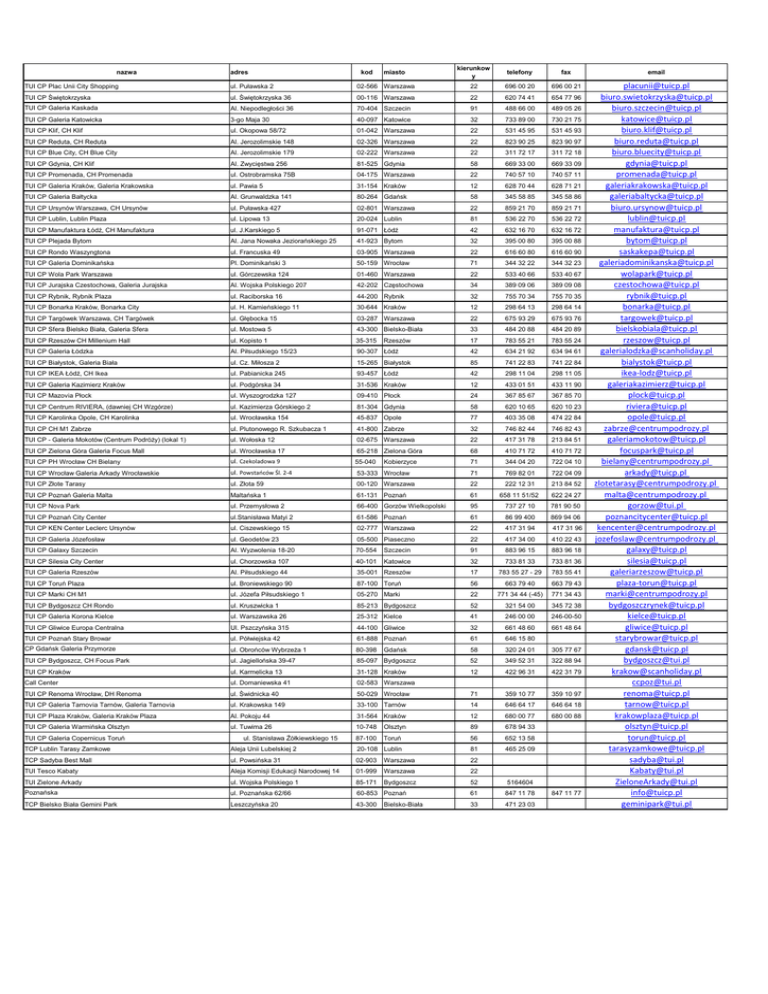 nazwa adres kod miasto kierunkow y telefony fax email TUI CP Plac Unii City Shopping ul. Puławska 2 02-566 Warszawa 22 696 00 20 696 00 21 TUI CP Świętokrzyska ul. Świętokrzyska 36 00-116 Warszawa 22 620 74 41 654 77 96 TUI CP Galeria Kaskada Al. Niepodległości 36 70-404 Szczecin 91 488 66 00 489 05 26 TUI CP Galeria Katowicka 3-go Maja 30 40-097 Katowice 32 733 89 00 730 21 75 TUI CP Klif, CH Klif ul. Okopowa 58/72 01-042 Warszawa 22 531 45 95 531 45 93 TUI CP Reduta, CH Reduta Al. Jerozolimskie 148 02-326 Warszawa 22 823 90 25 823 90 97 TUI CP Blue City, CH Blue City Al. Jerozolimskie 179 02-222 Warszawa 22 311 72 17 311 72 18 TUI CP Gdynia, CH Klif Al. Zwycięstwa 256 81-525 Gdynia 58 669 33 00 669 33 09 TUI CP Promenada, CH Promenada ul. Ostrobramska 75B 04-175 Warszawa 22 740 57 10 740 57 11 TUI CP Galeria Kraków, Galeria Krakowska ul. Pawia 5 31-154 Kraków 12 628 70 44 628 71 21 TUI CP Galeria Bałtycka Al. Grunwaldzka 141 80-264 Gdańsk 58 345 58 85 345 58 86 TUI CP Ursynów Warszawa, CH Ursynów ul. Puławska 427 02-801 Warszawa 22 859 21 70 859 21 71 [email protected] [email protected] [email protected] [email protected] [email protected] [email protected] [email protected] [email protected] [email protected] [email protected] [email protected] [email protected] [email protected] [email protected] [email protected] [email protected] [email protected] [email protected] [email protected] [email protected] [email protected] [email protected] [email protected] [email protected] [email protected] [email protected] [email protected] [email protected] [email protected] [email protected] [email protected] [email protected] [email protected] [email protected] [email protected] [email protected] [email protected] [email protected] [email protected] [email protected] [email protected] [email protected] [email protected] [email protected] [email protected] [email protected] [email protected] [email protected] [email protected] [email protected] [email protected] [email protected] [email protected] [email protected] [email protected] [email protected] [email protected] [email protected] [email protected] [email protected] [email protected] [email protected] [email protected] [email protected] [email protected] [email protected] TUI CP Lublin, Lublin Plaza ul. Lipowa 13 20-024 Lublin 81 536 22 70 536 22 72 TUI CP Manufaktura Łódź, CH Manufaktura ul. J.Karskiego 5 91-071 Łódź 42 632 16 70 632 16 72 TUI CP Plejada Bytom Al. Jana Nowaka Jeziorańskiego 25 41-923 Bytom 32 395 00 80 395 00 88 TUI CP Rondo Waszyngtona ul. Francuska 49 03-905 Warszawa 22 616 60 80 616 60 90 TUI CP Galeria Dominikańska Pl. Dominikański 3 50-159 Wrocław 71 344 32 22 344 32 23 TUI CP Wola Park Warszawa ul. Górczewska 124 01-460 Warszawa 22 533 40 66 533 40 67 TUI CP Jurajska Czestochowa, Galeria Jurajska Al. Wojska Polskiego 207 42-202 Częstochowa 34 389 09 06 389 09 08 TUI CP Rybnik, Rybnik Plaza ul. Raciborska 16 44-200 Rybnik 32 755 70 34 755 70 35 TUI CP Bonarka Kraków, Bonarka City ul. H. Kamieńskiego 11 30-644 Kraków 12 298 64 13 298 64 14 TUI CP Targówek Warszawa, CH Targówek ul. Głębocka 15 03-287 Warszawa 22 675 93 29 675 93 76 TUI CP Sfera Bielsko Biała, Galeria Sfera ul. Mostowa 5 43-300 Bielsko-Biała 33 484 20 88 484 20 89 TUI CP Rzeszów CH Millenium Hall ul. Kopisto 1 35-315 17 783 55 21 783 55 24 TUI CP Galeria Łódzka Al. Piłsudskiego 15/23 90-307 Łódź 42 634 21 92 634 94 61 TUI CP Białystok, Galeria Biała ul. Cz. Miłosza 2 15-265 Białystok 85 741 22 83 741 22 84 TUI CP IKEA Łódź, CH Ikea ul. Pabianicka 245 93-457 Łódź 42 298 11 04 298 11 05 TUI CP Galeria Kazimierz Kraków ul. Podgórska 34 31-536 Kraków 12 433 01 51 433 11 90 TUI CP Mazovia Płock ul. Wyszogrodzka 127 09-410 Płock 24 367 85 67 367 85 70 TUI CP Centrum RIVIERA, (dawniej CH Wzgórze) ul. Kazimierza Górskiego 2 81-304 Gdynia 58 620 10 65 620 10 23 TUI CP Karolinka Opole, CH Karolinka ul. Wrocławska 154 45-837 Opole 77 403 35 08 474 22 84 Rzeszów TUI CP CH M1 Zabrze ul. Plutonowego R. Szkubacza 1 41-800 Zabrze 32 746 82 44 746 82 43 TUI CP - Galeria Mokotów (Centrum Podróży) (lokal 1) ul. Wołoska 12 02-675 Warszawa 22 417 31 78 213 84 51 TUI CP Zielona Góra Galeria Focus Mall ul. Wrocławska 17 65-218 Zielona Góra 68 410 71 72 410 71 72 TUI CP PH Wrocław CH Bielany ul. Czekoladowa 9 55-040 71 344 04 20 722 04 10 TUI CP Wrocław Galeria Arkady Wrocławskie ul. Powstańców Śl. 2-4 53-333 Wrocław 71 769 82 01 722 04 09 TUI CP Złote Tarasy ul. Złota 59 00-120 Warszawa 22 222 12 31 213 84 52 TUI CP Poznań Galeria Malta Maltańska 1 61-131 Poznań 61 658 11 51/52 622 24 27 TUI CP Nova Park ul. Przemysłowa 2 66-400 Gorzów Wielkopolski 95 737 27 10 781 90 50 TUI CP Poznań City Center ul.Stanisława Matyi 2 61-586 Poznań 61 86 99 400 869 94 06 TUI CP KEN Center Leclerc Ursynów ul. Ciszewskiego 15 02-777 Warszawa 22 417 31 94 417 31 96 TUI CP Galeria Józefosław ul. Geodetów 23 05-500 Piaseczno 22 417 34 00 410 22 43 TUI CP Galaxy Szczecin Al. Wyzwolenia 18-20 70-554 Szczecin 91 883 96 15 883 96 18 TUI CP Silesia City Center ul. Chorzowska 107 40-101 Katowice 32 733 81 33 733 81 36 TUI CP Galeria Rzeszów Al. Piłsudskiego 44 35-001 Rzeszów 17 783 55 27 - 29 783 55 41 TUI CP Toruń Plaza ul. Broniewskiego 90 87-100 Toruń 56 663 79 40 663 79 43 TUI CP Marki CH M1 ul. Józefa Piłsudskiego 1 05-270 Marki 22 771 34 44 (-45) 771 34 43 TUI CP Bydgoszcz CH Rondo ul. Kruszwicka 1 85-213 Bydgoszcz 52 321 54 00 345 72 38 TUI CP Galeria Korona Kielce ul. Warszawska 26 25-312 Kielce 41 246 00 00 246-00-50 TUI CP Gliwice Europa Centralna Ul. Pszczyńska 315 44-100 Gliwice 32 661 48 60 661 48 64 TUI CP Poznań Stary Browar ul. Półwiejska 42 61-888 Poznań 61 646 15 80 CP Gdańsk Galeria Przymorze ul. Obrońców Wybrzeża 1 80-398 58 320 24 01 305 77 67 TUI CP Bydgoszcz, CH Focus Park ul. Jagiellońska 39-47 85-097 Bydgoszcz 52 349 52 31 322 88 94 TUI CP Kraków ul. Karmelicka 13 31-128 Kra