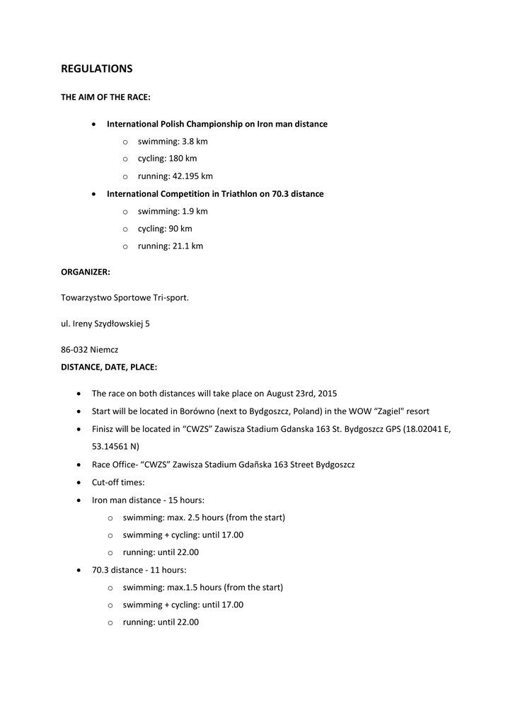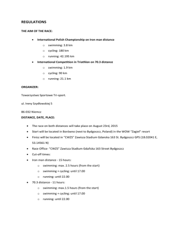 REGULATIONS THE AIM OF THE RACE: International Polish Championship on Iron man distance o swimming: 3.8 km o cycling: 180 km o running: 42.195 km International Competition in Triathlon on 70.3 distance o swimming: 1.9 km o cycling: 90 km o running: 21.1 km ORGANIZER: Towarzystwo Sportowe Tri-sport. ul. Ireny Szydłowskiej 5 86-032 Niemcz DISTANCE, DATE, PLACE: The race on both distances will take place on August 23rd, 2015 Start will be located in Borówno (next to Bydgoszcz, Poland) in the WOW “Zagiel" resort Finisz will be located in “CWZS” Zawisza Stadium Gdanska 163 St. Bydgoszcz GPS (18.02041 E, 53.14561 N) Race Office- “CWZS” Zawisza Stadium Gdañska 163 Street Bydgoszcz Cut-off times: Iron man distance - 15 hours: o swimming: max. 2.5 hours (from the start) o swimming + cycling: until 17.00 o running: until 22.00 70.3 distance - 11 hours: o swimming: max.1.5 hours (from the start) o swimming + cycling: until 17.00 o running: until 22.00 PARTICIPATION CONDITIONS: All athletes have to be 18 years old on the race day, i.e. 23.08.2015 (a valid ID confirming the age will be required for verification) During the cycling leg every athlete is required to wear a cycling helmet and to ride a technically ready bicycle (to be verified during the check-in) Every athlete is obligated to sign a declaration of starting of one’s own free duty REGISTRATION: Written registration, which includes: Name, Date of Birth, Address, Club, Telefon number, Email, type of distance (Ironman or 70.3 or relay), size of T-shirt (S,M,L,XL) should be done through registration form Registration closes on Jul.31, 2015 Registrations are only valid after filling the registration form and the race fee has been paid The distance change is IMPOSSIBLE after completing the registration and being at starting list Limit of competitors is 800 (all together: Ironman, 70.3 distance and relay) CLASSIFICATION: Iron man distance: o Men / Women (Open) o Age groups (for men and women separately): 18-29, 30-39, 40-49, 50-59, 60+ 70.3 distance: o Men / Women (Open) o Mixed relay on ironman and 70.3 distance: o Men/Women (team of 3, one person can take part in one discipline, mixed are available) AWARDS: Iron man distance: o places 1-5 in Women Open category: money prize or awards o places 1-10 in Men Open category: money prize or awards o places 1-3 in Age Groups: cups o all finishers will receive a commemorative medal 70.3 distance: o places 1-3 in Men Open and Women Open categories: cups o all finishers will receive a commemorative medal Relay on Iron man and 70.3 distance: o places 1-3: awards REGISTRATION FEE: The registration fee should be paid to the following account: IBAN - PL 10 1240 1183 1978 0010 3106 0429 Official bank name: bank Pekao S. A. Address of the bank: ul. Grzybowska 53/57, 00-950 Warszawa SWIFT code – PKOPPLPW The fee is nonrefundable. The fee depends on the time of registration and equals (for 70.3/Iron man distance respectively): o until Jan.31, 2015: EUR 60/85 o until Apr.30, 2015: EUR 85/110 o until Jul.31, 2015: EUR 110/135 The relay fee (for 70.3/Iron man distance respectively): o until Jan. 31, 2015: EUR 175/185 o until Apr 30, 2015: EUR 200/210 o until Jul. 31, 2015: EUR 220/230 After Jul.31, 2015: EUR 175 (relay: EUR 290) without full start package and commemorative medal OTHER ORGANISATIONAL ISSUES: the race will take place regardless of weather conditions on the race day There will be two changing zones- one in Borowno, second in “CWZS” Zawisza on Gdanska 163 Street in Bydgoszcz Starting packet can be collected only personally on 31.08.2013 during race office hours Organizer assure athlete transport by rented buses to the starting point (from CWZS Zawisza to Borowno) The traffic will be cut off completely during the bike race Bikes must be delivered PERSONALLY on a day before start (22.08.2015) during hours announced in schedule There will be one refreshment station on the bike course ( one with water, iso drink, caffeine drink, bananas, sports bars and second with water) There will be two refreshment stations on the running course (with water, iso drink, caffeine drink, bananas, sports bars) Helmet is required during the race During the bike race listening to music is forbidden The bike race will be held according to traffic regulation Drafting is FORBIDDEN! Minimal distance between athletes on bikes- 10 meters The Organizer will provide medical assistance to athletes during the race Time measurement will be done electronically (chips) Athletes will have possibility to use showers and bathrooms at Zawisza Stadium Athletes must arrange their stay (hotels, subsistence etc.) themselves Every athlete can have regenerative meal after the race The awards can be collected only personally on the official ceremony, the organizer will not be sending them to the competitors There is an opportunity to accommodate in CWZS Zawisza on Gdanska 163 Street (www.hotel-zawisza.pl) The Organizer has the right to interpret the Rules and Regulations, with their decisions there of being final.