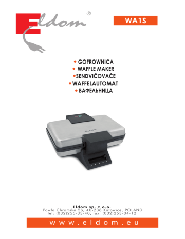 R WA1S GOFROWNICA WAFFLE MAKER SENDVIČOVAČE WAFFELAUTOMAT ВАФЕЛЬНИЦА Eldom sp. z o.o. Pa w ł a C h r o m i k a 5 a , 4 0 - 2 3 8 Ka t o w i c e , P O L A N D tel: (032)255-33-40, fax: (032)253-04-12 w w w . e l d o m . e u R INSTRUKCJA OBSŁUGI GOFROWNICA WA1S 1 OPIS OGÓLNY 1. Lampki kontrolne 2. Uchwyt 3. Regulator temperatury 4. Pokrywa 4 2 DANE TECHNICZNE - moc: 1000W - napięcie zasilania: 230V ~ 50Hz 3 PRZYGOTOWANIE DO UŻYCIA Przed przystąpieniem do użytkowania urządzenia należy się upewnić czy urządzenie, wtyczka i przewód zasilający są sprawne i czy usunięto wszelkie części opakowania. Uwaga: Podczas pierwszego użycia może wydzielać się zapach będący wynikiem procesu produkcyjnego. Jest to proces normalny i ustępuje po pewnym czasie. W pomieszczeniu należy zapewnić właściwą wentylację np. otwierając okno. - Przetrzeć płyty grzejne wilgotną szmatką - Zamknąć pokrywę (bez ciasta) - Włożyć wtyczkę do gniazdka. Czerwone światło (1) wskazuje iż urządzenie zostało podłączone do zasilania. Zielona lampka (1) zapala się, gdy urządzenie gotowe jest do użycia. - Ustawić regulator temperatury (3) na poziom „5”. - Po 10 minutach należy przesunąć regulator temperatury na poziom „1”. - Wyciągnąć wtyczkę z gniazdka. - Otworzyć gofrownicę poprzez przyciśnięcie uchwytu (2) a później uniesienie pokrywy. - Pozostawić urządzenie w takim stanie do wychłodzenia. - Gdy urządzenie wystudzi się, należy raz jeszcze przetrzeć płyty grzejne wilgotną szmatką. Gofrownica jest gotowa do użycia. PIECZENIE GOFRÓW Po przygotowaniu ciasta należy: - Umieścić urządzenie na płaskiej i odpornej na wysokie temperatury powierzchni - Lekko natłuścić płyty masłem, margaryną lub olejem aby były zdatne do pieczenia gofrów. Ważne! Urządzenie należy obsługiwać jedynie za pomocą uchwytu i regulatora temperatury. Inne części urządzenia będą gorące co wiąże się z ryzykiem poparzenia. 1 - Zamknąć pokrywę urządzenia - Włożyć wtyczkę do gniazdka i ustawić regulator temperatury na pożądaną wartość. Czerwone światło świadczy o tym, iż urządzenie jest podłączone do prądu i nagrzewa się. Gofrownica jest gotowa do użycia, gdy zapali się zielona lampka. - Otworzyć gofrownicę poprzez przyciśnięcie uchwytu (2) a później uniesienie pokrywy. - Aby zrobić gofra należy umieścić odpowiednią ilość ciasta na powierzchni płytki, (ok. 2 łyżki stołowe) Przy nałożeniu zbyt dużej ilości ciasta istnieje ryzyko otwarcia się pokrywy (2) w trakcie pracy urządzenia. Ważne! Jeśli istnieje potrzeba zrobienia dwóch gofrów w tym samym czasie, należy nałożyć tę samą ilość ciasta na obie części płytki. Jeśli ilości nie będą równe, gofry mogą mieć różną wielkość. - Zamknąć pokrywę. Należy się upewnić czy zatrzask na uchwycie zamykający obie płyty grzejne działa poprawnie. Ważne! Czasami zdarza się, że zielona lampka często wyłącza się i znowu zapala. Wskazuje ona, iż temperatura w urządzeniu spadła i musi automatycznie powrócić do ustawionej, wyższej temperatury. - Gofry są gotowe po upływie trzech minut. Można określić poziom zbrązowienia gofrów przez dostosowanie regulatora temperatury lub poprzez zastosowanie odpowiednio długiego czasu pieczenia. W ten sposób gofry mogą być złocisto-brązowe lub ciemnobrązowe i chrupiące. Podany czas pieczenia jest orientacyjny. Czas pieczenia zależy od: - rodzaju ciasta - oczekiwanego poziomu wypieczenia gofrów i ilości gofrów w gofrownicy - poziomu ustawienia regulatora temperatury - Otworzyć pokrywę gofrownicy i sprawdzić czy gofry osiągnęły właściwy kolor. Jeśli nie, trzeba zamknąć urządzenie i pozwolić by gofry się dopiekły. Gdy gofry będą gotowe należy otworzyć pokrywę i wyciągnąć je. Uwaga! Wyjmując gofry należy uważać by nie zniszczyć powierzchni płytek. Aby tego uniknąć należy stosować drewniane lub plastikowe narzędzia kuchenne. Po upieczeniu ostatniego gofra należy odłączyć gofrownicę od sieci i zostawić do wychłodzenia z otwartą pokrywą. WSKAZÓWKI - Wszystkie składniki powinny być należycie wymieszane, co zapewni odpowiedni proces rumienienia - Jeśli zamiast wody użyje się mleka, gofry będą bardziej miękkie i brązowe - Nie należy kłaść chrupiących gofrów jeden na drugim gdyż szybko miękną. Aby pozostały chrupiące należy je kłaść obok siebie. PRZEPIS NA CIASTO Składniki: - 2 szklanki maki - 2 szklanki mleka - 4 jajka - łyżeczka proszku do pieczenia - 50ml oleju - szczypta soli - około 1/2 szklanki cukru Jajka utrzeć z cukrem, następnie wsypać makę uprzednio wymieszaną z proszkiem do pieczenia. Dodać mleko i olej mieszając do uzyskania jednolitego ciasta. Posolić do smaku. Przepisy na ciasto na gofry dostepne są również na stronach internetowych. 2 CZYSZCZENIE I KONSERWACJA - Przed rozpoczęciem czyszczenia urządzenia należy odłączyć je od prądu i pozostawić do ostygnięcia. - Nie należy zanurzać żadnej części urządzenia w wodzie lub innych cieczach. Mogłoby to spowodować śmiertelne porażenie prądem lub uszkodzenie urządzenia. - Na początku należy przetrzeć płytki ręcznikami papierowymi, aby usunąć tłuszcz. - Następnie należy oczyścić urządzenie i kabel lekko wilgotną ściereczką. Przed kolejnym użyciem urządzenia należy wytrzeć je do sucha. - Nie używać detergentów i rozpuszczalników. Mogą one nie tylko zniszczyć powierzchnię gofrownicy, jak również pozostać częściowo na płytkach i wtopić się w następne gofry. - W przypadku osadów trudnych do usunięcia nie należy używać twardych narządzi gdyż mogą zniszczyć powłoki zastosowane na płytkach urządzenia. Na uparte zabrudzenia najlepiej jest położyć mokrą ścierkę, która rozmiękcza osady. WSKAZÓWKI BEZPIECZEŃSTWA - przed pierwszym użyciem prosimy uważnie zapoznać się z całoś