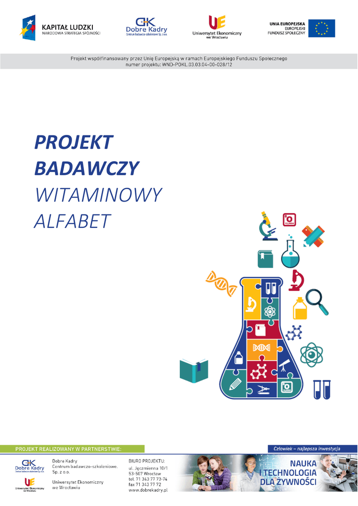 PROJEKT BADAWCZY WITAMINOWY ALFABET Nauka i technologia dla żywności gimnazjum Tytuł projektu: Witaminowy alfabet Wprowadzenie: W 1912r polski chemik Kazimierz Funk z łusek ryżu otrzymał substancję, która leczyła chorobę beri beri – była to tiamina, czyli witamina B1 Funk uznał te substancję za niezbędną do życia – amina necessaria ad vitam, stąd powstała nazwa witamina. Dokładne ustalenie zapotrzebowania organizmu człowieka na poszczególne witaminy jest trudne, gdyż zależy ono od wieku, cech osobniczych, działania synergistycznego itp. Niedobór witamin nazywamy awitaminozą, natomiast zespół objawów chorobowych wywołany nadmiarem witamin w organizmie – hiperwitaminozą. Hiperwitaminoza dotyczy przede wszystkim witamin rozpuszczalnych w tłuszczach: A, D, E i K. Witaminy to różnorodne związki organiczne, które są potrzebne organizmowi człowieka do prawidłowego funkcjonowania. Nie stanowią one jednorodnej grupy i mają odmienny skład chemiczny. W ustroju pełnią rolę regulacyjną, jako biokatalizatory są niezbędne do utrzymania prawidłowych procesów metabolicznych zachodzących w komórkach. Ich znaczenie dla funkcjonowania ludzkiego organizmu pozwala klasyfikować je pod jedną nazwą, ale tak naprawdę działają one w różny sposób i są różnymi substancjami. Mogą działać jak koenzymy, antyoksydanty. Niedobór witamin w diecie jest przyczyną wielu chorób np.: witaminy C – szkorbutu, witaminy A kurzej ślepoty, witaminy D – krzywicy, a witaminy B1 – choroby beri beri. Cel: Zorganizowanie dyskusji dotyczącej wpływu witamin na zachowanie zdrowia. Cele kształcenia i wychowania: - Przypomnienie znaczenia pojęć: witamina, awitaminoza, hipowitaminoza i hiperwitaminoza, - Znaczenie witamin dla zdrowia człowieka, - Wyszukiwanie produktów spożywczych bogatych w witaminy, - Prezentowanie informacji i ciekawostek o wybranej witaminie, - Krytyczne analizowanie potrzeby stosowania witamin syntetycznych, - Przedstawienie rozpuszczania substancji w cieczach, w tym w tłuszczach, - Prezentowanie przykładów zawiesin, - Wyszukiwanie, segregowanie informacji z różnych źródeł, - Umiejętność współpracy w grupie, - Umiejętność prezentowania realizacji projektu. Pytanie kluczowe: Dlaczego powinniśmy wiedzieć, które produkty spożywcze zawierają najwięcej witamin? Etapy projektu: Etapy Działania Przygotowanie 1. Podanie celów zajęć, mówienie zakresu treści, które będą realizowane na zajęciach. 2. Omówienie form i metod pracy uczniów. 3. Dyskusja z uczniami nad formą prezentacji wyników prac. 4. Ustalenie zasad współpracy z nauczycielami wspomagającymi realizację projektu. Planowanie 1. Ustalenie grup, w których uczniowie będą pracować, wybór liderów grup. 2. Przydzielenie zadań: wybór fotografa, wybór osoby odpowiedzialnej za wykonanie gazetek. 3. Zgromadzenie potrzebnej literatury, materiałów i sprzętu niezbędnego do wykonania doświadczeń. 4. Omówienie zasad bezpieczeństwa przy wykonywanych doświadczeniach. Realizacja 1. Przygotowanie prezentacji multimedialnej o Kazimierzu Funku – odkrywcy witamin. 2. Samodzielna praca z książką i Internetem, wyszukiwanie i selekcjonowanie informacji dotyczących witamin. 3. Doskonalenie umiejętności wzajemnego uczenia się i sprawdzania swojej wiedzy. 4. Doświadczalne wykrywanie witaminy C w sokach owocowych. 5. Przypomnienie informacji dotyczących najczęstszych hipowitaminoz i hiperwitaminoz. 6. Dyskusja nad sposobami uniknięcia chorób wywołanych nadmiarem, bądź niedoborem witamin. 7. Poznanie wzorów strukturalnych i budowy chemicznej wybranych witamin. 8. Doskonalenie pracy metodą „Śnieżnej kuli” - zjawisko rozpuszczania różnych substancji. 9. Rozwijanie umiejętności selekcjonowania informacji, dokonywania wyborów. 10. Doświadczalne sprawdzanie rozpuszczalności witamin. Prezentacja 1. Prezentacja multimedialna o polskim uczonym Kazimierzu Funku. 2. Prezentacja zdjęć na gazetce szkolnej. 3. Dyskusja nad sposobami uniknięcia chorób wywołanych nadmiarem, bądź niedoborem witamin. 4. Wystawa wykonanych modeli wzorów witamin. Szczegółowy opis działań na etapie realizacji L.p. Zespół Treści Sposób realizacji Efekt realizacji Wsparcie termin uczniów 1. Wszyscy Badania Kazimierza Przygotowanie prezentacji o Kazimierzu Prezentacja multimedialna. Nauczyciel 1 uczestnicy Funka. Funku. informatyki. godz. projektu. Opis zadania: Nauczyciel prosi chętnego ucznia o przygotowanie w domu prezentacji multimedialnej o życiu i pracy polskiego uczonego Kazimierza Funka. Omawia z nim zakres treści i wskazuje źródła. Pozostałych uczniów prosi o przyniesienie na zajęcia podręczników i książek o witaminach, mazaki, kartki A-4. Na zajęciach wybrany uczeń przedstawia przygotowaną prezentację multimedialną pozostałym uczestnikom projektu. Nauczyciel wcześniej przygotowuje w kopercie dwa zestawy nazw witamin. Witaminy rozpuszczalne w wodzie na żółtym tle, rozpuszczalne w tłuszczach na zielonym tle. Na zajęciach uczniowie losują nazwy witamin. Następnie siadają w dwóch grupach tak, aby jednej grupie były wszystkie witaminy rozpuszczalne w tłuszczach w drugiej rozpuszczalne w wodzie. Zespół A Witaminy Samodzielna praca z książką. Zgromadzenie wiadomości Nauczyciel 2 rozpuszczalne w Wzajemne uczenie się. dotyczących witamin. biologii, godz. wodzie. chemii. Opis zadania: Formy pracy: praca w grupach, wzajemne uczenie się. Etap 1. Uczniowie przez 10 minut przygotowują swoje zadanie – każdy uczy się o wylosowanej witaminie: - występowanie, - znaczenie biologiczne, - skutki niedoboru. Etap 2. Uczniowie uczą swoich kolegów w grupie. Mogą opisywać, rysować, opowiadać. Każdy o swojej witaminie. Wzajemne uczenie się powinno trwać ok. 30 min. Zespół B Witaminy Samodzielna praca z książką. Zgromadzenie wiadomości Nauczyciel 2 rozpuszczalne w Wzajemne uczenie się. dotyczących wita