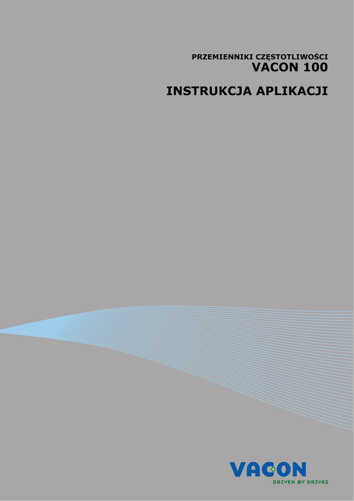 vacon • 0 INDEKS Dokument: DPD00352C Data wydania wersji: 23.7.10 Odpowiada zestawowi aplikacji FW020003V019.vcx 1. VACON 100 – Rozruch.....................................................................................2 1.1 1.2 1.3 Kreator rozruchu ........................................................................................................... 2 Minikreator PID ............................................................................................................. 4 Mini-kreator sterowania wielopompowego .................................................................... 5 2. Graficzny panel sterujący Vacon – wprowadzenie .......................................7 2.1 2.2 2.2.1 2.3 2.3.1 2.3.2 2.3.3 2.3.4 2.3.5 2.4 2.4.1 2.4.2 2.4.3 2.4.4 2.4.5 2.4.6 2.4.7 Przyciski panelu ............................................................................................................ 7 Wyświetlacz panelu sterującego ................................................................................... 8 Menu główne................................................................................................................. 8 Używanie panelu sterującego ....................................................................................... 9 Edycja wartości ............................................................................................................. 9 Kasowanie usterki ......................................................................................................... 9 Przycisk sterowania lokalnego/ zdalnego ................................................................... 10 Teksty pomocy ............................................................................................................ 11 Dodawanie elementu do ulubionych ........................................................................... 12 Struktura menu............................................................................................................ 13 Szybka konfiguracja .................................................................................................... 14 Monitorowanie............................................................................................................. 14 Parametry.................................................................................................................... 15 Diagnostyka ................................................................................................................ 15 We/wy i sprzęt............................................................................................................. 17 Ustawienia użytkownika .............................................................................................. 19 Ulubione ...................................................................................................................... 20 3. Aplikacja sterująca przemiennika VACON HVAC .......................................22 3.1 3.2 3.3 3.4 3.4.1 3.4.2 3.4.3 3.4.4 3.4.5 3.4.6 3.4.7 3.5 3.5.1 3.5.2 3.5.3 3.5.4 3.5.5 3.5.6 3.5.7 3.5.8 3.5.9 3.5.10 3.5.11 3.5.12 3.5.13 3.5.14 Szczegółowe funkcje aplikacji sterującej przemiennika Vacon HVAC........................ 22 Przykładowa konfiguracja sygnałów sterujących ........................................................ 23 Aplikacja HVAC – grupa parametrów szybkiej konfiguracji......................................... 25 Grupa wartości monitorowanych................................................................................. 27 Monitorowanie wielopozycyjne.................................................................................... 27 Podstawowe................................................................................................................ 27 Monitorowanie sterowania czasowego ....................................................................... 28 Monitorowanie regulatora PID1................................................................................... 29 Monitorowanie regulatora PID2................................................................................... 29 Monitorowanie sterowania wielopompowego.............................................................. 29 Monitorowanie danych magistrali sterującej ............................................................... 30 Aplikacja Vacon HVAC – listy parametrów aplikacji.................................................... 31 Objaśnienia kolumn..................................................................................................... 31 Programowanie parametrów ....................................................................................... 32 Grupa 3.1: Ustawienia silnika...................................................................................... 34 Grupa 3.2: Ustawienia Startu/Stopu............................................................................ 36 Grupa 3.3: Ustawienia źródeł wartości zadanych ....................................................... 37 Grupa 3.4: Konfiguracja ramp i hamowania................................................................ 39 Grupa 3.5: Konfiguracja we/wy ................................................................................... 40 Grupa 3.6: Mapowanie danych Fieldbus..................................................................... 48 Grupa 3.7: Częstotliwości zabronione......................................................................... 49 Grupa 3.8: Monitorowanie limitów............................................................................... 50 Grupa 3.9: Zabezpieczenia ......................................................................................... 51 Grupa 3.10: Automatyczne wznowienie pracy ............................................................ 52 Grupa 3.11: Funkcje sterowania czasowego .............................................................. 53 Grupa 3.12: Regulator PID 1...............