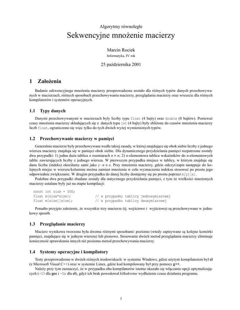 Algorytmy równoległe Sekwencyjne mnożenie macierzy Marcin Rociek Informatyka, IV rok 25 października 2001 1 Założenia Badanie sekwencyjnego mnożenia macierzy przeprowadzone zostało dla różnych typów danych przechowywanych w macierzach, różnych sposobach przechowywania macierzy, przegladania ˛ macierzy oraz wreszcie dla różnych kompilatorów i systemów operacyjnych. 1.1 Typy danych Danymi przechowywanymi w macierzach były liczby typu float (4 bajty) oraz double (8 bajtów). Ponieważ czasy mnożenia macierzy składajacych ˛ si˛e z danych typu int (4 bajty) były zbliżone do czasów mnożenia macierzy liczb float, ograniczono si˛e wi˛ec tylko do tych dwóch wyżej wymienionych typów. 1.2 Przechowywanie macierzy w pami˛eci Generalnie macierze były przechowywane wedle takiej zasady, w której znajdujace ˛ si˛e obok siebie liczby z jednego wiersza macierzy znajduja si˛e w pami˛eci obok siebie. Dla dynamicznego przydzielania pami˛eci rozpatrzone zostały dwa przypadki: 1) jedna duża tablica o rozmiarach n n; 2) n-elementowa tablica wskaźników do n-elementowych tablic zawierajacych ˛ liczby z jednego wiersza. W pierwszym przypadku miejsce w tablicy, w którym znajduje si˛e dana liczba (indeks) określamy sami jako y n x. Przy mnożenia macierzy, gdzie odczyt/zapis nast˛epuje do kolejnych miejsc w wierszu/kolumnie można zamiast mnożenia w celu wyznaczenia indeksu stosowa ć po prostu jego odpowiednie zwi˛ekszanie. W drugim przypadku do danej liczby dostajemy si˛e po prostu poprzez m[y][x]. Podobne dwa przypadki zbadane zostały dla statycznego przydzielania pami˛eci, z tym że wielkości mnożonych macierzy ustalane były już na etapie kompilacji: const int size = 500; float m[size*size]; float m[size][size]; // w przypadku tablicy jednowymiarowej // w przypadku tablicy dwuwymiarowej Ponadto przyj˛eto założenie, że wszystkie trzy macierze (tj. wejściowe i wyjściowa) sa˛ przechowywane w jednakowy sposób. 1.3 Przegladanie ˛ macierzy Macierz wynikowa tworzona była dwoma różnymi sposobami: poziomo (wtedy zapisywane sa˛ kolejne komórki pami˛eci, znajdujace ˛ si˛e w jednym wierszu) lub pionowo. Stosowanie dwóch metod przegladania ˛ macierzy eliminuje konieczność sprawdzania innych niż pozioma metod przechowywania macierzy. 1.4 Systemy operacyjne i kompilatory Testy przeprowadzono w dwóch różnych środowiskach: w systemie Windows, gdzie użytym kompilatorem był cl (z Microsoft Visual C++) oraz w systemie Linux, gdzie kod kompilowany był przy pomocy g++. Należy przy tym zaznaczyć, że w przypadku obu kompilatorów istotne okazało si˛e właczanie ˛ opcji optymalizuja˛ cych (-O3 dla gcc i -Ox dla cl), gdyż ich brak powodował kilkukrotne wydłużenie czasu działania programu. 1 2 Wyniki dla macierzy 500 500 i 1000 1000 W tabeli 1 zestawiono czasy obliczeń (w sekundach), dla macierzy 500 500 i 1000 1000 dla każdego przypadku typu danych itp. Pogrubiona˛ czcionka˛ zaznaczone sa˛ wyniki najlepsze. Zaskakujace ˛ sa˛ niekorzystne wyniki otrzymane pod Linuxem dla małej macierzy liczb float, oraz wyniki otrzymane pod Windowsami dla dużej macierzy liczb double. W tym drugim przypadku jeszcze dziwniejsze jest dwukrotne wydłużenie czasu obliczeń przy wykorzystaniu dynamicznie zaalokowanego bloku pami˛eci! (1) W W W W W W W W L L L L L L L L (2) D D D D S S S S D D D D S S S S (3) A A V V A A V V A A V V A A V V (4) H V H V H V H V H V H V H V H V 500 500 3,15 4,15 5,37 4,3 3,15 4,18 3,14 4,20 l 3,7 4,14 6,11 5,03 4,67 5,06 4,55 5,27 float 1000 1000 34,14 35,55 48,8 38,38 36,82 38,13 37,46 35,29 30,82 35,03 51,77 42,14 39,44 43,68 38,98 44,65 double 500 500 1000 1000 5,7 127,74 8,2 108,88 8,07 80,73 9,23 82,99 5,4 65,4 4,99 61,82 5,49 68,93 4,84 59,76 4,97 49,48 6,46 51,34 9,57 77,66 6,94 58,89 6,31 81,26 7,79 87,52 6,31 76,93 7,78 88,27 Tablica 1: Porównanie czasu obliczeń dla różnych sposobów reprezentacji danych, kolejności ich przegladania ˛ itp. Kolumna (1) to system operacyjny (i co za tym idzie - kompilator): W - Windows (cl), L - Linux (gcc); kolumna (2) to sposób alokacji pami˛eci: D - dynamicznie, S - statycznie; kolumna (3) to sposób reprezentacji macierzy: A - jedna ˛ danych: H - poziomo, duża tablica n n, V - tablica n wektorów o rozmiarze n; kolumna (4) to kolejność przegladania V - pionowo. 3 Wykresy t f n Ponieważ serie liczb podane w tablicy 1 niewiele niestety mówia,˛ wykonano jeszcze kilka wykresów obrazuja˛ cych czas obliczeń w zależności od wielkości macierzy (testy te wykonano tylko dla przypadku pami˛eci alokowanej dynamicznie). Rysunek 1 przedstawia takie właśnie wykresy wykonane dla macierzy o rozmiarach od 300 300 do 700 700 z krokiem co 10. Widać, że niektóre z wykresów rosna˛ w miar˛e jednostajnie, inne zaś w sposób zabkowy. ˛ Charakterystycznym elementem jest dziwne spowolnienie obliczeń dla macierzy 640 640 wyst˛epujace ˛ w każdym przypadku, gdy macierz przechowywana jest w tablicy jednowymiarowej. Poza tym szczególnym przypadkiem wydaje si˛e, że przechowywanie macierzy w tablicy jednowymiarowej jest najlepszym rozwiazaniem ˛ (z wyjatkiem ˛ macierzy liczb double mnożonych pod Windowsami). Aby dokładniej przyjrzeć si˛e zagadkowej liczbie 640 wykonane zostały jeszcze dwa wykresy dla macierzy o rozmiarach od 635 635 do 645 645, przy czym dla zwi˛ekszenia pewności każdy wynik został wyznaczony jako średnia z 5 pomiarów. Jak widać na rysunku 2 oprócz wspomnianego spowolnienia macierzy 640 640 pojawiły si˛e nowe spowolnienia, tym razem dla macierzy przechowywanej jako wektory, ale tylko w przypadku Linuxa. 4 Wykorzystany sprz˛et i oprogramowanie Testy przeprowadzone zostały na maszynie wyposażonej w procesor Intel Celeron 433MHz, 128KB pami˛eci podr˛ecznej, 384MB pami˛eci RAM. Systemem operacyjnym był Windows 98 SE oraz Linux (Slackware 7, jadro ˛ 2.2.13). Do kompilacji używany był kompilator cl 11.00.7022 (z MSVC++ 5.0) oraz g++ egcs