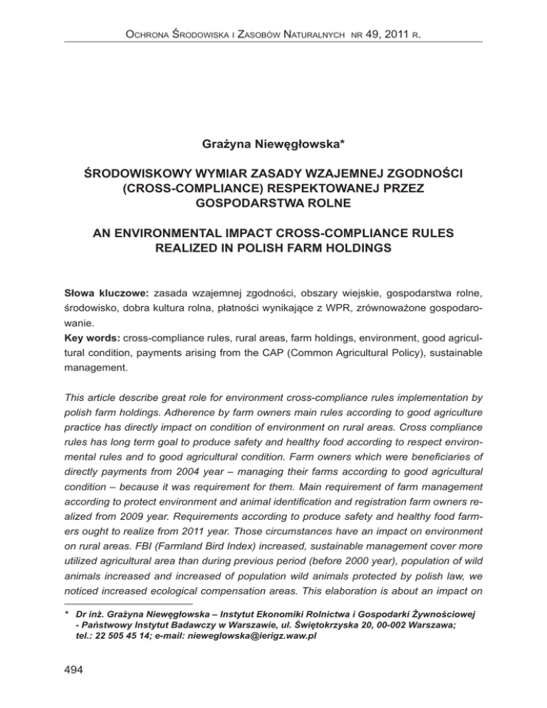 Ochrona Środowiska i Zasobów Naturalnych nr 49, 2011 r. Grażyna Niewęgłowska* Środowiskowy wymiar zasady wzajemnej zgodności (cross-compliance) respektowanej przez gospodarstwa rolne An environmental impact cross-compliance rules realized in polish farm holdings Słowa kluczowe: zasada wzajemnej zgodności, obszary wiejskie, gospodarstwa rolne, środowisko, dobra kultura rolna, płatności wynikające z WPR, zrównoważone gospodarowanie. Key words: cross-compliance rules, rural areas, farm holdings, environment, good agricultural condition, payments arising from the CAP (Common Agricultural Policy), sustainable management. This article describe great role for environment cross-compliance rules implementation by polish farm holdings. Adherence by farm owners main rules according to good agriculture practice has directly impact on condition of environment on rural areas. Cross compliance rules has long term goal to produce safety and healthy food according to respect environmental rules and to good agricultural condition. Farm owners which were beneficiaries of directly payments from 2004 year – managing their farms according to good agricultural condition – because it was requirement for them. Main requirement of farm management according to protect environment and animal identification and registration farm owners realized from 2009 year. Requirements according to produce safety and healthy food farmers ought to realize from 2011 year. Those circumstances have an impact on environment on rural areas. FBI (Farmland Bird Index) increased, sustainable management cover more utilized agricultural area than during previous period (before 2000 year), population of wild animals increased and increased of population wild animals protected by polish law, we noticed increased ecological compensation areas. This elaboration is about an impact on * Dr inż. Grażyna Niewęgłowska – Instytut Ekonomiki Rolnictwa i Gospodarki Żywnościowej - Państwowy Instytut Badawczy w Warszawie, ul. Świętokrzyska 20, 00-002 Warszawa; tel.: 22 505 45 14; e-mail: [email protected] 494 Środowiskowy wymiar zasady wzajemnej zgodności (cross-compliance)... environment changes in polish farm holdings result from applied to c-c rules farm owners during last years in comparison to the period before The Republic of Poland elaborated to European Union. Managing according to cross-compliance rules has direct impact on environment on rural areas. 1. WPROWADZENIE Wymogi wzajemnej zgodności dotyczące norm zarządzania gospodarstwem oraz przestrzegania dobrej kultury rolnej nie są nowymi zasadami gospodarowania w rolnictwie. Takie zasady stosowali nasi przodkowie. Gospodarowali oni bowiem zgodnie z zasadami ochrony przyrody i dziedzictwa narodowego – jednocześnie produkując żywność bezpieczną zdrowotnie. Stosowali zrównoważenie produkcji roślinnej ze zwierzęcą, co pozwalało im na odpowiednie nawożenie pól nawozem naturalnym. Przestrzegali zróżnicowanej struktury upraw, gdyż produkowali własne pasze dla zwierząt, a ich gospodarstwa nie były pozbawione trwałych użytków zielonych. Gospodarstwa naszych przodków zawierały obiekty kompensacji ekologicznej – naturalne było występowanie miedz, oczek wodnych i zadrzewień czy zakrzaczeń, wzbogacających krajobraz oraz stanowiących ochronę gleby przed erozją wietrzną i wodną. Stosowane było zmianowanie, nawożenie naturalne oraz poplony, międzyplony czy wsiewki, co w efekcie działało korzystnie na strukturę gleby i przeciwdziałało erozji. Wynikiem tych działań w gospodarstwach były lepsze efekty produkcyjne oraz wysoka różnorodność biologiczna na obszarach wiejskich. Pod koniec XX wieku presja na otrzymanie większych wyników produkcyjno-ekonomicznych w rolnictwie przyczyniła się do zaprzestania przestrzegania norm dobrej kultury rolnej oraz ochrony środowiska. Wskutek intensywnej gospodarki rolnej: zubożał krajobraz, zmniejszyła się bioróżnorodność, nastąpiło zatrucie wód gruntowych. Nieprzestrzeganie zrównoważonego zarządzania gruntami spowodowało zubożenie gleby w warstwę próchnicy. Rolnik przestał być zarządzającym środowiskiem gospodarzem i strażnikiem przyrody – stał się agrobiznesmenem, a przede wszystkim producentem żywności. Taka presja na coraz większą wydajność od zwierzęcia czy z hektara użytków rolnych wywarła niekorzystny wpływ na jakość produktów rolnych. W ostatnich latach bowiem mamy do czynienia z chorobami związanymi ze spożyciem żywności pochodzącej z tzw. przemysłowego chowu zwierząt, np. grypą ptasią czy też chorobą Creutzweldta-Jakoba. Tak produkowana żywność nie jest bezpieczna zdrowotnie. Wielkoobszarowe gospodarstwa rolne z produkcją roślinną – pozbawione obiektów kompensacji ekologicznej, tzn.: miedz, zadrzewień, zakrzaczeń, oczek wodnych i innych refugiów stanowiących naturalne korytarze ekologiczne – są narażone na kataklizmy, takie jak powodzie czy susze. Naturalne zadrzewienia, zakrzaczenia, miedze i oczka wodne podczas suszy stanowią bowiem naturalny rezerwuar wodny a podczas powodzi – naturalną przeszkodę dla żywiołu niszczącego uprawy. 495 Grażyna Niewęgłowska Dlatego też w ostatnich latach Wspólna Polityka Rolna (WPR) kładzie nacisk na przestrzeganie norm związanych ze stosowaniem w gospodarstwach dobrej kultury rolnej, dbaniem o dobrostan zwierząt oraz ochronę środowiska. Każdy rolnik, który jest beneficjentem płatności bezpośrednich, czyli uczestniczy we WPR powinien stosować się do zasad gospodarowania w rolnictwie zapewniających: 1) utrzymanie gruntów wchodzących w skład gospodarstwa w Dobrej Kulturze Rolnej zgodnie z ochroną środowiska (Good Agricultural and Environmental Conditions – GAEC), określonych w załączniku III do rozporządzenia Rady nr 73/2009 (od 2004 r.); 2) przestrzeganie podstawowych wymogów z zakresu zarządzania (Statutory Management Requirements – SMR