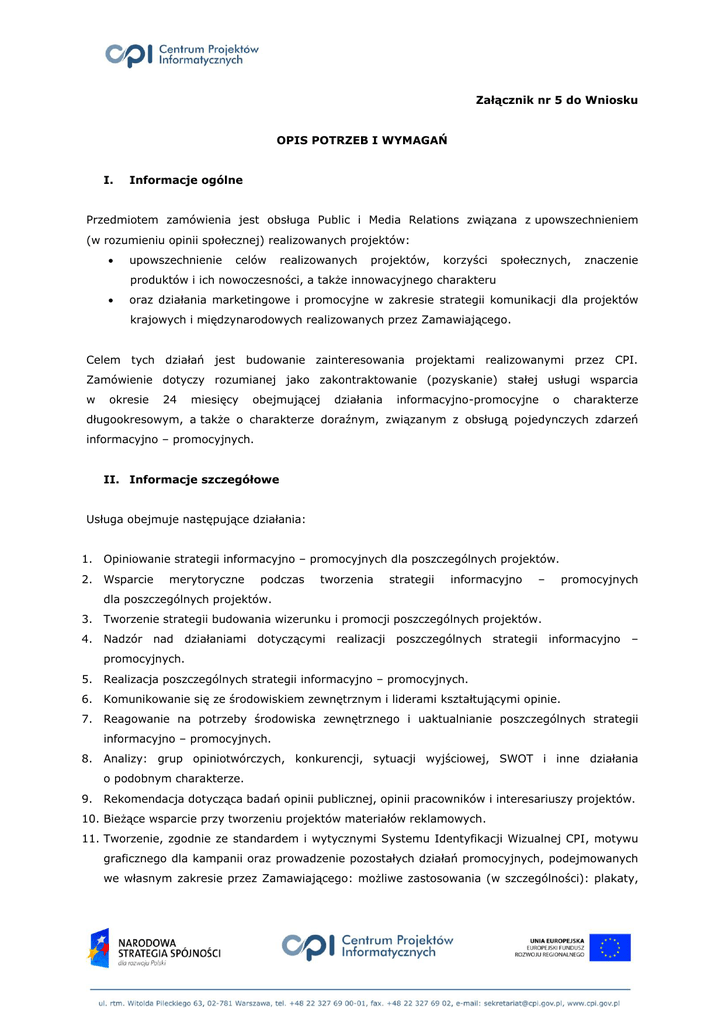 Załącznik nr 5 do Wniosku OPIS POTRZEB I WYMAGAŃ I. Informacje ogólne Przedmiotem zamówienia jest obsługa Public i Media Relations związana z upowszechnieniem (w rozumieniu opinii społecznej) realizowanych projektów: upowszechnienie celów realizowanych projektów, korzyści społecznych, znaczenie produktów i ich nowoczesności, a także innowacyjnego charakteru oraz działania marketingowe i promocyjne w zakresie strategii komunikacji dla projektów krajowych i międzynarodowych realizowanych przez Zamawiającego. Celem tych działań jest budowanie zainteresowania projektami realizowanymi przez CPI. Zamówienie dotyczy rozumianej jako zakontraktowanie (pozyskanie) stałej usługi wsparcia w okresie 24 miesięcy obejmującej działania informacyjno-promocyjne o charakterze długookresowym, a także o charakterze doraźnym, związanym z obsługą pojedynczych zdarzeń informacyjno – promocyjnych. II. Informacje szczegółowe Usługa obejmuje następujące działania: 1. Opiniowanie strategii informacyjno – promocyjnych dla poszczególnych projektów. 2. Wsparcie merytoryczne podczas tworzenia strategii informacyjno – promocyjnych dla poszczególnych projektów. 3. Tworzenie strategii budowania wizerunku i promocji poszczególnych projektów. 4. Nadzór nad działaniami dotyczącymi realizacji poszczególnych strategii informacyjno – promocyjnych. 5. Realizacja poszczególnych strategii informacyjno – promocyjnych. 6. Komunikowanie się ze środowiskiem zewnętrznym i liderami kształtującymi opinie. 7. Reagowanie na potrzeby środowiska zewnętrznego i uaktualnianie poszczególnych strategii informacyjno – promocyjnych. 8. Analizy: grup opiniotwórczych, konkurencji, sytuacji wyjściowej, SWOT i inne działania o podobnym charakterze. 9. Rekomendacja dotycząca badań opinii publicznej, opinii pracowników i interesariuszy projektów. 10. Bieżące wsparcie przy tworzeniu projektów materiałów reklamowych. 11. Tworzenie, zgodnie ze standardem i wytycznymi Systemu Identyfikacji Wizualnej CPI, motywu graficznego dla kampanii oraz prowadzenie pozostałych działań promocyjnych, podejmowanych we własnym zakresie przez Zamawiającego: możliwe zastosowania (w szczególności): plakaty, billboardy, bilety, zaproszenia, foldery, ulotki, reklama online, branding gadżetów reklamowych, materiały POS. 12. Tworzenie na potrzeby działań reklamowych projektów materiałów reklamowych przeznaczonych do emisji w mediach, co w szczególności obejmuje: a) scenariusze reklam telewizyjnych/kinowych lub reklam radiowych, b) projekty graficzne ogłoszeń prasowych oraz reklam zewnętrznych, w tym plakatów wielkoformatowych, c) projektów reklam internetowych. 13. Produkcja reklam telewizyjnych/kinowych lub reklam radiowych. 14. Produkcja filmów, zdjęć dokumentujących przebieg projektów realizowanych przez CPI. 15. Tworzenie na potrzeby działań reklamowych projektów innych materiałów reklamowych, a w szczególności materiałów reklamowych wspomagających akcje promocyjne, w tym projektów ulotek, plakatów, zaproszeń, folderów, materiałów POS, gadżetów itp. 16. Przygotowywanie plików graficznych do druku (usługi DTP). 17. Wykonywanie (produkcję) materiałów reklamowych (w tym różnych gadżetów). 18. Organizacja warsztatów, szkoleń, wystaw, eventów, animacji, samplingów materiałów reklamowych, konferencji on-line. 19. Organizacja konferencji (w tym konferencji prasowych), w tym w szczególności: a) wysyłka materiałów do mediów, b) wybór najlepszego miejsca realizacji, c) obsługa techniczna, w tym: zapewnienie systemu projekcji, nagłośnienie konferencyjne, oświetlenie, tłumaczy, d) rezerwacja miejsc hotelowych dla uczestników oraz VIP, e) opracowanie graficzne i produkcja zaproszeń, f) opracowanie graficzne, druk oraz produkcja materiałów konferencyjnych (teczki konferencyjne, kalendarze, notesy, smycze, długopisy, identyfikatory i inne), g) opracowanie i przygotowanie animacji czołówki z logo firmy i nazwą imprezy, h) opracowanie prezentacji multimedialnej według dostarczonych przez Zamawiającego materiałów lub obróbka edycyjna gotowych prezentacji, i) opracowanie, projekt i produkcja upominków dla uczestników imprezy, j) organizacja profesjonalnej recepcji połączonej z rejestracją dla uczestników, k) strona WWW dedykowana konferencji, l) obsługa gastronomiczna. 20. Przygotowywanie, redagowanie treści artykułów eksperckich, sponsorowanych i innych materiałów dla prasy itp. 21. Tworzenie projektów bannerów internetowych, stron internetowych, wykonywanie stron internetowych, zamieszczanie w sieci Internet, utrzymywanie na serwerach oraz zarządzanie stronami internetowymi, w tym dokonywanie ich aktualizacji. 22. Wysyłka poczty elektronicznej (e-mail). 23. Koordynacja działań promocyjnych w mediach społecznościowych (social media). str. 2 z 3 (hosting) 24. Tworzenie raportów rynkowych oraz post-kampanijnych (pełny opis wykonywanych w ramach kampanii działań wraz z harmonogramem ich realizacji; sprawozdanie z wykonania media planu; dokumentacja graficzna kampanii uwzględniająca wszystkie wykorzystane w jej ramach materiały reklamowe; opis metodologii oraz wyniki badań skuteczności kampanii). 25. Realizacja badań skuteczności kampanii. 26. Zarządzania bazami danych. III. MEDIA Usługi planowania i zakupu mediów obejmują: 1. Opracowywanie założeń kampanii reklamowej w mediach wraz z określeniem budżetu niezbędnego do jej realizacji. 2. Opracowywanie planów emisji materiałów reklamowych w mediach, zwanych dalej „Media planami”, zawierających informacje dotyczące: a) dat emisji / publikacji reklam w poszczególnych mediach, b) wartości kampanii, tj. cen po potrąceniu upustów i rabatów, c) harmonogramu przedpłat i dat dostarczenia materiałów podlegających publikacji bądź emisji. 3. Rezerwację, negocjowanie warunków finansowych i zakupu czasu antenowego lub przestrzeni rek