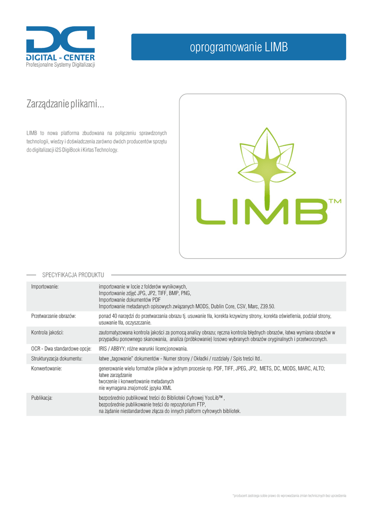 oprogramowanie LIMB Zarządzanie plikami... LIMB to nowa platforma zbudowana na połączeniu sprawdzonych technologii, wiedzy i doświadczenia zarówno dwóch producentów sprzętu do digitalizacji i2S DigiBook i Kirtas Technology. SPECYFIKACJA PRODUKTU Importowanie: importowanie w locie z folderów wynikowych, Importowanie zdjęć JPG, JP2, TIFF, BMP, PNG, Importowanie dokumentów PDF Importowanie metadanych opisowych związanych MODS, Dublin Core, CSV, Marc, Z39.50. Przetwarzanie obrazów: ponad 40 narzędzi do przetwarzania obrazu tj. usuwanie tła, korekta krzywizny strony, korekta oświetlenia, podział strony, usuwanie tła, oczyszczanie. Kontrola jakości: zautomatyzowana kontrola jakości za pomocą analizy obrazu; ręczna kontrola błędnych obrazów, łatwa wymiana obrazów w przypadku ponownego skanowania, analiza (próbkowanie) losowo wybranych obrazów oryginalnych i przetworzonych. OCR - Dwa standardowe opcje: IRIS / ABBYY; różne warunki licencjonowania. Strukturyzacja dokumentu: łatwe „tagowanie” dokumentów - Numer strony / Okładki / rozdziały / Spis treści Itd.. Konwertowanie: generowanie wielu formatów plików w jednym procesie np. PDF, TIFF, JPEG, JP2, METS, DC, MODS, MARC, ALTO; łatwe zarządzanie tworzenie i konwertowanie metadanych nie wymagana znajomość języka XML Publikacja: bezpośrednio publikować treści do Biblioteki Cyfrowej YooLib™, bezpośrednie publikowanie treści do repozytorium FTP, na żądanie niestandardowe złącza do innych platform cyfrowych bibliotek. *producent zastrzega sobie prawo do wprowadzania zmian technicznych bez uprzedzenia