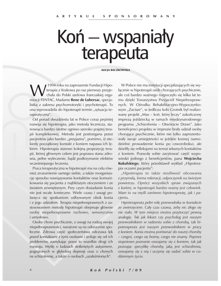 A R T Y K U ¸ S P O N S O R O W A N Y Koƒ – wspania∏y terapeuta ALICJA RACZKOWSKA 1994 roku na zaproszenie Fundacji Hipoterapia z Krakowa po raz pierwszy przyjecha∏a do Polski szefowa francuskiej organizacji FENTAC, Madame Rene de Lubersac, specjalistka z zakresu psychomotoryki i psychoterapii. To ona wprowadzi∏a do hipoterapii termin „sytuacja terapeutyczna”. Od ponad dwudziestu lat w Polsce coraz pr´˝niej rozwija si´ hipoterapia, jako metoda lecznicza, stanowiàca bardzo istotne ogniwo szeroko poj´tej terapii kompleksowej. Metoda jest postrzegana przez pacjentów jako bardzo „przyjazna”, pomimo, i˝ niekiedy poczàtkowy kontakt z koniem napawa ich l´kiem. Hipoterapia stanowi kolejnà propozycj´ terapii, której g∏ównym celem jest poprawa stanu zdrowia, pe∏ne wyleczenie, bàdê podtrzymanie efektów wczeÊniejszego leczenia. Praca terapeutyczna w hipoterapii ma na celu równie˝ zrozumienie samego siebie, a tak˝e reorganizacj´ sposobu nawiàzywania kontaktów oraz komunikowania si´ pacjenta z najbli˝szym otoczeniem i ze Êwiatem zewn´trznym. Przy czym dosiadanie konia nie jest wcale konieczne. Wiele czasu i uwagi poÊwi´ca si´ spotkaniom odbywanym obok konia i z jego udzia∏em. Terapia niepe∏nosprawnych z zastosowaniem metody hipoterapii obejmuje g∏ównie osoby niepe∏nosprawne ruchowo, sensorycznie i umys∏owo. Osoby chore psychicznie, z uwagi na rodzaj swojej niepe∏nosprawnoÊci, nara˝one sà na odrzucenie spo∏eczne. Zdrowa cz´Êç spo∏eczeƒstwa odczuwa l´k przed kontaktami z tymi osobami i izoluje si´ od ich problemów, zamykajàc przez to wszelkie drogi ich rozwoju. MyÊl´ o ludziach dotkni´tych autyzmem, pogrà˝onych w g∏´bokiej depresji oraz o chorych na schizofreni´, a tak˝e o osobach „uzale˝nionych”. W 4 K o ƒ W Polsce nie ma instytucji specjalizujàcych si´ wy∏àcznie w hipoterapii osób chorujàcych psychicznie, ale coÊ bardzo wa˝nego rozpocz´∏o si´ kilka lat temu dzi´ki Towarzystwu Przyjació∏ Niepe∏nosprawnych. W OÊrodku Rehabilitacyjno-Wypoczynkowym „Zacisze”, w Jedliczu ko∏o Grotnik by∏ realizowany projekt „Max – koƒ, który leczy” zakoƒczony imprezà jeêdzieckà w ramach mi´dzynarodowego programu „Schizofrenia – Otwórzcie Drzwi”. Jako beneficjenci projektu w imprezie bra∏y udzia∏ osoby chorujàce psychicznie, które nie tylko zaprezentowa∏y swoje umiej´tnoÊci w jeêdzie konnej (samodzielne prowadzenie konia po czworoboku), ale dzieli∏y si´ refleksjami na temat w∏asnych kontaktów z koniem. Pozwol´ sobie zacytowaç cz´Êç wypowiedzi jednego z beneficjentów, pana Wojciecha Kukulskiego, który przedstawi∏ wyk∏ad „Hipoterapia oczami pacjenta”: „Hipoterapia to tak˝e mo˝liwoÊç obcowania z przyrodà, forma rekreacji, odpoczynek na Êwie˝ym powietrzu. Oprócz wszystkich spraw zwiàzanych z koƒmi, w hipoterapii bardzo wa˝ny jest cz∏owiek. Mam tu na myÊli zarówno hipoterapeut´, jak i pacjenta. Hipoterapeuta pe∏ni rol´ przewodnika w kontakcie ze zwierz´ciem. Ca∏y czas czuwa, ˝eby nic z∏ego si´ nie sta∏o. W tym miejscu mo˝na przytoczyç pewnà analogi´. Tak jak lekarz czy psycholog jest naszym przewodnikiem w radzeniu sobie z chorobà, tak hipoterapeuta jest naszym przewodnikiem w pracy z koniem. Konia mo˝na porównaç do naszej choroby – czegoÊ, czego si´ boimy, czego nie znamy. Poprzez stopniowe poznanie oswajamy si´ z koniem, tak jak poznajàc specyfik´ choroby, jakà jest schizofrenia, oswajamy si´ z nià i uczymy si´ radziç sobie w codziennym ˝yciu. Po l s k i 7 / 0 9 Koƒ jest du˝ym zwierz´ciem; z poczàtku obcowanie z nim budzi pewien l´k. W miar´ jak go poznajemy, przestajemy si´ baç. Z czasem jazda konna zaczyna nam sprawiaç przyjemnoÊç. UÊwiadamiamy sobie, ˝e przy zachowaniu pewnych zasad i w∏aÊciwym post´powaniu nic z∏ego nam nie grozi. Stopniowo strach ust´puje miejsca radoÊci i zadowoleniu. Odczuwamy satysfakcj´ widzàc w∏asne post´py. Wynika ona z faktu prze∏amania swojej poczàtkowej niech´ci i oporów. W trakcie zaj´ç z koƒmi dowiadujemy si´ wielu nowych rzeczy o sobie. Dochodzimy do wniosku, ˝e jesteÊmy osobami, które potrafià pokonywaç w∏asne l´ki, mogà otwieraç si´ na nowe doÊwiadczenia, robiç coÊ niecodziennego, dzi´ki zdobyciu umiej´tnoÊci wspó∏pracy w grupie mogà ˝yç w spo∏eczeƒstwie a nie pozostawaç w izolacji. Hipoterapia jest swoistym lekiem na naszà chorob´. Dzi´ki niej nie zamykamy si´ w domu”. Jestem podbudowana tà wypowiedzià, dodaje mi ona energii i si∏ do walki „o hipoterapi´”. Przyjacielskie i partnerskie kontakty z koniem wyd∏u˝ajà okresy remisji choroby oraz wp∏ywajà na to, ˝e pacjenci czujà si´ lepiej, uÊwiadamiajàc sobie, ˝e sà wa˝nymi i wartoÊciowymi ludêmi. Niektórzy z nich podejmujà prac´, cz´sto jest to praca w∏aÊnie przy koniach. Innym bardzo powa˝nym schorzeniem, poddawanym leczeniu hipoterapià, jest zespó∏ objawów zwanych autyzmem. Chorujàcy na autyzm nie sà w stanie do koƒca dopasowaç si´ do spo∏eczeƒstwa. Najcz´Êciej nie pos∏ugujà si´ j´zykiem mówionym, majà silne zahamowania nawykowe. Osoby autystyczne dobrze czujà si´ w Êwiecie funkcjonujàcym wg rutynowych, powtarzajàcych si´ cykli, bojà si´ wszelkich zmian, nie potrafià si´ skupiç na podstawowych zadaniach niezb´dnych do funkcjonowania. ˚yjà w swoim w∏asnym Êwiecie stworzonym z obrazów, swoje potrzeby manifestujà poprzez mow´ cia∏a. Monty Roberts zauwa˝y∏, ˝e podobnie jak konie, które sà zwierz´tami „uciekajàcymi”, autystycy nie lubià kontaktu wzrokowego i nie znoszà, gdy ktoÊ podchodzi wprost do nich. Nag∏e, g∏oÊne dêwi´ki i zamkni´te przestrzenie wzbudzajà w nich l´k. Zbli˝ajàc si´ do innych osób najch´tniej pozostajà poza zasi´giem ich wzroku. Osoby autystyczne i konie reagujà jedynie na aktualne sytuacje, których obraz zosta∏ w danym momenc