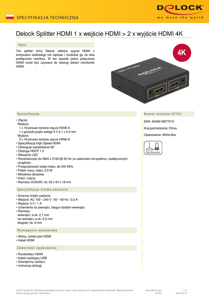 Delock Splitter HDMI 1 x wejście HDMI > 2 x wyjście HDMI 4K Opis Ten splitter firmy Delock odbiera sygnał HDMI z komputera osobistego lub laptopa i rozdziela go na dwa podłączone monitory. W ten sposób jedno połączenie HDMI może być używane do obsługi dwóch monitorów HDMI. Specyfikacja • Złącze: Wejście: 1 x 19-pinowe żeńskie złącze HDMI-A 1 x gniazdo prądu sałego 5 V 2,1 x 5,5 mm Wyjście: 2 x 19-pinowe żeńskie złącze HDMI-A • Specyfikacja High Speed HDMI • Obsługuje wyświetlanie 3D • Obsługa HDCP 1.3 • Wskaźnik LED • Rozdzielczość do 3840 x 2160 @ 30 Hz (w zależności od systemu i podłączonych urządzeń) • Przepustowość wideo maks. do 340 MHz • Pobór mocy: maks. 2,0 W • Metalowa obudowa • Kolor: czarny • Wymiary (DxSxW): ok. 63 x 54 x 18 mm Numer artykułu 87701 EAN: 4043619877010 Kraj pochodzenia: China Opakowanie: White Box Specyfikacje źródła zasilania • Ścienne źródło zasilania • Wejście: AC 100 ~ 240 V / 50 ~ 60 Hz / 0,3 A • Wyjście: 5 V / 1 A • Uziemienie na zewnątrz, biegun dodatni wewnątrz • Wymiary: wewnątrz: ø ok. 2,1 mm na zewnątrz: ø ok. 5,5 mm długość: ok. 9 mm Wymagania systemowe • Wolny, żeński port HDMI • Kabel HDMI Zawartość opakowania • Rozdzielacz HDMI • Kabel zasilający USB • Zewnętrzny zasilacz • Instrukcja obsługi © 2017 by Delock. Wszelkie pojawiające się tutaj nazwy i znaki należą do ich odpowiednich właścicieli. Błędy drukarskie, zmiany & pomyłki zastrzeżone. www.delock.com 87701 1/3 04.03.2017 Zdjęcia © 2017 by Delock. Wszelkie pojawiające się tutaj nazwy i znaki należą do ich odpowiednich właścicieli. Błędy drukarskie, zmiany & pomyłki zastrzeżone. www.delock.com 87701 2/3 04.03.2017 General Specyfikacja : High Speed HDMI HDCP 1.3 Interface Wyjście: 2 x 19-pinowe żeńskie złącze HDMI-A Wejście: 1 x 19-pinowe żeńskie złącze HDMI-A 1 x 5 V DC female 5,5 mm x 2,1 mm Technical characteristics Maximum screen resolution: 3840 x 2160 @ 30 Hz Video bandwidth: 340 MHz Physical characteristics Housing colour: czarny Housing material: metal Length: 60 mm Width: 56 mm Height: 22 mm Power supply Type: Euro wall power supply Input: AC 100 - 240 V / 50 - 60 Hz / 0,3 A Output: 5V/1A Connector: DC male 5.5 mm x 2.1 mm Cable length: 1m © 2017 by Delock. Wszelkie pojawiające się tutaj nazwy i znaki należą do ich odpowiednich właścicieli. Błędy drukarskie, zmiany & pomyłki zastrzeżone. Powered by TCPDF (www.tcpdf.org) www.delock.com 87701 3/3 04.03.2017