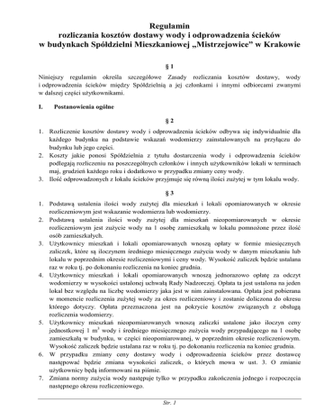 Regulamin rozliczania kosztów dostawy wody i odprowadzenia ścieków w budynkach Spółdzielni Mieszkaniowej „Mistrzejowice” w Krakowie §1 Niniejszy regulamin określa szczegółowe Zasady rozliczania kosztów dostawy, wody i odprowadzenia ścieków między Spółdzielnią a jej członkami i innymi odbiorcami zwanymi w dalszej części użytkownikami. I. Postanowienia ogólne §2 1. Rozliczenie kosztów dostawy wody i odprowadzenia ścieków odbywa się indywidualnie dla każdego budynku na podstawie wskazań wodomierzy zainstalowanych na przyłączu do budynku lub jego części. 2. Koszty jakie ponosi Spółdzielnia z tytułu dostarczenia wody i odprowadzenia ścieków podlegają rozliczeniu na poszczególnych członków i innych użytkowników lokali w terminach maj, grudzień każdego roku i dodatkowo w przypadku zmiany ceny wody. 3. Ilość odprowadzonych z lokalu ścieków przyjmuje się równą ilości zużytej w tym lokalu wody. §3 1. Podstawą ustalenia ilości wody zużytej dla mieszkań i lokali opomiarowanych w okresie rozliczeniowym jest wskazanie wodomierza lub wodomierzy. 2. Podstawą ustalenia ilości wody zużytej dla mieszkań nieopomiarowanych w okresie rozliczeniowym jest zużycie wody na 1 osobę zamieszkałą w lokalu pomnożone przez ilość osób zamieszkałych. 3. Użytkownicy mieszkań i lokali opomiarowanych wnoszą opłaty w formie miesięcznych zaliczek, które są iloczynem średniego miesięcznego zużycia wody w danym mieszkaniu lub lokalu w poprzednim okresie rozliczeniowymi i ceny wody. Wysokość zaliczek będzie ustalana raz w roku tj. po dokonaniu rozliczenia na koniec grudnia. 4. Użytkownicy mieszkań i lokali opomiarowanych wnoszą jednorazowo opłatę za odczyt wodomierzy w wysokości ustalonej uchwałą Rady Nadzorczej. Opłata ta jest ustalona na jeden lokal bez względu na liczbę wodomierzy jaka jest w nim zainstalowana. Opłata jest pobierana w momencie rozliczenia zużytej wody za okres rozliczeniowy i zostanie doliczona do okresu którego dotyczy. Opłata przeznaczona jest na pokrycie kosztów związanych z obsługą rozliczenia wodomierzy. 5. Użytkownicy mieszkań nieopomiarowanych wnoszą zaliczki ustalone jako iloczyn ceny jednostkowej 1 m3 wody i średniego miesięcznego zużycia wody przypadającego na 1 osobę zamieszkałą w budynku, w części nieopomiarowanej, w poprzednim okresie rozliczeniowym. Wysokość zaliczek będzie ustalana raz w roku tj. po dokonaniu rozliczenia na koniec grudnia. 6. W przypadku zmiany ceny dostawy wody i odprowadzenia ścieków przez dostawcę następować będzie zmiana wysokości zaliczek, o których mowa w ust. 3. O zmianie użytkownicy będą informowani na piśmie. 7. Zmiana normy zużycia wody następuje tylko w przypadku zakończenia jednego i rozpoczęcia następnego okresu rozliczeniowego. Str. 1 Regulamin rozliczania kosztów dostawy wody i odprowadzenia ścieków w budynkach SM „Mistrzejowice” w Krakowie 8. W przypadku zmiany użytkownika lokalu wskutek jego zbycia (tj. sprzedaży, darowizny, zamiany, dziedziczenia itp.) nowy nabywca przejmuje obowiązek rozliczania kosztów zużycia wody i odprowadzania ścieków, zapis ten dotyczy rozliczania kosztów zużycia wody tak w lokalach opomiarowanych jak i mieszkaniach nieopomiarowanych. §4 1. Dla budynków lub ich części, w których 100% mieszkań wyposażonych jest w wodomierze różnicę wynikłą z rozliczenia kosztów pomiędzy Spółdzielnią a użytkownikami obciąża się koszty eksploatacji podstawowej budynku. 2. Dla pozostałych budynków ilość wody zużywanej przez 1 osobę zamieszkałą w lokalu ustala się w następujący sposób: a) od wskazania wodomierza w budynku odejmuje się 5% wartości na zużycie wody związane z eksploatacją i utrzymaniem nieruchomości wspólnej, b) od uzyskanej różnicy odejmuje się zużycie wody w lokalach opomiarowanych, c) otrzymaną w punkcie b) wartość dzieli się przez liczbę osób zamieszkałych w nieopomiarowanych lokalach tego budynku. Jeżeli wyliczone w ten sposób zużycie wody jest większe niż 10 m3 na osobę, Spółdzielnia naliczy ryczałt w wysokości 10 m3. Wynikłą z rozliczenia kosztów różnicą obciąża się koszty eksploatacji budynku. II. Rozliczenie kosztów zużycia wody w lokalach opomiarowanych §5 1. Podstawą do rozliczeń kosztów zużycia wody w mieszkaniach opomiarowanych są wskazania wodomierza lub wodomierzy. 2. Warunkiem do naliczania należności za zużytą wodę według wodomierzy indywidualnych jest dokonanie technicznego odbioru montażu. 3. Po odbiorze wodomierza, do czasu ustalenia normy na lokal, przyjmuje się do naliczenia zaliczki na poczet kosztów za zużytą wodę wg opłaty miesięcznej na osobę jak dla lokali nieopomiarowanych. 4. Zmiana normy zużycia wody na lokal następuje tylko w przypadku zakończenia jednego i rozpoczęcia następnego okresu rozliczeniowego. 5. Rozliczenie kosztów zużycia wody dostarczane jest na piśmie do poszczególnych użytkowników przez pracowników Spółdzielni. 6. Różnica powstała w wyniku rozliczenia kosztów zużycia wody a zaliczkami wpłacanymi przez użytkowników regulowana będzie następująco: a. niedopłatę użytkownik wnosi przy uiszczaniu należności za używanie lokalu w miesiącu następnym po dokonaniu rozliczenia. W uzasadnionych przypadkach zapłata należności może być wniesiona w kilku ratach nie mniejszych niż 20 zł każda. Decyzje w tej sprawie podejmuje Zarząd Spółdzielni na umotywowany wniosek zainteresowanego lokatora, b. nadpłatę zalicza się na poczet najbliższych należności za używanie lokalu, c. nadpłatę w przypadku użytkowników zadłużonych wobec Spółdzielni zalicza się w pierwszej kolejności na poczet zadłużenia z tytułu należności za używanie lokalu. 7. Dokonywanie przez użytkowników jakichkolwiek potrąceń przed otrzymaniem zawiadomienia i w wysokości innej niż podana w zawiadomieniu jest niedopuszczalne. 8. Rozliczenie w