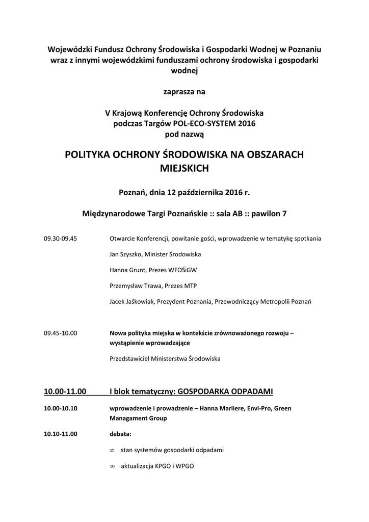Wojewódzki Fundusz Ochrony Środowiska i Gospodarki Wodnej w Poznaniu wraz z innymi wojewódzkimi funduszami ochrony środowiska i gospodarki wodnej zaprasza na V Krajową Konferencję Ochrony Środowiska podczas Targów POL-ECO-SYSTEM 2016 pod nazwą POLITYKA OCHRONY ŚRODOWISKA NA OBSZARACH MIEJSKICH Poznań, dnia 12 października 2016 r. Międzynarodowe Targi Poznańskie :: sala AB :: pawilon 7 09.30-09.45 Otwarcie Konferencji, powitanie gości, wprowadzenie w tematykę spotkania Jan Szyszko, Minister Środowiska Hanna Grunt, Prezes WFOŚiGW Przemysław Trawa, Prezes MTP Jacek Jaśkowiak, Prezydent Poznania, Przewodniczący Metropolii Poznań 09.45-10.00 Nowa polityka miejska w kontekście zrównoważonego rozwoju – wystąpienie wprowadzające Przedstawiciel Ministerstwa Środowiska 10.00-11.00 I blok tematyczny: GOSPODARKA ODPADAMI 10.00-10.10 wprowadzenie i prowadzenie – Hanna Marliere, Envi-Pro, Green Managament Group 10.10-11.00 debata: • stan systemów gospodarki odpadami • aktualizacja KPGO i WPGO • in-house vs. wolny rynek • spalarnie odpadów w polskich metropoliach • współpraca metropolitarna / międzygminna w prowadzeniu systemów gospodarki odpadami • gospodarka osadami ściekowymi • gospodarka cyrkulacyjna – jak bardzo realne w polskich miastach? 11.00-12.00 II blok tematyczny: ENERGETYKA 11.00-11.10 Wprowadzenie i prowadzenie: Marek Zieliński, wiceprezes WFOŚiGW w Poznaniu 11.10-12.00 debata: • elementy zarządzania bezpieczeństwem energetycznym • zarządzanie energetyczne w miastach • efektywność energetyczna • bezpieczeństwo przesyłowe • blockout – realne zagrożenie czy scenariusz fiction? • poważne awarie przemysłowe • ochrona powietrza • przygotowanie energetyki do obsługi prosumenta • nowe bloki energetyczne dla miast? 12.00-12.30 przerwa 12.30-13.30 III blok tematyczny: PLANOWANIE PRZESTRZENNE W OBSZARACH METROPOLITARNYCH 13.30-13.40 wprowadzenie i prowadzenie – prof. Andrzej Mizgajski, przewodniczący Państwowej Rady Ochrony Środowiska, UAM 13.40-14.30 debata: • zrównoważone planowanie przestrzenne • wspólne planowanie przestrzenne gmin tworzących obszary metropolitarne • zagrożenia dla zrównoważonego planowania przestrzennego • gospodarka wodna na obszarach zurbanizowanych • czy istnieje konflikt ochrona środowiska vs. rozwój w kontekście planowania przestrzennego? 13.30-14.30 IV blok tematyczny: GOSPODARKA WODNA 13.30-13.40 wprowadzenie i prowadzenie – prof. Piotr Kowalczak 13.40-14.30 debata: 14.30-15.00 • aktualizacja KPOŚK • zarządzania gospodarką wodną w metropoliach • ryzyko / zagrożenie powodziowe w metropoliach • ochrona ujęć wody pitnej • gospodarka wodna w planowaniu przestrzennym • zagrożenia dla zasobów wodnych w miastach • plany bezpieczeństwa wody dyskusja podsumowująca, zakończenie Konferencji