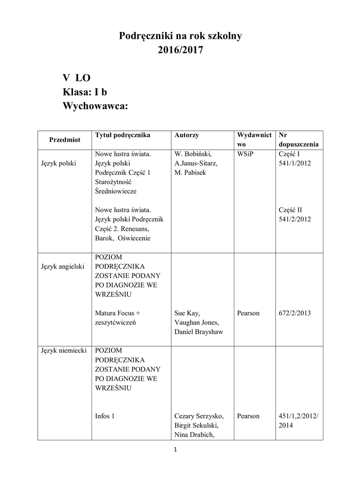 Podręczniki na rok szkolny 2016/2017 V LO Klasa: I b Wychowawca: Przedmiot Język polski Tytuł podręcznika Autorzy Nowe lustra świata. Język polski Podręcznik Część 1 Starożytność Średniowiecze W. Bobiński, A.Janus-Sitarz, M. Pabisek Wydawnict wo WSiP Nowe lustra świata. Język polski Podręcznik Część 2. Renesans, Barok, Oświecenie Język angielski Część II 541/2/2012 POZIOM PODRĘCZNIKA ZOSTANIE PODANY PO DIAGNOZIE WE WRZEŚNIU Matura Focus + zeszytćwiczeń Język niemiecki Nr dopuszczenia Część I 541/1/2012 Sue Kay, Vaughan Jones, Daniel Brayshaw Pearson 672/2/2013 Cezary Serzysko, Birgit Sekulski, Nina Drabich, Pearson 451/1,2/2012/ 2014 POZIOM PODRĘCZNIKA ZOSTANIE PODANY PO DIAGNOZIE WE WRZEŚNIU Infos 1 1 Tomasz Gajownik Meine Welttour 2 Sylwia Mróz – Dwornikowska Nowa Era 459/2/2012 Wiedza o kulturze Spotkania z kulturą. Podręcznik do wiedzy o kulturze dla liceum i technikum. M. Bokiniec, B. Forysiewicz, J. Michałowski, N. MrozkowiakNastrożna, G. Nazaruk, M. Sacha, G.Świętochowska Nowa Era 449/2012 Historia Poznać przeszłość. Wiek XX. Zakres podstawowy. S. Roszak, J. Kłaczkow Nowa Era 525/2012 Wiedza o społeczeństwie W centrum uwagi -WOS. Podręcznik dla liceum i technikum. A. Janicki Nowa Era 505/2012 Krok w przedsiębiorczość. Podręcznik do podstaw przedsiębiorczości dla szkół ponadgimnazjalnych. Z. Makieła, T. Rachwał Nowa Era 467/2012 Oblicza geografii. Podręcznik dla szkół ponadgimnazjalnych. Zakres podstawowy. + Atlas geograficzny. R. Uliszak, K. Wiedermann Nowa Era 433/2012 Biologia na czasie. Podręcznik dla szkół ponadgimnazjalnych. Zakres podstawowy + Karty pracy ucznia. E. Bonar, W. Krzeszowiec Jeleń, S. Czachorowski Nowa Era 450/2012 Biologia na czasie 1 Podręcznik dla liceum ogólnokształcącego i Marek Guzik, Ewa Jastrzębska Ryszard Kozik Nowa Era 564/1/2012 Podstawy przedsiębiorczości Geografia Biologia Nowa Era 2 technikum. Zakres rozszerzony + Maturalne karty pracy. Chemia To jest chemia Podręcznik dla szkół ponadgimnazjalnych. Zakres podstawowy oraz Karty pracy ucznia dla szkół ponadgimnazjalnych. Zakres podstawowy. Renata Matuszewska Ewa PyłkaGutowska Władysław Zamachowski R. Hassa, A. Mrzigod, J. Mrzigod Nowa Era 438/2012 A.Kwiek To jest chemia 1. Chemia ogólna i nieorganiczna. Podręcznik dla liceum ogólnokształcącego i technikum. Zakres rozszerzony.+ Maturalne karty pracy. Maria Litwin Szarota StykaWlazło Joanna Szymońska Nowa Era 581/1/2012 Odkryć fizykę. Zakres podstawowy + Zbiór zadań z fizyki dla szkół ponadgimnazjalnych. Zakres podstawowy. M. Braun, W. Śliwa Bogdan Mendel Janusz Mendel Nowa Era 447/2012 Matematyka Matematyka 1 Zakres podstawowy. W. Babiański, L. Chańko, D. Ponczek Nowa Era 378/1/2011 Informatyka Podręcznik dostępny w pracowni informatycznej Uczniowie nie mają obowiązku zakupu podręcznika Z nowym bitem. Informatyka dla szkół ponadgimnazjalnych Zakres podstawowy. Grażyna Koba Migra 536/2012 Fizyka 3 Nowa Era Edukacja dla bezpieczeństwa Żyję i działam bezpiecznie. Edukacja dla bezpieczeństwa. Podręcznik dla szkół ponadgimnazjalnych. Religia „W Kościele” (Podręcznik dostępny szkole. Uczniowie nie mają obowiązku zakupu podręcznika) J. Słoma Nowa Era 426/2012 Ks. Z. Marek A.Walulik WAM AZ-41-01/10KR-1/12 4
