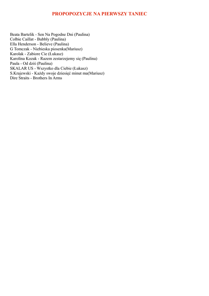 PROPOPOZYCJE NA PIERWSZY TANIEC Beata Bartelik - Sen Na Pogodne Dni (Paulina) Colbie Caillat - Bubbly (Paulina) Ella Henderson - Believe (Paulina) G Tomczak - Niebieska piosenka(Mariusz) Karolak - Zabiore Cie (Łukasz) Karolina Kozak - Razem zestarzejemy się (Paulina) Paula - Od dziś (Paulina) SKALAR US - Wszystko dla Ciebie (Łukasz) S.Krajewski - Każdy swoje dziesięć minut ma(Mariusz) Dire Straits - Brothers In Arms