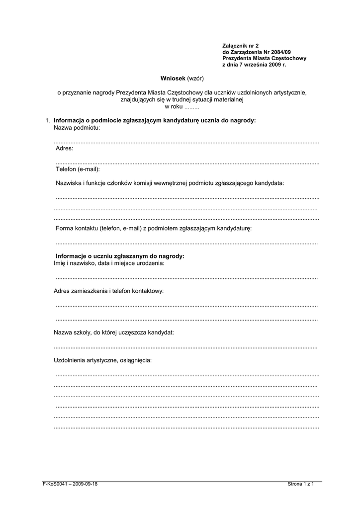 Załącznik nr 2 do Zarządzenia Nr 2084/09 Prezydenta Miasta Częstochowy z dnia 7 września 2009 r. Wniosek (wzór) o przyznanie nagrody Prezydenta Miasta Częstochowy dla uczniów uzdolnionych artystycznie, znajdujących się w trudnej sytuacji materialnej w roku ......... 1. Informacja o podmiocie zgłaszającym kandydaturę ucznia do nagrody: Nazwa podmiotu: ............................................................................................................................................................... Adres: .............................................................................................................................................................. Telefon (e-mail): Nazwiska i funkcje członków komisji wewnętrznej podmiotu zgłaszającego kandydata: .............................................................................................................................................................. .............................................................................................................................................................. ............................................................................................................................................................... Forma kontaktu (telefon, e-mail) z podmiotem zgłaszającym kandydaturę: ............................................................................................................................................................. Informacje o uczniu zgłaszanym do nagrody: Imię i nazwisko, data i miejsce urodzenia: ............................................................................................................................................................. Adres zamieszkania i telefon kontaktowy: ............................................................................................................................................................. ............................................................................................................................................................. Nazwa szkoły, do której uczęszcza kandydat: .............................................................................................................................................................. Uzdolnienia artystyczne, osiągnięcia: .............................................................................................................................................................. .............................................................................................................................................................. ............................................................................................................................................................... .............................................................................................................................................................. ............................................................................................................................................................... ............................................................................................................................................................... F-KoS0041 – 2009-09-18 Strona 1 z 1 Sytuacja materialna kandydata: .............................................................................................................................................................. .............................................................................................................................................................. ............................................................................................................................................................... Liczba osób pozostających we wspólnym gospodarstwie kandydata: .............................................................................................................................................................. Określenie celu, na który ma być przeznaczona nagroda: .............................................................................................................................................................. .............................................................................................................................................................. 3. Załączniki (proszę wymienić): .............................................................................................................................................................. ............................................................................................................................................................... ............................................................................................................................................................... ............................................................................................................................................................... Miejsce, data Czytelny podpis i pieczątka podmiotu zgłaszającego Część wypełniana przez Urząd Miasta Częstochowy: Propozycja Komisji: .................................................................................................................................................................... ..................................................................................................................................................................... ..................................................................................................................................................................... ..................................................................................................................................................................... Data, czytelne podpisy członków Komisji: ..............