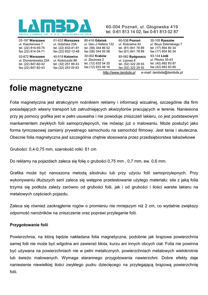 60-004 Poznań, ul. Głogowska 419 tel. 0-61 813 14 02, fax 0-61 813 02 87 03-197 Warszawa ul. Kasztanowa 7 tel. (22) 814-55-75 fax (22) 814-34-71 01-633 Warszawa ul. Gdańska 23A tel. (22) 832-41-81 fax (22) 832-12-48 02-672 Warszawa ul. Domaniewska 22A tel. (22) 847-82-42 fax (22) 847-82-43 40-519 Katowice ul. Kościuszki 88 tel. (32) 251 99 43 fax (32) 253 00 63 80-416 Gdańsk ul. Gen.J.Hallera 132 tel. (58) 344 86 52 fax (58) 344 00 58 30-002 Kraków ul. ZboŜowa 2 tel. (12) 633 54 25 fax (12) 633 49 16 60-538 Poznań ul. Kościelna 42 tel. (61) 841 78 89 fax (61) 841 78 89 85-062 Bydgoszcz ul. Lipowa 8 tel. (52) 322 29 55 fax (52) 322 29 55 http://www.lambda.pl 35-105 Rzeszów ul. Boya śeleńskiego 7 tel. (17) 854 80 34 fax (17) 854 80 34 93-134 Łódź ul. Płocka 35-43 tel. (42) 682 83 87 fax (42) 682 83 85 e-mail: [email protected] folie magnetyczne Folia magnetyczna jest atrakcyjnym nośnikiem reklamy i informacji wizualnej, szczególnie dla firm posiadających własny transport lub zatrudniających akwizytorów pracujących w terenie. Naniesiona przy jej pomocy grafika jest w pełni usuwalna i nie powoduje zniszczeń lakieru, co jest podstawowym mankamentem zwykłych folii samoprzylepnych, nie mówiąc juŜ o malowaniu. MoŜe posłuŜyć jako forma tymczasowej zamiany prywatnego samochodu na samochód firmowy. Jest tania i skuteczna. Obecnie folia magnetyczna jest szczególnie chętnie stosowana przez przedsiębiorstwa taksówkowe Grubości: 0,4-0,75 mm, szerokość rolki: 61 cm Do reklamy na pojazdach zaleca się folię o grubości 0,75 mm , 0,7 mm, ew. 0,6 mm. Grafika moŜe być nanoszona metodą sitodruku lub przy uŜyciu folii samoprzylepnych. Przy wykonywaniu dłuŜszych serii zaleca się wstępne przetestowanie uŜytego materiału; siła z jaką folia trzyma się podłoŜa zaleŜy zarówno od grubości folii, jak i od grubości i ilości warstw lakieru na metalowych częściach pojazdu. Zaleca się równieŜ zaokrąglenie rogów o promieniu nie mniejszym niŜ 2 cm, co wydatnie zwiększy odporność naroŜników na zniszczenie oraz poprawi przyleganie folii. Przygotowanie folii Powierzchnia, na którą będzie nakładana folia magnetyczna, podobnie jak brązowa powierzchnia samej folii nie moŜe być wilgotna ani zawierać błota, kurzu ani innych obcych ciał. Folia nie powinna być uŜywana na powierzchniach nie w pełni metalicznych, powierzchniach metalowych wielokrotnie lub świeŜo malowanych. Wymaga starannego przygotowania nawierzchni. Dobre efekty daje naniesienie niewielkiej ilości zwykłego pudru dziecięcego na przylegającą brązową powierzchnię folii. Nakładanie folii Przed nałoŜeniem naleŜy doprowadzić folię do temperatury pokojowej, co zapewni jej właściwą elastyczność. Mniejsze znaczenie ma temperatura powierzchni, na którą folia będzie nakładana. Folię nakładamy stopniowo dociskając kolejne fragmenty powierzchni. Przy przemieszczaniu naleŜy unikać rozciągnięcia, prowadzącego do osłabienia siły przylegania. Zamiast ciągnąć, folię naleŜy zdjąć w całym kawałku i nałoŜyć powtórnie w innym miejscu. Powierzchnia metalowa powinna być gładka, bez profili i przetłoczeń oraz chromowanych wykończeń. NaleŜy uwaŜać na fałdy, prowadzące do powstania kieszeni powietrznych. Konserwacja i czyszczenie Pomiędzy przylegającymi powierzchniami zbiera się wilgoć. Zalecamy, aby folię magnetyczną raz w tygodniu zdjąć i przetrzeć suchą ściereczką. Do czyszczenia prosimy uŜywać ciepłej wody z niewielką ilością mydła lub płynu do mycia naczyń. Przechowywanie Dla zabezpieczenia przed zniszczeniem w trakcie przechowywania zaleca się swobodne zrolowanie do średnicy nie mniejszej niŜ 10 cm z magnetyczną stroną od środka (umieszczenie grafiki do wewnątrz mogłoby doprowadzić do zmarszczenia folii samoprzylepnej lub złuszczenia farby). Folia zrolowana nie powinna być dociskana i załamywana. Przy przechowywaniu na płasko nie naleŜy umieszczać na rolce Ŝadnych przedmiotów.