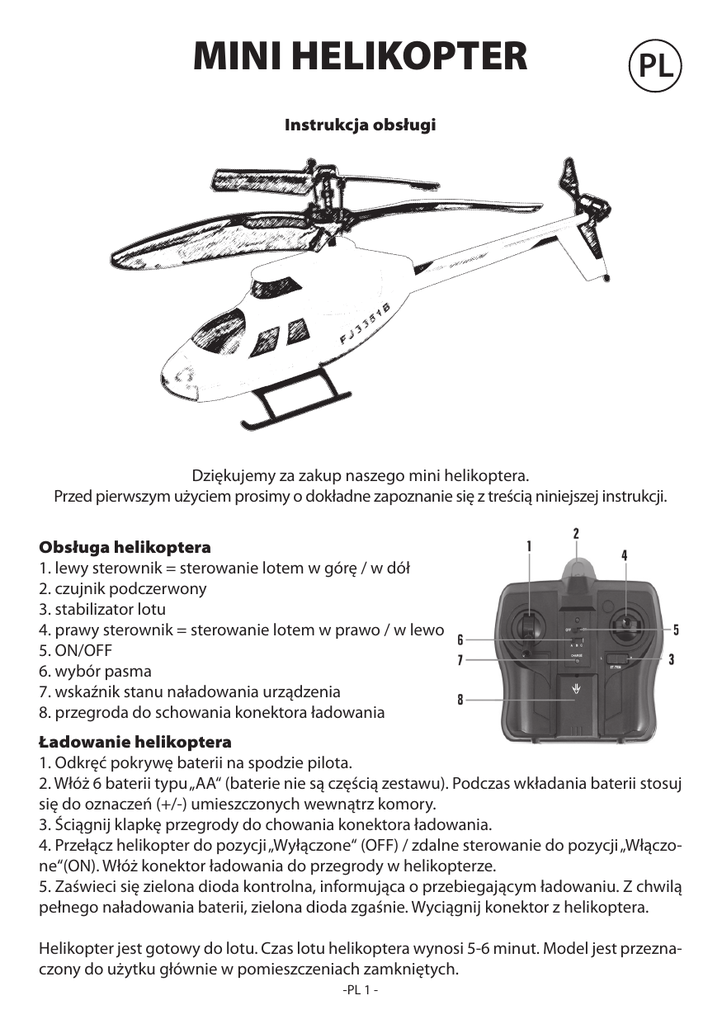 MINI HELIKOPTER PL Instrukcja obsługi Dziękujemy za zakup naszego mini helikoptera. Przed pierwszym użyciem prosimy o dokładne zapoznanie się z treścią niniejszej instrukcji. Obsługa helikoptera 1. lewy sterownik = sterowanie lotem w górę / w dół 2. czujnik podczerwony 3. stabilizator lotu 4. prawy sterownik = sterowanie lotem w prawo / w lewo 5. ON/OFF 6. wybór pasma 7. wskaźnik stanu naładowania urządzenia 8. przegroda do schowania konektora ładowania Ładowanie helikoptera 1. Odkręć pokrywę baterii na spodzie pilota. 2. Włóż 6 baterii typu „AA“ (baterie nie są częścią zestawu). Podczas wkładania baterii stosuj się do oznaczeń (+/-) umieszczonych wewnątrz komory. 3. Ściągnij klapkę przegrody do chowania konektora ładowania. 4. Przełącz helikopter do pozycji „Wyłączone“ (OFF) / zdalne sterowanie do pozycji „Włączone“(ON). Włóż konektor ładowania do przegrody w helikopterze. 5. Zaświeci się zielona dioda kontrolna, informująca o przebiegającym ładowaniu. Z chwilą pełnego naładowania baterii, zielona dioda zgaśnie. Wyciągnij konektor z helikoptera. Helikopter jest gotowy do lotu. Czas lotu helikoptera wynosi 5-6 minut. Model jest przeznaczony do użytku głównie w pomieszczeniach zamkniętych. -PL 1 - Uwaga: BATERIE Model jest zasilany litowo-polimerowymi bateriami wielokrotnego ładowania. Baterie podlegają tzw. naturalnemu zużywaniu się elementów podczas normalnej eksploatacji i nie są objęte gwarancją 24 miesięcy. Każdy cykl ładowania powoduje nieznaczne zmniejszenie pojemności baterii. Żywotność baterii wyrażona jest w ilości cykli ładowania (około 200). Po tej ilości cykli z baterii można nadal korzystać, jednak jej pojemność drastycznie spada. W praktyce żywotność baterii wynosi maksymalnie 2 lata niezależnie od tego czy jest ona używana czy nie. W skład zestawu wchodzi zapasowe tylne śmigło stabilizujące oraz samoprzylepne kształtki do wyważania. Uwaga: Ładowania i wymiany baterii może dokonywać wyłącznie osoba dorosła. Utylizacja i ochrona środowiska naturalnego: Informacje dotyczące utylizacji urządzeń elektrycznych i elektronicznych. Po upływie okresu żywotności urządzenia, bądź z chwilą, kiedy naprawa przestaje być opłacalna, urządzenia nie należy wyrzucać do śmieci. W celu właściwej utylizacji urządzenia należy oddać je do odpowiednich centrów recyklingu, gdzie zostaną przyjęte bez pobierania opłaty. Przestrzegając zasad prawidłowej utylizacji pomagacie Państwo zachować cenne zasoby przyrody i zapobiegacie potencjalnym negatywnym wpływom na środowisko naturalne i ludzkie zdrowie, jakie mogłaby mieć niewłaściwa likwidacja odpadów. W celu uzyskania dalszych informacji na temat metod likwidacji prosimy skontaktować się z miejscowym urzędem lub z najbliższym centrum recyklingu. Utylizacja niezgodna z przepisami może zostać ukarana grzywną zgodnie z przepisami obowiązującymi w danym kraju. Nie wyrzucaj zużytych baterii do kosza na śmieci! Zużyte baterie należy oddać do punktu surowców wtórnych. Producent zastrzega sobie prawo do zmian konstrukcyjnych poszczególnych podzespołów w związku z rozwojem produktu. Serwisowanie W przypadku stwierdzenia po zakupieniu urządzenia jakichkolwiek wad lub uszkodzeń należy skontaktować się z autoryzowanym punktem serwisowym. Obsługując urządzenie należy przestrzegać zaleceń zawartych w instrukcji obsługi. Gwarancja traci ważność w przypadku niewłaściwego lub niezgodnego z instrukcją użytkowania urządzenia lub w przypadku samowolnych przeróbek i zmian konstrukcyjnych. Uwaga: Zabawka nie jest przeznaczona dla dzieci poniżej 3-go roku życia. Zestaw zawiera małe części, których połknięcie może grozić udławieniem lub uduszeniem. Sugerowany wiek dziecka: +3. Dzieci mogą bawić się zabawką wyłącznie pod nadzorem osoby dorosłej. Dystrybucja: TV PRODUCTS Sp. z o. o. Import do UE: TV PRODUCTS CZ s. r. o. Kraj pochodzenia: Chiny -PL 2 -