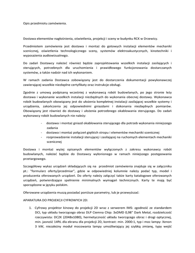 Opis przedmiotu zamówienia. Dostawa elementów nagłośnienia, oświetlenia, projekcji i sceny w budynku RCK w Drzewicy. Przedmiotem zamówienia jest dostawa i montaż do gotowych instalacji elementów mechaniki scenicznej, oświetlenia technologicznego sceny, systemów elektroakustycznych, kinotechniki i wyposażenia audiowizualnego. Do zadań Dostawcy należeć również będzie zaprojektowania wszelkich instalacji zasilających i sterujących, potrzebnych dla uruchomienia i prawidłowego funkcjonowania dostarczanych systemów, a także nadzór nad ich wykonaniem. W ramach zadania Dostawca zobowiązany jest do dostarczenia dokumentacji powykonawczej zawierającej wszelkie niezbędne certyfikaty oraz instrukcje obsługi. Zgodnie z umową podpisaną wcześniej z wykonawcą robót budowlanych, po jego stronie leży dostawa i wykonanie wszelkich instalacji niezbędnych do wykonania obecnej dostawy. Wykonawca robót budowlanych obowiązany jest do ułożenia kompletnej instalacji zasilającej wszelkie systemy i urządzenia, zakończenia jej odpowiednimi gniazdami i dokonania niezbędnych pomiarów. Obowiązany jest również do dostawy i ułożenia potrzebnego okablowania sterującego. Do zadań wykonawcy robót budowlanych nie należy: - dostawa i montaż gniazd okablowania sterującego dla potrzeb wykonania niniejszego zadania dostawa i montaż połączeń giętkich stropu i elementów mechaniki scenicznej rozprowadzenie instalacji sterującej i zasilającej na ruchomych elementach mechaniki scenicznej Dostawa i montaż wyżej opisanych elementów wyłączonych z zakresu wykonawcy robót budowlanych, należeć będzie do Dostawcy wyłonionego w ramach niniejszego postępowania przetargowego. Szczegółowy wykaz urządzeń składających się na przedmiot zamówienia znajduje się w załączniku pt.: "formularz oferty/przedmiar", gdzie w odpowiedniej kolumnie należy podać typ, model i producenta oferowanych urządzeń. Do oferty należy załączyć także karty katalogowe oferowanych urządzeń, potwierdzające spełnienie minimalnych wymagań technicznych. Karty te mają być sporządzone w języku polskim. Oferowane urządzenia muszą posiadać poniższe parametry, lub je przewyższać: APARATURA DO PROJEKCJI CYFROWYCH 2D: 1. Cyfrowy projektor kinowy do projekcji 2D wraz z serwerem IMS: zgodność ze standardem DCI, typ układu tworzącego obraz DLP Ciemna Chip: 3xDMD 0,98" Dark Metal, rozdzielczość rzeczywista: DC2K (2048x1080), hermetyczność układu tworzącego obraz i drogi optycznej, min. jasność 14ftL dla ekranu dla projekcji 2D, kontrast: min. 2000:1, typ i moc lampy: Xenon 3 kW, niezależny moduł mocowania lampy umożliwiający jej szybką zmianę, typy wejść wideo: 2 x DVI (wybór jako single-link lub dual-link), HDCP, modułowa konstrukcja projektora umożliwiająca szybki serwis, układ dwóch wbudowanych i jednocześnie pracujących prostowników zwiększający niezawodność pracy, układ automatyki i pamięci ustawień ostrości i wielkości ogniskowej obiektywu, możliwość zdalnej diagnostyki z komputera, modułu stałej jasności projektora w czasie (CLO), możliwość zastosowania modułu automatyki i regulacji lampy w osiach XYZ, możliwość zastosowania modułu automatyki ostrości i zmiennej ogniskowej, filtry powietrza wielokrotnego użycia, możliwość projekcji ze zwiększoną ilością klatek HFR, zintegrowany z projektorem Serwer Mediów (IMS), Odtwarzanie JPEG2000 2K & 4K DCI, wysoka prędkość wyświetlania 3D do 120 kl/s (60 kl/s na jedno oko), obsługa kodowania H.264, MPEG2, 2 wejścia 3G-SDI; 1 wejście HDMI 1.4a (BluRay 3D / 4K), 16 kanałów dźwiękowych AES/EBU (2x RJ45) 4x GPI, 6x GPO (2x RJ45), 2x ETH do zarządzania i ładowania treści, 3 porty USB z przodu do ładowania treści, 1 x port eSATA do szybkiego ładowania treści, pamięć RAID5 2Tb, oprogramowanie SMS (IMS), odtwarzacz programów/edytor/kreator listy odtwarzania, 2. Obiektyw zmotoryzowany umożliwiający uzyskanie obu formatów kinowych FLAT/SCOPE (1.85 i 2.39 3. Panel dotykowy sterujący funkcjami projektora kinowego, menu w jęz. Polskim 4. Podstawa uniwersalna do projektora z regulowanym kątem nachylenia 5. Lampa ksenonowa, moc 3000W, dla układu matrycy 0.98'' 6. Alternatywny procesor obrazu z selektorem,. Typy wejść: 1 x Composite Video, 1 x S-Video, 2 x uniwersalne RGB (RGBHV, Component), 2 x DVI-I z dekodowaniem HDCP, 1 x SDI/HD-SDI. Typ wyjścia; Dual Link DVI-I (2xDVI) z kodowaniem HDCP lub bez kodowania gdy projektor jest kompatybilny z HDCP. Przetwarzanie: 12 bit na kolor (RGB). Dynamiczna zmiana rozmiarów obrazu. Sterowanie z panela wewnętrznego. SYSTEM NAGŁOŚNIENIA KINOWEGO DOLBY: 1. cyfrowy procesor dźwięku kinowego do projekcji cyfrowych, odtwarzanie dźwięku w formatach : Nonsync, Dolby Pro Logic II, Dolby Digital, Dolby EX, Dolby Surround 7.1. 2. kinowy wzmacniacz mocy z wbudowanym procesorem dla głośników zaekranowych ( Lewy, Centralny, Prawy). Procesor zawiera zwrotnice, graficzny EQ, limiter, linie opóźniające. Moc: 2x1000W/2, 2x800W/4, br.1x2000W/4, 1x1600W/8, zakres odtwarzanych częstotliwości: 20Hz-20kHz, zniekształcenia harmoniczne 0,5%-1%, stosunek sygnał/szum: > 100dB 3. kinowy wzmacniacz mocy z wbudowanym procesorem dla głośników Lewy Surround i Prawy Surround. Procesor zawiera zwrotnice, graficzny EQ, limiter, linie opóźniające. Moc: 2x1000W/2, 2x800W/4, br.1x2000W/4, 1x1600W/8, zakres odtwarzanych częstotliwości: 20Hz-20kHz, zniekształcenia harmoniczne 0,5%-1%, stosunek sygnał/szum: > 100dB 4. kinowy wzmacniacz mocy z wbudowanym procesorem dla głośników Lewy Tylny Surround i Prawy Tylny Surround. Procesor zawiera zwrotnice, graficzny EQ, limiter, linie opóźniające. Moc: 2x1000W/2, 2x800W/4, br.1x2000W/4, 1x1600W/8, zakres odtwarzanych częstotliwości: 20Hz-20kHz, zniekształcenia harmoniczne 0,5%-1%, stosunek sygnał/szum: > 100dB 5. kinowy wzmacniacz mocy z wbudowanym procesorem dla głośnika superbasow