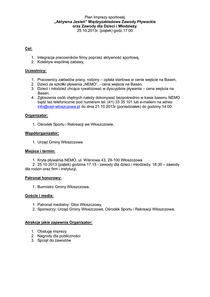 Plan Imprezy sportowej „Aktywna Jesień” Międzyzakładowe Zawody Pływackie oraz Zawody dla Dzieci i Młodzieży. 25.10.2013r. (piątek) godz.17:00 Cel: 1. Integracja pracowników firmy poprzez aktywność sportową, 2. Kolektyw wspólnej zabawy, Uczestnicy: 1. Pracownicy zakładów pracy, rodziny – opłata startowa w cenie wejście na Basen, 2. Dzieci ze szkółki pływania „NEMO”, - cena wejścia na Basen, 3. Dzieci i młodzież chcąca rywalizować w dyscyplinie pływania – cena wejścia na Basen, 4. Zgłoszenia osób chętnych należy dokonywać bezpośrednio w kasie basenu NEMO bądź też telefonicznie pod numerem tel. (41) 33 35 101 lub e-mailem na adres: [email protected] do dnia 21.10.2013r (poniedziałek) do godziny 14:00. Organizator: 1. Ośrodek Sportu i Rekreacji we Włoszczowie, Współorganizator: 1. Urząd Gminy Włoszczowa Miejsce i termin: 1. Kryta pływalnia NEMO, ul. Wiśniowa 43, 29-100 Włoszczowa 2. 25.10.2013 (piątek) godzina 17:15 - zawody dla dzieci i młodzieży, 18:30 – zawody dla rodzin oraz firm i instytucji, Patronat honorowy: 1. Burmistrz Gminy Włoszczowa, Goście i media: 1. Patronat medialny: Głos Włoszczowy, 2. Sponsorzy: Urząd Gminy Włoszczowa, Ośrodek Sportu i Rekreacji Włoszczowa, Atrakcje jakie zapewnia Organizator: 1. Obsługę imprezy. 2. Nagrody dla publiczności 3. Sprzęt do zawodów Harmonogram zawodów indywidualnych dla dzieci – godz. 17:15 Kategoria 7 lat 25m stylem grzbietowym 25m stylem dowolny Kategoria 8-9 lat 25m stylem grzbietowym 25m stylem dowolny Kategoria 10-11 lat 25m stylem grzbietowym 25m stylem dowolnym 25m stylem klasycznym Kategoria 12+ 50m stylem grzbietowym 50m stylem dowolnym 50m stylem klasycznym Harmonogram zawodów indywidualnych dla dorosłych – godz. 18:30 50m stylem grzbietowym 50m stylem klasycznym 50m stylem dowolnym 4x25m stylem dowolnym firmy i instytucje Nagrody w konkursach: 1. Nagrody: Statuetki dla najlepszych Postanowienia końcowe: Szczegółowych informacji na temat imprezy udziela: o Obsługa klienta – kasa basenu NEMO Tel: 41 33 35 101, e-mail:[email protected] lub e-mail: [email protected] ; Udział w imprezie sportowej: ‘’Aktywna Jesień” – zawody pływackie jest jednocześnie wyrażeniem zgody na wykorzystywanie zdjęć z wizerunkiem uczestników imprezy (zarówno zawodników, jak i kibiców) w cekach informacyjnych i reklamowych prowadzonych przez OSiR Włoszczowa. Serdecznie zapraszamy Wszystkich do wspólnej zabawy !!!