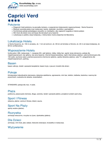 EccoHoliday Sp. z o.o. www.eccoholiday.com Caprici Verd Położenie Elegancki hotel położony na początku bulwaru, w popularnej miejscowości wypoczynkowej - Santa Susanna Bliskość szerokiej plaży oraz restauracji, barów, dyskotek i punktów z pamiątkami Komfortowe pokoje posiadające wszystko co niezbędne, aby zapewnić wygodę w trakcie pobytu Mini klub dla dzieci oraz animacje dla dorosłych przy basenie Lokalizacja w pobliżu stacji kolejowej, z której łatwo można dojechać do Barcelony Lokalizacja Hotelu w Santa Susanna, ok. 150 m od plaży, ok. 1 km od centrum, ok. 35 km od lotniska w Gironie, ok. 20 m od stacji kolejowej, ok. 60 km od Barcelony. Wyposażenie Hotelu liczba pokoi: 266, restauracje: 1, recepcja 24h, sejf (płatny), lobby, lobby bar, ogród, taras słoneczny, pokoje dla niepełnosprawnych, bar główny, bar przy basenie, internet bezprzewodowy, kącik internetowy (płatny), sala konferencyjna dla 150 osób, wymiana walut, pralnia/czyszczenie chemiczne (płatne), opieka lekarska (płatna), sala TV, udogodnienia dla niepełnosprawnych, parking. Basen basen odkryty, leżaki i parasole bezpłatnie; basen kryty z jacuzzi; brodzik dla dzieci. Pokoje klimatyzacja indywidualnie sterowana, telewizja satelitarna, ogrzewanie, mini bar, telefon, lodówka, łazienka z wanną lub prysznicem, suszarka do włosów, taras/balkon. STANDARD: pokoje dla max. 4 osób. Plaża publiczna, piaszczysto-żwirowa, długa, szeroka, leżaki i parasole płatne, przejście tunelem pod ulicą. Sport I Fitness siłownia, płatne: centrum fitness, bilard, sauna. Sport Na Plaży sporty wodne (płatne). Rozrywka animacje wieczorne, muzyka na żywo, dyskoteka (płatna). Dla Dzieci animacje, mini klub, plac zabaw, łóżeczko dziecięce, krzesełka w restauracji. Wyżywienie 1/3 EccoHoliday Sp. z o.o. www.eccoholiday.com śniadania i obiadokolacje w formie bufetu, możliwość dopłaty do pakietu All Inclusive. 2/3 EccoHoliday Sp. z o.o. www.eccoholiday.com All Inclusive Zawiera śniadanie, lunch i kolacja w formie bufetu w restauracji głównej; przekąski w ciągu dnia w wybranych barach; lokalne alkohole i napoje bezalkoholowe serwowane w godzinach od 10.30 do 23.00. Informacje Dodatkowe Hotel wybudowany w 2002 roku. Oferta: Wylot 01.01.1970 Powrót 01.01.1970 godz. godz. Zakwaterowanie -() Dni dni Cena os. dorosła 3/3 Powered by TCPDF (www.tcpdf.org)