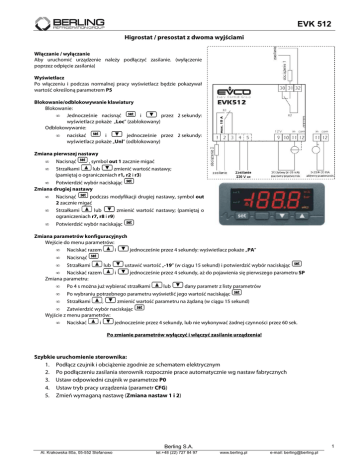 EVK 512 Higrostat / presostat z dwoma wyjściami Włączanie / wyłączanie Aby uruchomić urządzenie należy podłączyć zasilanie. (wyłączenie poprzez odpięcie zasilania) Wyświetlacz Po włączeniu i podczas normalnej pracy wyświetlacz będzie pokazywał wartość określoną parametrem P5 Blokowanie/odblokowywanie klawiatury Blokowanie: • Jednocześnie nacisnąć i przez 2 sekundy: wyświetlacz pokaże „Loc” (zablokowany) Odblokowywanie: • i jednocześnie przez 2 sekundy: naciskać wyświetlacz pokaże „Unl” (odblokowany) Zmiana pierwszej nastawy • Nacisnąć • Strzałkami lub zmienić wartość nastawy; (pamiętaj o ograniczeniach r1, r2 i r3) , symbol out 1 zacznie migać • Potwierdzić wybór naciskając Zmiana drugiej nastawy • Nacisnąć podczas modyfikacji drugiej nastawy, symbol out 2 zacznie migać • Strzałkami lub zmienić wartość nastawy; (pamiętaj o ograniczeniach r7, r8 i r9) • Potwierdzić wybór naciskając Zmiana parametrów konfiguracyjnych Wejście do menu parametrów: • Naciskać razem i jednocześnie przez 4 sekundy: wyświetlacz pokaże „PA” • Nacisnąć • Strzałkami lub • Naciskać razem Zmiana parametru: ustawić wartość „-19” (w ciągu 15 sekund) i potwierdzić wybór naciskając i jednocześnie przez 4 sekundy, aż do pojawienia się pierwszego parametru SP • Po 4 s można już wybierać strzałkami • • Po wybraniu potrzebnego parametru wyświetlić jego wartość naciskając Strzałkami , zmienić wartość parametru na żądaną (w ciągu 15 sekund) lub dany parametr z listy parametrów • Zatwierdzić wybór naciskając Wyjście z menu parametrów: • Naciskać i jednocześnie przez 4 sekundy, lub nie wykonywać żadnej czynności przez 60 sek. Po zmianie parametrów wyłączyć i włączyć zasilanie urządzenia! Szybkie uruchomienie sterownika: 1. Podłącz czujnik i obciążenie zgodnie ze schematem elektrycznym 2. Po podłączeniu zasilania sterownik rozpocznie prace automatycznie wg nastaw fabrycznych 3. Ustaw odpowiedni czujnik w parametrze P0 4. Ustaw tryb pracy urządzenia (parametr CFG) 5. Zmień wymaganą nastawę (Zmiana nastaw 1 i 2) 1 Berling S.A. Al. Krakowska 80a, 05-552 Stefanowo tel.+48 (22) 727 84 97 www.berling.pl e-mail: [email protected] EVK 512 DIODA LED Out 1 Out 2 AL1 AL2 Pr1 ZNACZENIE Świeci: stycznik jest zwarty, doprowadzenie prądu do urządzenia 1 (obciążenia 1) Miga: • uruchomiona jest zmiana nastawy 1 • aktywne opóźnienie załączenia obciążenia 1 parametr C1 i C2 Świeci: stycznik jest zwarty, doprowadzenie prądu do urządzenia 2 (obciążenia 2) Miga: • uruchomiona jest zmiana nastawy 2 • aktywne opóźnienie załączenia obciążenia 2 parametr C7 i C8 gdy jest wyświetlane: aktywny alarm Alarm ciśnienia/wilgotności 1 • sprawdzić czujnik ciśnienia/wilgotności pomieszczenia • patrz parametry A1 i A3 Alarm ciśnienia/wilgotności 2 • sprawdzić czujnik ciśnienia/wilgotności pomieszczenia • patrz parametry A5 i A7 Błąd czujnika ciśnienia/wilgotności • sprawdzić parametr P0 • sprawdzić rodzaj czujnika • sprawdzić podłączenie czujnika do sterowania i przewody • sprawdzić ciśnienie/wilgotność pomieszczenia Działanie: • działanie obciążenia 1 zależy od parametru C6 • działanie obciążenia 2 zależy od parametru C10 Kiedy przyczyna alarmu znika, alarm milknie, a urządzenie powraca do normalnej pracy. Pierwsza nastawa niezależna, druga nastawa jest zależna od pierwszej (CFG = 1) Drugą zadaną wartość roboczą można ustawić wyłącznie przy pomocy parametru SP2 (ponieważ zależy od pierwszej). Każde obciążenie można ustawić na tryb proporcjonalny (parametry r5 oraz r10 = 0) lub na tryb odwrotnie proporcjonalny (parametry r5 oraz r10 = 1). W pokazanym przykładzie, obciążenie 1 pracuje w trybie proporcjonalnym, obciążenie 2 pracuje w trybie odwrotnie proporcjonalnym, a druga nastawa ma wartość ujemną. Dwie niezależne nastawy (CFG = 2) Każde obciążenie pracuje w trybie proporcjonalnym (parametry r5 oraz r10 = 0) lub odwrotnie proporcjonalnym (parametry r5 oraz r10 = 1). W pokazanym przykładzie obciążenie 1 pracuje w trybie proporcjonalnym, natomiast obciążenie 2 pracuje w trybie odwrotnie proporcjonalnym. Strefa neutralna (CFG = 3) Dwa kroki (CFG = 4) Druga nastawa nie jest dostępna, a parametry SP2, r5, r7, r8, r9 oraz r10 Druga nastawa temperatury jest niedostępna, a parametry SP2, r0, r6, nie będą brane pod uwagę przez sterownik. Obciążenie 1 zawsze pracuje w trybie proporcjonalnym a obciążenie 2 zawsze pracuje w trybie odwrotnie proporcjonalnym. r7, r8, r9 oraz r10 nie będą brane pod uwagę przez sterownik. Każde obciążenie może pracować w trybie proporcjonalnym (parametr r5 = 0) lub odwrotnie proporcjonalnym (parametr r5=1); parametr r5 ustawia pracę dla każdego obciążenia. W pokazanym przykładzie, każde z obciążeń pracuje w trybie proporcjonalnym. 2 Berling S.A. Al. Krakowska 80a, 05-552 Stefanowo tel.+48 (22) 727 84 97 www.berling.pl e-mail: [email protected] EVK 512 PAR. MIN. MAKS. TABELA PARAMETRÓW r1 r2 SP1 r7 r8 SP2 WEJŚCIE POMIAROWE CA1 -25 25 P0 0 1 P1 0 1 P2 0 1 P3 -199 199 -199 199 P4 JEDN. FABR. %/bar %/bar 0.0 0.0 %/bar pkt. pkt. 0.0 0 1 0 0.0 100.0 P5 0 1 - 0 P7 0 1 - 0 OPIS Pierwsza nastawa Druga nastawa Kalibracja czujnika komory Rodzaj czujnika: 0 = 4-20 mA; 1 = 0-20 mA Wyświetlanie dziesiętnych: 0 = NIE; 1 = TAK Jednostka wyświetlana: 0 = % r.H.; 1 =bar; 2 =brak jednostki Wartość minimalna mierzona przez przetwornik Wartość maksymalna mierzona przez przetwornik Wartość na wyświetlaczu: 0 = mierzone ciśnienie/wilgotność 1 = pierwsza nastawa Blokada wyświetlanej wilgotności/ciśnienia (tylko gdy P5=0) 0 = nie 1 = tak – jeżeli P3 < P4, to przedział pokazywanej wartości będzie się mieścił od P3 do P4 (wartość ta miga wówczas na ekranie) – jeżeli P3 > P4 to przedział pokazywanej wartości będzie się mieścił