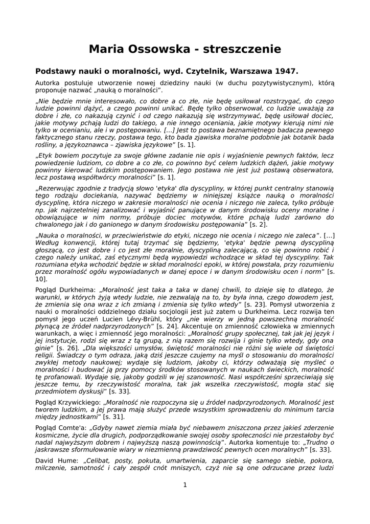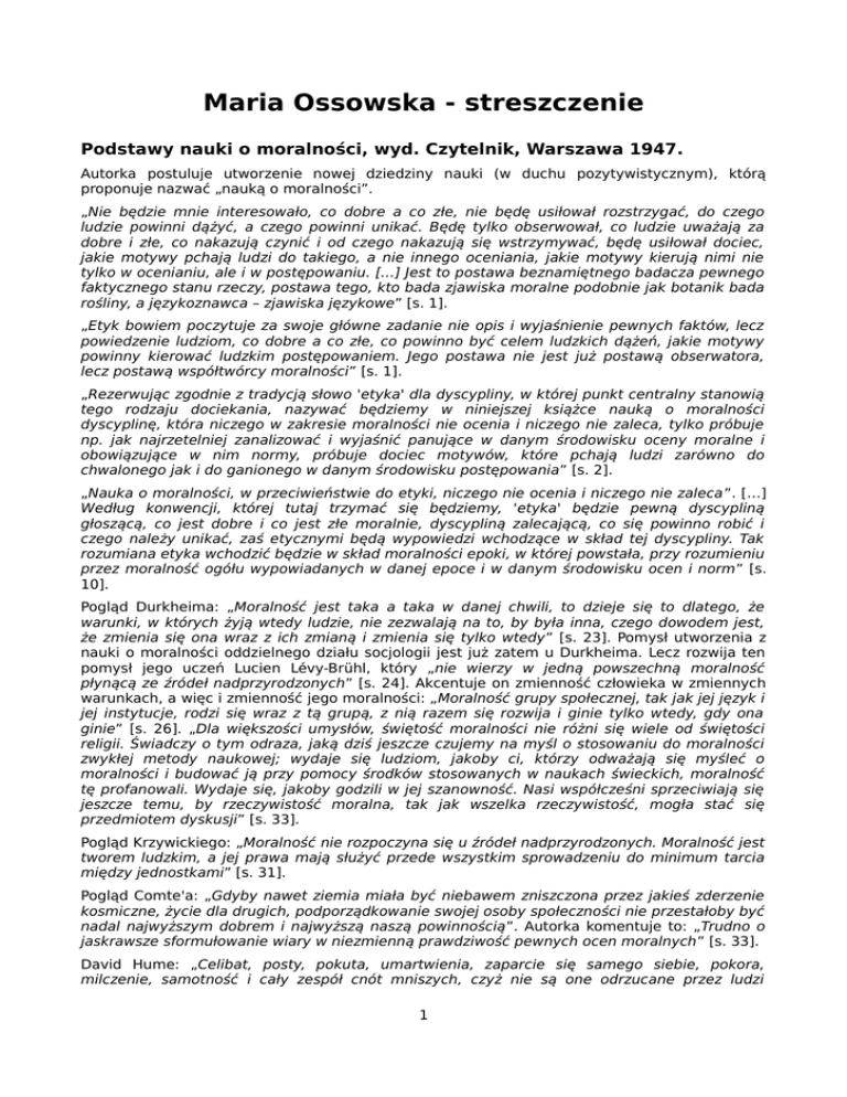 Maria Ossowska - streszczenie Podstawy nauki o moralności, wyd. Czytelnik, Warszawa 1947. Autorka postuluje utworzenie nowej dziedziny nauki (w duchu pozytywistycznym), którą proponuje nazwać „nauką o moralności”. „Nie będzie mnie interesowało, co dobre a co złe, nie będę usiłował rozstrzygać, do czego ludzie powinni dążyć, a czego powinni unikać. Będę tylko obserwował, co ludzie uważają za dobre i złe, co nakazują czynić i od czego nakazują się wstrzymywać, będę usiłował dociec, jakie motywy pchają ludzi do takiego, a nie innego oceniania, jakie motywy kierują nimi nie tylko w ocenianiu, ale i w postępowaniu. […] Jest to postawa beznamiętnego badacza pewnego faktycznego stanu rzeczy, postawa tego, kto bada zjawiska moralne podobnie jak botanik bada rośliny, a językoznawca – zjawiska językowe” [s. 1]. „Etyk bowiem poczytuje za swoje główne zadanie nie opis i wyjaśnienie pewnych faktów, lecz powiedzenie ludziom, co dobre a co złe, co powinno być celem ludzkich dążeń, jakie motywy powinny kierować ludzkim postępowaniem. Jego postawa nie jest już postawą obserwatora, lecz postawą współtwórcy moralności” [s. 1]. „Rezerwując zgodnie z tradycją słowo 'etyka' dla dyscypliny, w której punkt centralny stanowią tego rodzaju dociekania, nazywać będziemy w niniejszej książce nauką o moralności dyscyplinę, która niczego w zakresie moralności nie ocenia i niczego nie zaleca, tylko próbuje np. jak najrzetelniej zanalizować i wyjaśnić panujące w danym środowisku oceny moralne i obowiązujące w nim normy, próbuje dociec motywów, które pchają ludzi zarówno do chwalonego jak i do ganionego w danym środowisku postępowania” [s. 2]. „Nauka o moralności, w przeciwieństwie do etyki, niczego nie ocenia i niczego nie zaleca”. […] Według konwencji, której tutaj trzymać się będziemy, 'etyka' będzie pewną dyscypliną głoszącą, co jest dobre i co jest złe moralnie, dyscypliną zalecającą, co się powinno robić i czego należy unikać, zaś etycznymi będą wypowiedzi wchodzące w skład tej dyscypliny. Tak rozumiana etyka wchodzić będzie w skład moralności epoki, w której powstała, przy rozumieniu przez moralność ogółu wypowiadanych w danej epoce i w danym środowisku ocen i norm” [s. 10]. Pogląd Durkheima: „Moralność jest taka a taka w danej chwili, to dzieje się to dlatego, że warunki, w których żyją wtedy ludzie, nie zezwalają na to, by była inna, czego dowodem jest, że zmienia się ona wraz z ich zmianą i zmienia się tylko wtedy” [s. 23]. Pomysł utworzenia z nauki o moralności oddzielnego działu socjologii jest już zatem u Durkheima. Lecz rozwija ten pomysł jego uczeń Lucien Lévy-Brühl, który „nie wierzy w jedną powszechną moralność płynącą ze źródeł nadprzyrodzonych” [s. 24]. Akcentuje on zmienność człowieka w zmiennych warunkach, a więc i zmienność jego moralności: „Moralność grupy społecznej, tak jak jej język i jej instytucje, rodzi się wraz z tą grupą, z nią razem się rozwija i ginie tylko wtedy, gdy ona ginie” [s. 26]. „Dla większości umysłów, świętość moralności nie różni się wiele od świętości religii. Świadczy o tym odraza, jaką dziś jeszcze czujemy na myśl o stosowaniu do moralności zwykłej metody naukowej; wydaje się ludziom, jakoby ci, którzy odważają się myśleć o moralności i budować ją przy pomocy środków stosowanych w naukach świeckich, moralność tę profanowali. Wydaje się, jakoby godzili w jej szanowność. Nasi współcześni sprzeciwiają się jeszcze temu, by rzeczywistość moralna, tak jak wszelka rzeczywistość, mogła stać się przedmiotem dyskusji” [s. 33]. Pogląd Krzywickiego: „Moralność nie rozpoczyna się u źródeł nadprzyrodzonych. Moralność jest tworem ludzkim, a jej prawa mają służyć przede wszystkim sprowadzeniu do minimum tarcia między jednostkami” [s. 31]. Pogląd Comte'a: „Gdyby nawet ziemia miała być niebawem zniszczona przez jakieś zderzenie kosmiczne, życie dla drugich, podporządkowanie swojej osoby społeczności nie przestałoby być nadal najwyższym dobrem i najwyższą naszą powinnością”. Autorka komentuje to: „Trudno o jaskrawsze sformułowanie wiary w niezmienną prawdziwość pewnych ocen moralnych” [s. 33]. David Hume: „Celibat, posty, pokuta, umartwienia, zaparcie się samego siebie, pokora, milczenie, samotność i cały zespół cnót mniszych, czyż nie są one odrzucane przez ludzi 1 rozsądnych dlatego, że do niczego nie służą, nie przyczyniają się do ludzkiego szczęścia na świecie, nie czynią człowieka lepszym członkiem społeczeństwa, nie podnoszą jego walorów towarzyskich, ani jego umiejętności cieszenia się życiem” [s. 222]. John Dewey: „Jeżeli idzie o względy praktyczne, moralność to tyle co obyczaj, przyjęte sposoby postępowania, ustalone zbiorowe zwyczaje. […] Teoretyk moralności podlega na ogół złudzeniu, że jego własna sytuacja jest, czy powinna być wyjątkowa” [s. 259]. Frank Chapman Sharp: Każda ocena jakiegoś postępowania bez względu na konsekwencje jest oceną estetyczną. [s. 286] Bertrand Russell: „Państwo z bezstronną surowością karze zarówno tych, którzy zabijają swych współobywateli, jak i tych, którzy nie chcą zabijać cudzoziemców” [s. 361]. Ossowska: „Nasza reakcja wyznacza ocenę. […] Ale także nasza ocena będzie wyznaczała naszą reakcję. […] Tak tedy teza: oceniamy P dodatnio, bo go pragniemy, może być prawdziwa jako teza charakteryzująca genezę ocen, zaś teza: pragniemy P, bo go oceniamy dodatnio – jako teza stwierdzająca zależność naszych pragnień od własnych czy cudzych ocen już ukutych” [s. 60]. Jeden z problemów etycznych: „Czy przedmioty są dobre dlatego, że przeżywamy w stosunku do nich pewne doznania, czy też przeżywamy w stosunku do nich pewne doznania dlatego, że