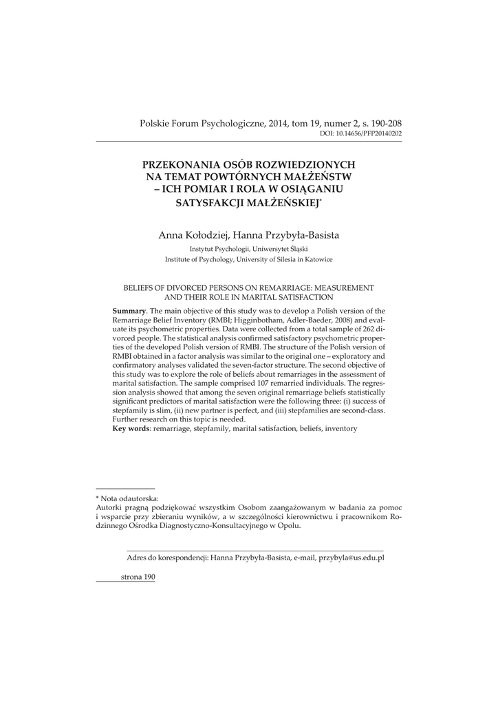 Polskie Forum Psychologiczne, 2014, tom 19, numer 2, s. 190-208 DOI: 10.14656/PFP20140202 ȱXȱ ȱ ȱȱX ȱR Sȱ Ȯȱ ȱȱȱȱȱ&ȱ ȱR S* ȱÙ£ǰȱ ȱ£¢¢ÙȬ ¢ȱ¢ǰȱ ¢ȱg Institute of Psychology, University of Silesia in Katowice BELIEFS OF DIVORCED PERSONS ON REMARRIAGE: MEASUREMENT AND THEIR ROLE IN MARITAL SATISFACTION ¢. The main objective of this study was to develop a Polish version of the Remarriage Belief Inventory (RMBI; Higginbotham, Adler-Baeder, 2008) and evaluate its psychometric properties. Data were collected from a total sample of 262 diȱǯȱȱȱ¢ȱęȱ¢ȱ¢ȱties of the developed Polish version of RMBI. The structure of the Polish version of ȱȱȱȱȱ¢ȱ ȱȱȱȱȱȱȮȱ¡¢ȱȱ ę¢ȱ¢ȱȱȱȬȱǯȱȱȱȱȱ this study was to explore the role of beliefs about remarriages in the assessment of marital satisfaction. The sample comprised 107 remarried individuals. The regression analysis showed that among the seven original remarriage beliefs statistically ęȱȱȱȱȱ ȱȱ ȱDZȱǻǼȱȱȱ stepfamily is slim, (ii) new partner is perfect, and (iii) stepfamilies are second-class. Further research on this topic is needed. ¢ȱ : remarriage, stepfamily, marital satisfaction, beliefs, inventory * Nota odautorska: ȱ ȱ £¿ °ȱ £¢ȱ ȱ £Č ¢ȱ ȱ ȱ £ȱ ȱ ȱ ȱ £¢ȱ £ȱ ¢à ǰȱ ȱ ȱ ££àïȱ ȱ ȱ ȱ £ȱïȱ¢£Ȭ¢ȱ ȱǯ ȱȱDZȱ ȱ£¢¢ÙȬǰȱȬǰȱ£¢¢ȓǯǯ strona 190 £ ȱ¢ȱ¢¢£¢ȱ ¢ǰȱČȱȱ£ £ȱ¿ȱ ¢ČȱŜŖȱ¢¿¢ȱ àȱ£ǰȱȱȱśŖȱ¢¿¢ȱ£ȱï £ȱ£ ȱ ȱ£à ǯȱ£ïȱȱŚŖȱ¢¿¢ȱàȱ£ ȱ àȱÙČÚ ǰȱ ȱà¢ȱȱ£ȱ àÙÙČà ȱȱ£ ȱǻÙ¢ȱ£ȱ¢¢£¢ȱ, 2013). Z koȱ£ȱ£ £à ȱ¢¢ǰȱ ȱà¢ȱČ¢ȱ¢ȱȱ£ £ȱǻà Čȱ ȱ £Ǽǰȱ ȱ ȱ Ùȱ £ǯȱ ȱ £¢£¢°ȱ ȱ ¢¢£ȱ £ȱ £ȱ à ȱ £¢ǰȱ £ȱ £ȱ à¢ȱ £ ¢ȱ ¢ȱ řśȬŚŖƖȱ £¢ȱ ÙČÚ ȱ ȱ Čȱ ŜśȬŝŖƖȱ ÙČÚ ȱ à¢ȱ ǻ¢ǰȱ ¢ǰȱ ŘŖŖśǰȱ £DZȱ ¢ǰȱ ǰȱ ŘŖŖŝǼǯȱ £¢ȱ ȱ ȱ £ǰȱ Čȱ £ȱ àȱ £ £¢ȱ ȱ ȱ ¢ȱ Čǰȱ Čȱ ï¢ȱ Ùȱ ££°ȱ ¢ȱ £¢£ȱ ȱ £ȱ Ù¢ȱȱ £ȱ ȱ £ £ȱ£ȱ¢ę¿ȱà ȱ £¢£¢ȱ ȱ£Ùȱ£¢ǯȱ ȱ ȱ ¢£ȱ £¢ȱ ¢Ùȱ ȱ ȱ ȱ £¢Čȱ ¢ȱ £ȱ ȱ àȱ £ £ȱ ÙČÚǯȱ ȱ £¿ïȱ ¢£ȱ ȱ ȱ ȱ £ǰȱ ȱ ȱ £¿ȱ £ȱ ȱ ȱ £Úȱ ȱ ȱ à¢ȱ ÙČÚ ȱ £ȱ £ȱ £ȱ ȱ ¢ǰȱ £¢ȱ ȱ£ȱȱ££¢ȱ Ù¢ ȱȱ¿ȱïȱ ȱ £ £ȱÙČÚǯ àȱ £ȱ Ùȱ ȱ £ £ȱ ȱ £ £ȱ ȱ ȱ£¢ȱ Čȱ¿ȱ£ȱ£ïȱ ¢Ùȱ£¢ȱȱ£Úȱȱ£ ȱ £à ȱ £¿¢ȱ ȱ ££ ¢¿Čȱ ¢£¢ȱ ǻ¢ǰȱ ǰȱ ŘŖŖśDzȱǰȱǰȱǰȱŘŖŖŜǼǯȱ£ȱ£ ȱȱ££¢°ȱ¿ȱ £ȱ¢ǰȱ¢ ¢ȱǰȱ£ȱȱȱȱȱ£¢ȱ£Ù ȱ £ȱ ¢ȱ ǻǰȱ ǰȱ ¢ǰȱ ŘŖŖřǼǯȱ ïàȱ Č£¢ȱ £Úȱ £¿¢ȱȱ ¢ £ȱČïȱ£¢ȱ£ ȱ ¢ȱ¿ȱ m.in.: radzenie sobie ze stratami i zmianami, ustalenie nowych tradycji i zasad, bu ȱ Ùȱ ¿£ȱȱ£¢ȱ£¢ȱȱȱȱ£ȱ£°ǰȱ utrzymywanie relacji rodzicielskiej zarówno z biologicznym, jak i przybranym ro£ǰȱȱ £¢ȱ£ȱ ȱ£ȱ£¢ǰȱ¢£ï°ȱȱ (por. np. Goldenberg, Goldenberg, 2006; Lewandowska-Walter, 2009). Rodzina zrekonstruowana nie jest taka sama jak rodzina nuklearna, ma zde¢ ȱȱ¢¿ȱ£ ǰȱȱ£ȱ à¢ȱÙČÚ ȱȱ ȱ ¢£ Úǯȱ¢ȱ£ȱ £¢ȱ ¢£ ÚȱȱǮ£ ȱ£ȱȱ££ÙïȄȱ ȱ£Ú£ȱ£ȱ£ £ȱǻ¢ǰȱǰȱŘŖŖŝǼǯȱČȱȱ£ £ȱ£ȱ ȱĚȱ£ȱȬÙČǰȱȱČȱ¢£¢ȱ£ ȱ ȱ£ £ȱ££ȱ ȱ¢ ȱ£ȱ¢Ù¢ȱȱǻǯȱȱǰȱ ¢ǰȱ £ǰȱ ¢ȱ £ȱ Ǽǯȱ ¢ȱ ¢£ ȱ ȱ àȱ ÙČÚ ȱ ȱ ¿ȱ ¢¿ȱ à ȱ £ȱ £ȱ ÙČÚ ȱ ȱ ǰȱ ¢ȱ °ȱ £ȱ ¢ȱ ȱ ǯȱ Čȱ ȱ ǰȱ ¢ȱ ȱ à¢ȱÙČÚ ȱȱ°ȱà Úȱ£ȱ £¢ȱ£ £ǰȱȱ°ȱ¿ȱ °ȱǰȱȱȱ¢£ȱ ¿£ȱÙČÚǰȱÙȱ£ȱȱ£ǰȱ oparte na realnych podstawach (McCarthy, Ginsberg, 2007). strona 191 ïȱ ȱ àȱ ÙČÚ ȱ ££ȱ ȱ £ȱ rodziny, która £ȱ¿ȱ ȱȱ£ï ¢ȱǻtransitionǼǰȱȱ ȱ Ùȱ£ȱ £ȱ£ȱǮȄȱȱ Ù£ȱ ¢ȱ£ȱȱȱ£¢ȱ£ ǯȱȱȱ£ȱ£ȱȱȱČȱ£Ùȱ£¢ȱ ¢ȱ£¢ ȱ ¿ȱ ȱ ȱ ¢ȱ ǻǰȱ ǰȱ ¢ǰȱ ŘŖŖřǼǯȱ ȱ ǻŗşşřǰȱ £DZȱ ǰȱ ǰȱ ¢ǰȱ ŘŖŖřǼȱ ¢àČÙȱ ȱ ¢ǰȱ £ ¢ȱ à ȱ££¢ȱ ȱȱȱǻ£¿ǰȱ££ȱ¿ǰȱï ï°ǰȱ £¿ǰȱ£Ùǰȱȱȱ£ £Ǽǯȱȱȱ £ȱ¢ȱ£ȱ ȱ£ȱ£ ȱČ¢ȱ°ȱ¿ȱȱȱȱȱǻŗşŞŜǰȱ£DZȱ ǰȱŘŖŖŝǼǯȱà Čȱȱȱ¢ȱ£ȱ ȱ£ȱ£ ȱ££¢ȱ¿ȱȱ£ ȱȱ£ ȱ£ȱǻfantasyǼǯȱȱȱ£ȱÙČ ȱȱ ȱ£ȱȱ£ȱ£ǰȱČȱČȱ£ȱȱ¿£ȱ £ǯȱÙČ ȱ£¿ȱȱ£ǰȱČȱȱ£Ùȱ¿ȱȱ££¢ǯȱȱ ¢Čȱ£ ǰȱČȱ£ȱ£ ȱ¿£ȱȱ ȱ££¿ï ȱ £ǯȱ ȱ ȱ Úȱ ȱ ï ǰȱ ȱ £ȱ ȱ ȱ ȱ £ȱ £ȱ ȱ Čȱ ¢°ȱ Čȱ ȱ ȱ ȱ ȱ ǰȱ ¢ȱ £°ȱ ȱ ¢ȱ £ £ǰȱ ȱ ȱ £ȱ à Čȱ ȱ ȱ ǰȱ ¢ȱ £¢ȱ ï°ȱ ȱ ¢ȱ ¢ȱ Č¢ǯȱ ȱ ȱ ¢£ȱ £ȱ ¢£ȱ Č¢ȱ ȱ £ȱ £ ȱ ¢DZȱǮÙï°ȱ¿£¢ȱȱ£ȱȱȱȱ ȱ¿ȱ£¢Ȅǰȱ Ǯȱ£ £ȱ££ȱȱ¿ȱȱ£ȄǰȱǮ£ȱ¿ȱ££¿ï ȱ ȱ ¢ȱ £ £Ȅǯȱ ȱ ȱ £ȱ ££¢ ïǰȱ ï £ȱ ǰȱ £¿ȱ ȱČ¢ȱ£¢ǰȱ£ǰȱČȱȱ £¢ȱ£ȱȱ£ǰȱ ȱȱ ¢ȱ£ȱ ȱ£ ȱ¢ȱČ¢ȱ£ǯȱȱ¢ȱȱ¿ȱ ££ȱ ȱ ï ïȱ £¢ȱ £ȱ Ȯȱ à Čȱ ȱ ££ȱ £Úȱ ȱ à¢ȱÙČÚ ȱȱ£ȱ£ ȱȮȱȱČ ȱ ï°ȱ £ȱ¿ȱ£¢ȱÙȱ¢ȱ£ǰȱȱ¢ȱȱ£ȱȱ Č¢ȱ ȱ£ȱ£ ǯ £ȱ ȱ àȱ ÙČÚ ȱ Čȱ ȱ £ȱ £ȱ £ȱ ȱ £¿ǰȱČȱ¢ȱȱ £ȱȱ£ȱ¢£¢ȱà ȱȱ£ÙČÚȱ ȱȱ ȱȱ£¢ǯȱ£¿ȱ ȱ¿ȱ£ǰȱČȱ£ȱ£¢ȱ ȱÙ°ȱ¿ȱȱ¿ǰȱȱ ȱ£ȱ Ùȱ £ȱ £ȱÙČÚ ȱǻ ǰȱȬǰȱŘŖŖŞǼǯȱ ȱ£ȱȱ¿ȱȱ££¢°ȱ¿ȱ£ȱ¢ ¢ȱ¢ȱ£ £¢ȱ £ȱ£ ǰȱ à¢ȱÙČÚ ȱȱ£ȱ£ ǯȱ££ȱ ¢ ȱ ȱ ££ ȱ Ù DZȱ ǰȱ £¢ǰȱ ǰȱ ȱ £ ȱ Ù¿ȱ ££¢ȱ ȱ Ù£¢ȱ £ȱ £ȱ £¢ȱ £ ǯȱ Čȱ £°ǰȱ Čȱ ¿£¢ȱ ȱ Čȱ £ȱ £¢ȱ £ȱ Ù£¢ǯȱ ȱ ȱ ¢ȱ ïÚȱ ȱ ȱ £ȱ ȱ ȱ£ȱ£ ǯȱȱȱïȱǮ£ȱ£ Ȅȱ£¢Č¢ȱȱ¿£¢ȱ¢£ȱȱ£ȱàȱàǰȱàȱ£ ȱ àȱÙČÚ ǯȱ£ȱȱ ¢ȱ¿ȱà ȱȱ ȱ£ȱȱ£¢¢ȱ£ȱȱ£ȱǻ£¢ȱ£ȱȱ£ǰȱ࣢ȱȱȱ £¢ǰȱȱȱ ȱȱ¢Ǽǯ ȱ £¿ȱ £ ȱ 