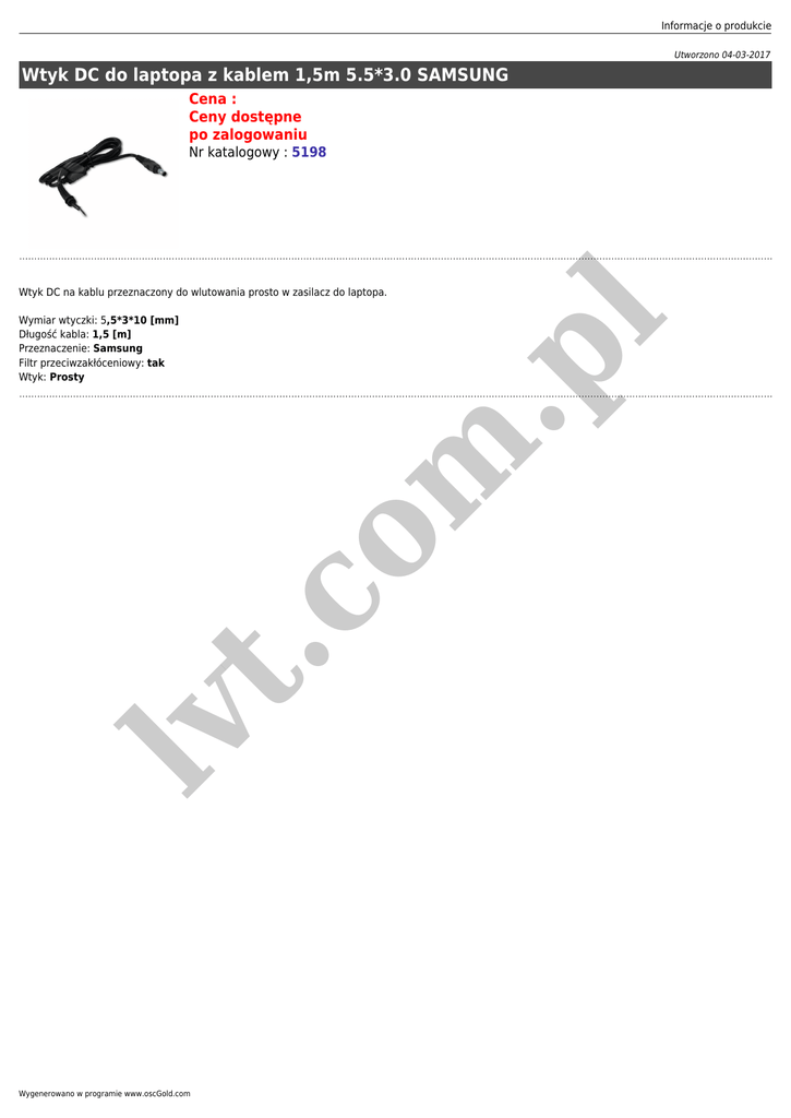 Informacje o produkcie Utworzono 04-03-2017 Wtyk DC do laptopa z kablem 1,5m 5.5*3.0 SAMSUNG Cena : Ceny dostępne po zalogowaniu Nr katalogowy : 5198 m .p lv t. co Wymiar wtyczki: 5,5*3*10 [mm] Długość kabla: 1,5 [m] Przeznaczenie: Samsung Filtr przeciwzakłóceniowy: tak Wtyk: Prosty l Wtyk DC na kablu przeznaczony do wlutowania prosto w zasilacz do laptopa. Wygenerowano w programie www.oscGold.com
