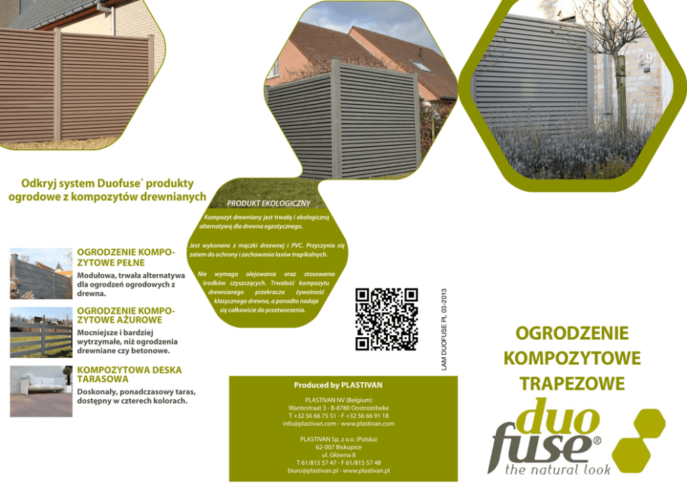 Odkryj system Duofuse® produkty ogrodowe z kompozytów drewnianych PRODUKT EKOLOGICZNY Kompozyt drewniany jest trwałą i ekologiczną alternatywą dla drewna egzotycznego. Jest wykonane z mączki drzewnej i PVC. Przyczynia się zatem do ochrony i zachowania lasów tropikalnych. Modułowa, trwała alternatywa dla ogrodzeń ogrodowych z drewna. OGRODZENIE KOMPOZYTOWE AŻUROWE Nie wymaga olejowania oraz stosowania środków czyszczących. Trwałość kompozytu drewnianego przekracza żywotność klasycznego drewna, a ponadto nadaje się całkowicie do przetworzenia. Mocniejsze i bardziej wytrzymałe, niż ogrodzenia drewniane czy betonowe. KOMPOZYTOWA DESKA TARASOWA Doskonały, ponadczasowy taras, dostępny w czterech kolorach. Produced by PLASTIVAN PLASTIVAN NV (Belgium) Wantestraat 3 - B-8780 Oostrozebeke T +32 56 66 75 51 - F +32 56 66 91 18 [email protected] - www.plastivan.com PLASTIVAN Sp. z o.o. (Polska) 62-007 Biskupice ul. Główna 8 T 61/815 57 47 - F 61/815 57 48 [email protected] - www.plastivan.pl LAM DUOFUSE PL 03-2013 OGRODZENIE KOMPOZYTOWE PEŁNE OGRODZENIE KOMPOZYTOWE TRAPEZOWE DUOFUSE® KOMPOZYT DREWNIANY OGRODZENIE KOMPOZYTOWE TRAPEZOWE ZALETY KOMPOZYTÓW DREWNIANYCH • Ekologiczny i nadający się do przetworzenia. • Łatwe w czyszczeniu i montażu. • Powierzchnia szczotkowana, odporna na poślizg. • Nie gniją nie pęcznieją, nie pękają ani nie rozwarstwiają się. • Przebarwiają się nieznacznie, zachowują pierwotny wygląd. ZALETY SYSTEMU OGRODZEŃ TRAPEZOWYCH Nowoczesny system ogrodzeniowypołączenie estetyki z trwałością. Silniejsze i bardziej trwałe niż ogrodzenie drewniane. Modułowe i wszechstronne zastosowanie: • Zakres wysokości od 20 cm-200 cm. • Montaż do słupka możliwy w 4 kierunkach dzięki profilowi u-kształtny. • Standardowa długość deski to 200cm, mogą być cięte na długości. Może być zastosowany jako ogrodzenie ogrodu lub do budowy podniesionych grządek, pergoli lub jako materiał do budowy wiat, altan, płotów czy magazynków ogrodowych. ASORTYMENT I WYMIARY • Kolory: tropikalny brąz, grafit oraz kamienno szary. • Całkowita grubość deski: 4,0cm. • Deski wzmocnione stalowym profilem: 20 x 4,0 x 200cm. • Profil u-kształtny (używany do desek): 4,0 x 5,5 x 202cm. • Duży profil u-kształtny (używany przy płycie z betonu): 4,2 x 3,5 x 182cm. • Słupek ogrodzeniowy (z aluminiowym wzmocnieniem) 9 x 9 x 270 / 300cm. • Stopka słupka: do niewidocznego montażu na płycie betonowej lub w betonie. • Daszek słupka: 11 x 11 x 1,7cm. • Profil u-kształtny (używany do desek): 4,0 x 5,5 x 202cm. • Duży profil u-kształtny (używany przy płycie z betonu): 4,2 x 3,5 x 182cm. • Profil u-kształtny może być użyty również jako profil wykończeniowy. • Profile powinny być zamontowane do słupa za pomocą wkrętów ze stali nierdzewnej. • Gwarancja 10-letnia obejmuje wszystkie właściwości mechaniczne oraz odporność na działanie owadów. KONSERWACJA Nie wymaga specjalnych środków czyszczących. W przypadku, gdy płot zostałby wystawiony na działanie opadów atmosferycznych, mogą pojawić się zacieki z wody. Jest to proces tymczasowy. Po pewnym czasie proces zatrzymuje się i całkowicie ustępuje. Można czyścić wodą pod wysokim ciśnieniem (maks. 80 barów) lub przy pomocy zwykłych domowych środków czyszczących. W przypadku trwałego zabrudzenia zaleca się użycia rozcieńczonego wybielacza, a następnie zabrudzone miejsce należy spłukać dużą ilością wody. Nie używać rozpuszczalników! Więcej informacji, dane techniczne, warunki gwarancji i szczegółowa instrukcja montażu na stronie: www.taraskompozytowy.pl Ciepło i wygląd litego drewna w połączeniu z unikalnymi właściwościami tworzywa sztucznego.