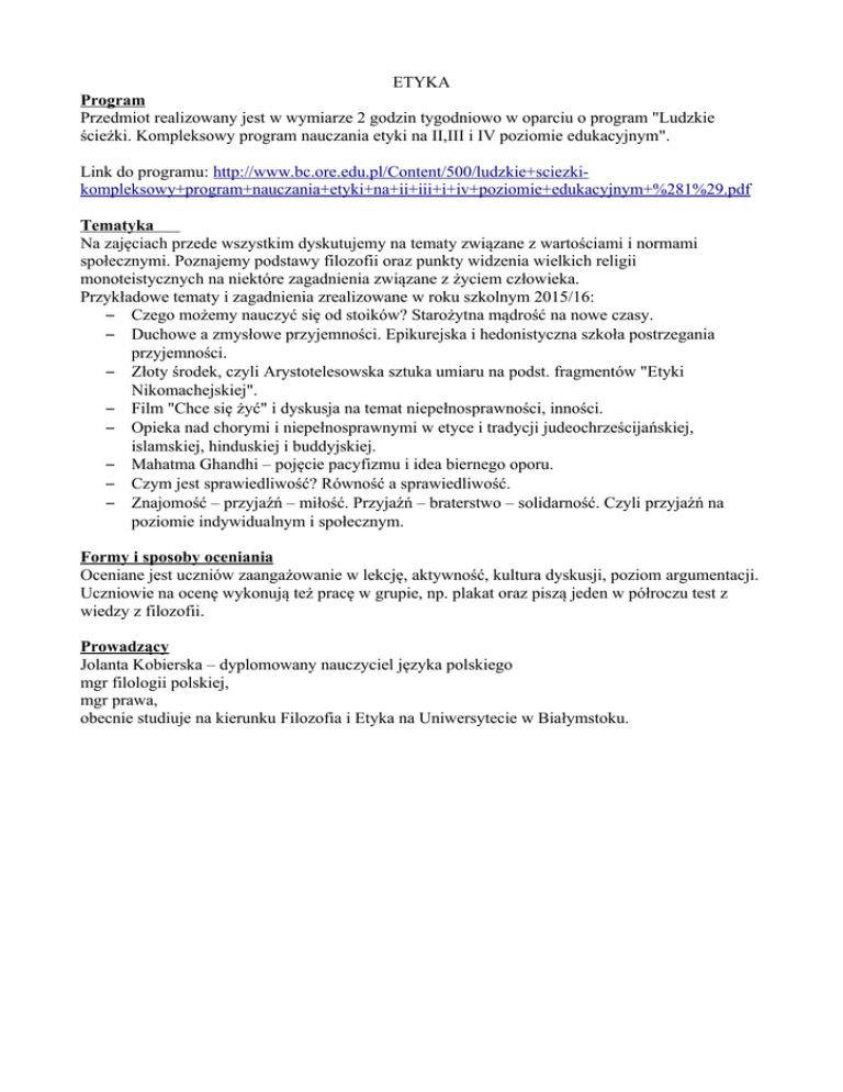 ETYKA Program Przedmiot realizowany jest w wymiarze 2 godzin tygodniowo w oparciu o program "Ludzkie ścieżki. Kompleksowy program nauczania etyki na II,III i IV poziomie edukacyjnym". Link do programu: http://www.bc.ore.edu.pl/Content/500/ludzkie+sciezkikompleksowy+program+nauczania+etyki+na+ii+iii+i+iv+poziomie+edukacyjnym+%281%29.pdf Tematyka Na zajęciach przede wszystkim dyskutujemy na tematy związane z wartościami i normami społecznymi. Poznajemy podstawy filozofii oraz punkty widzenia wielkich religii monoteistycznych na niektóre zagadnienia związane z życiem człowieka. Przykładowe tematy i zagadnienia zrealizowane w roku szkolnym 2015/16: – Czego możemy nauczyć się od stoików? Starożytna mądrość na nowe czasy. – Duchowe a zmysłowe przyjemności. Epikurejska i hedonistyczna szkoła postrzegania przyjemności. – Złoty środek, czyli Arystotelesowska sztuka umiaru na podst. fragmentów "Etyki Nikomachejskiej". – Film "Chce się żyć" i dyskusja na temat niepełnosprawności, inności. – Opieka nad chorymi i niepełnosprawnymi w etyce i tradycji judeochrześcijańskiej, islamskiej, hinduskiej i buddyjskiej. – Mahatma Ghandhi – pojęcie pacyfizmu i idea biernego oporu. – Czym jest sprawiedliwość? Równość a sprawiedliwość. – Znajomość – przyjaźń – miłość. Przyjaźń – braterstwo – solidarność. Czyli przyjaźń na poziomie indywidualnym i społecznym. Formy i sposoby oceniania Oceniane jest uczniów zaangażowanie w lekcję, aktywność, kultura dyskusji, poziom argumentacji. Uczniowie na ocenę wykonują też pracę w grupie, np. plakat oraz piszą jeden w półroczu test z wiedzy z filozofii. Prowadzący Jolanta Kobierska – dyplomowany nauczyciel języka polskiego mgr filologii polskiej, mgr prawa, obecnie studiuje na kierunku Filozofia i Etyka na Uniwersytecie w Białymstoku.